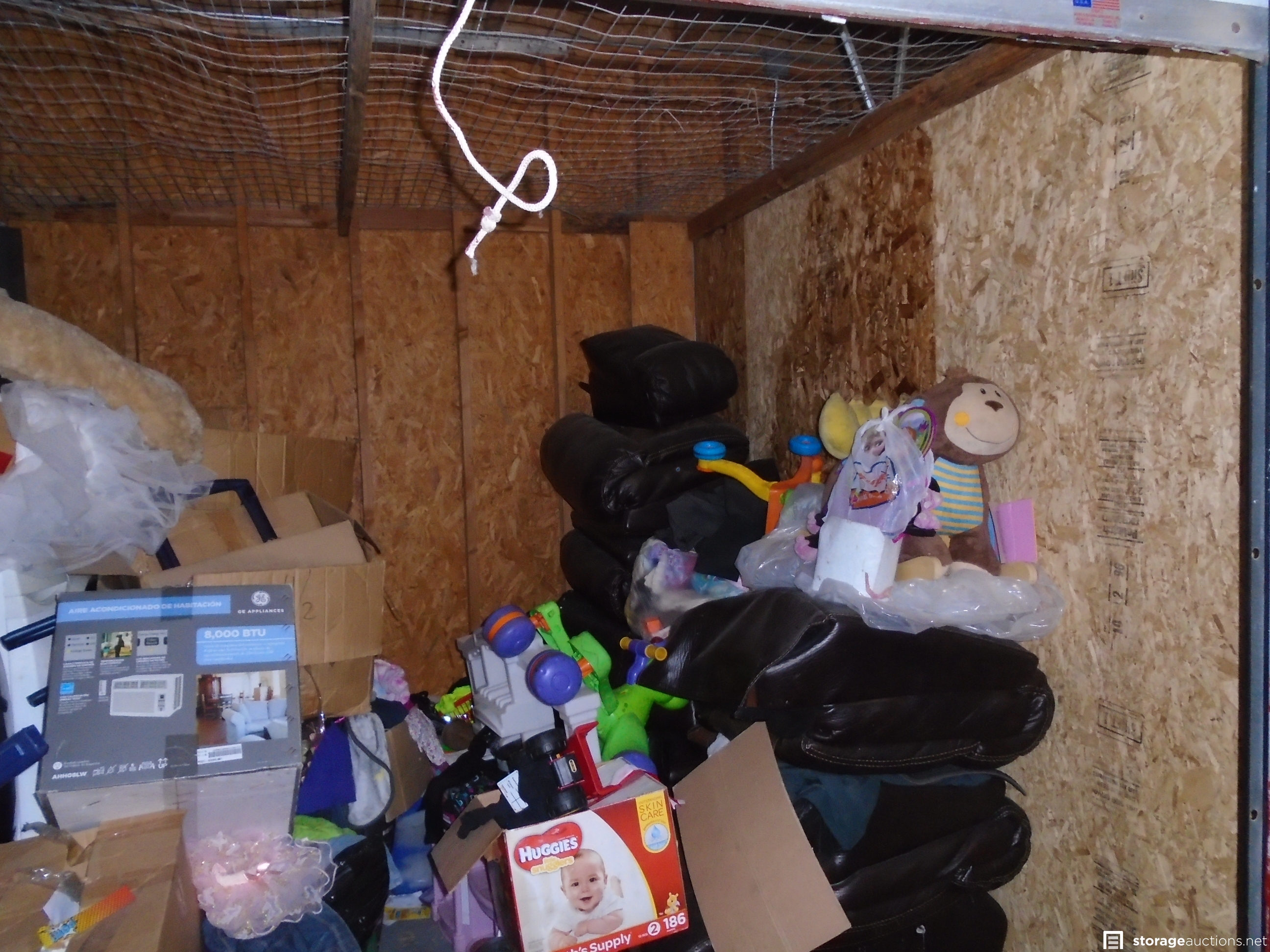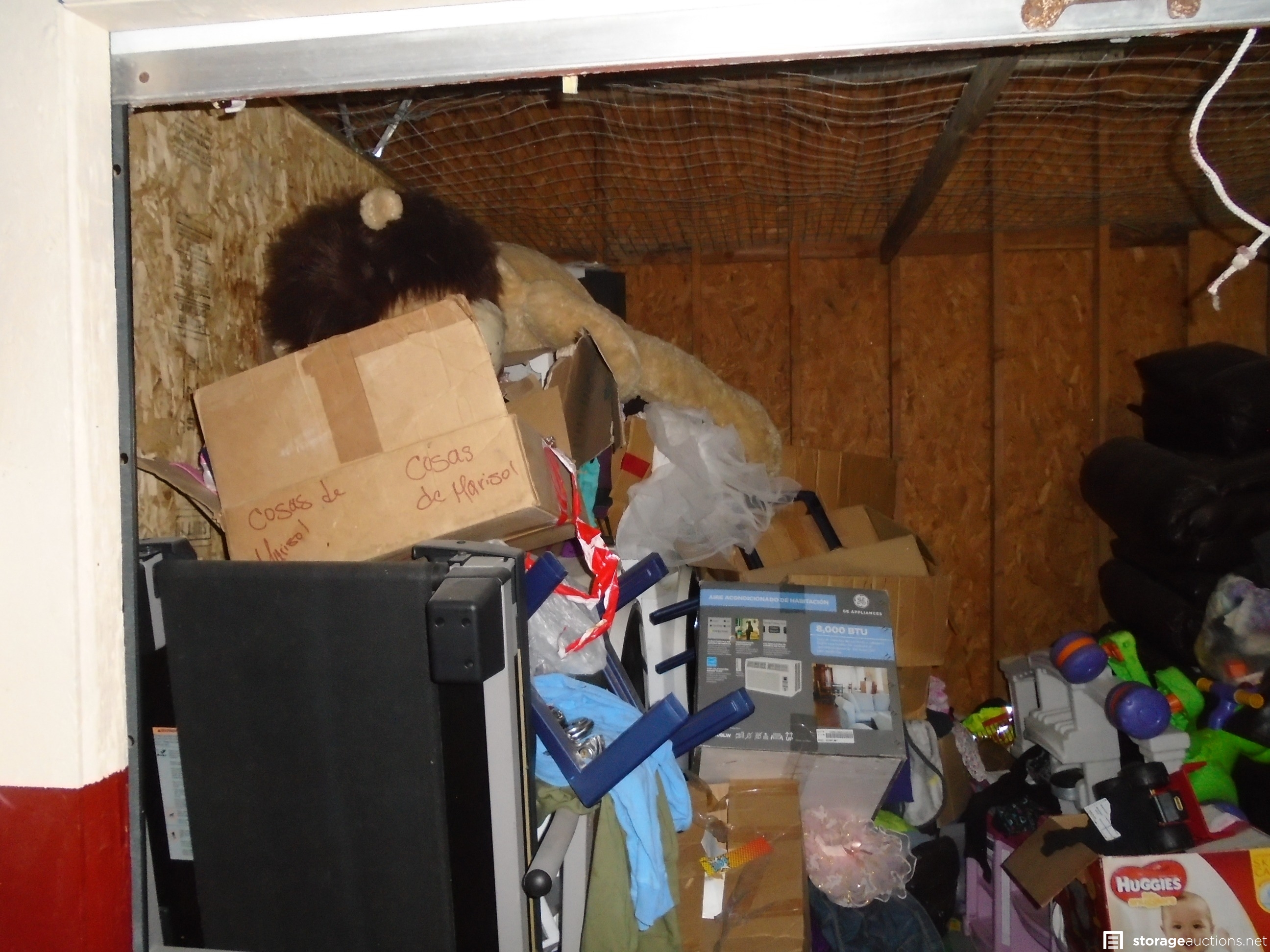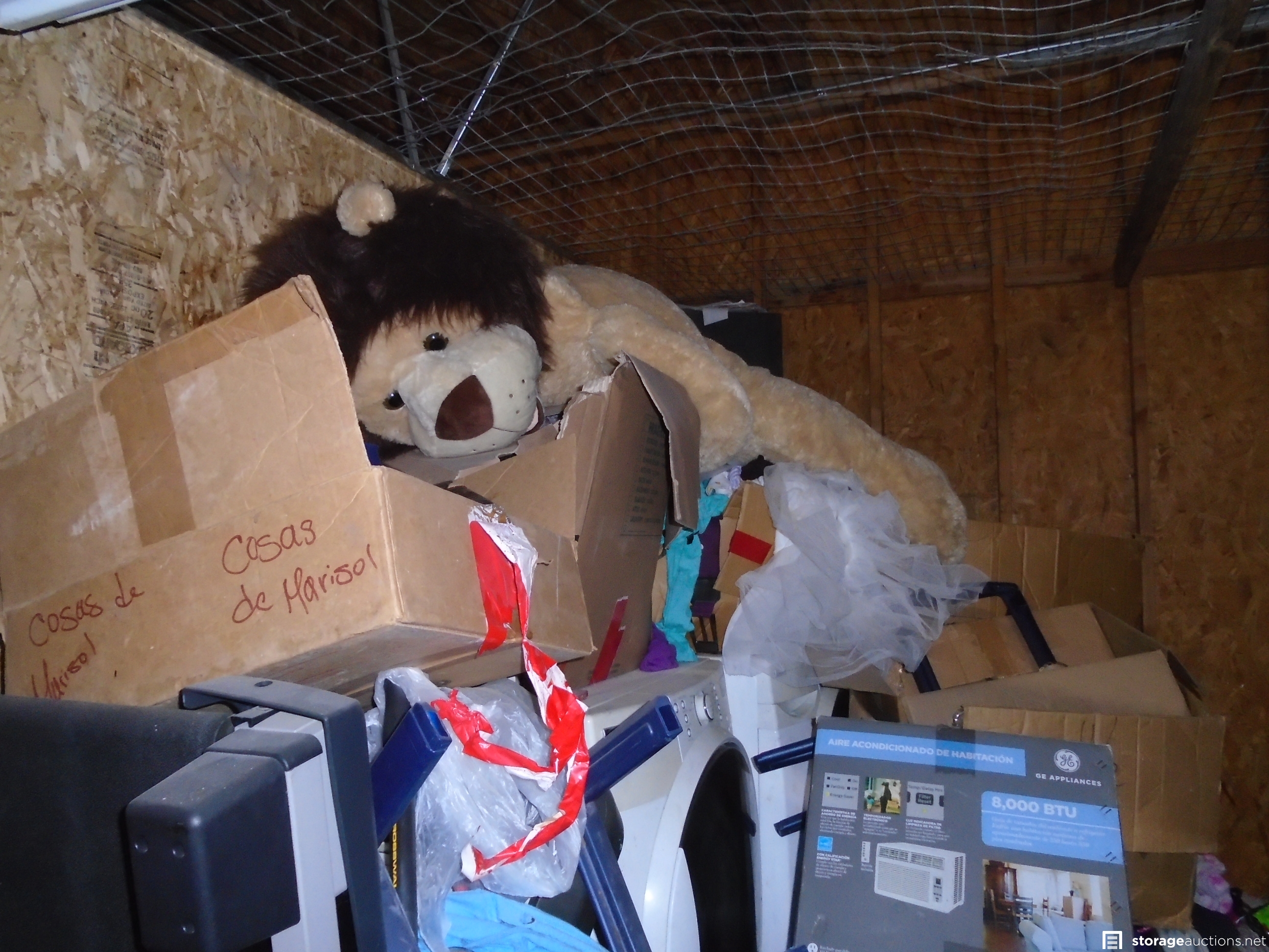 Unit appears to contain: Front Load Washer and Dryer ,boxes, toys, compressors, stove, speakers, tread Mill, sofa