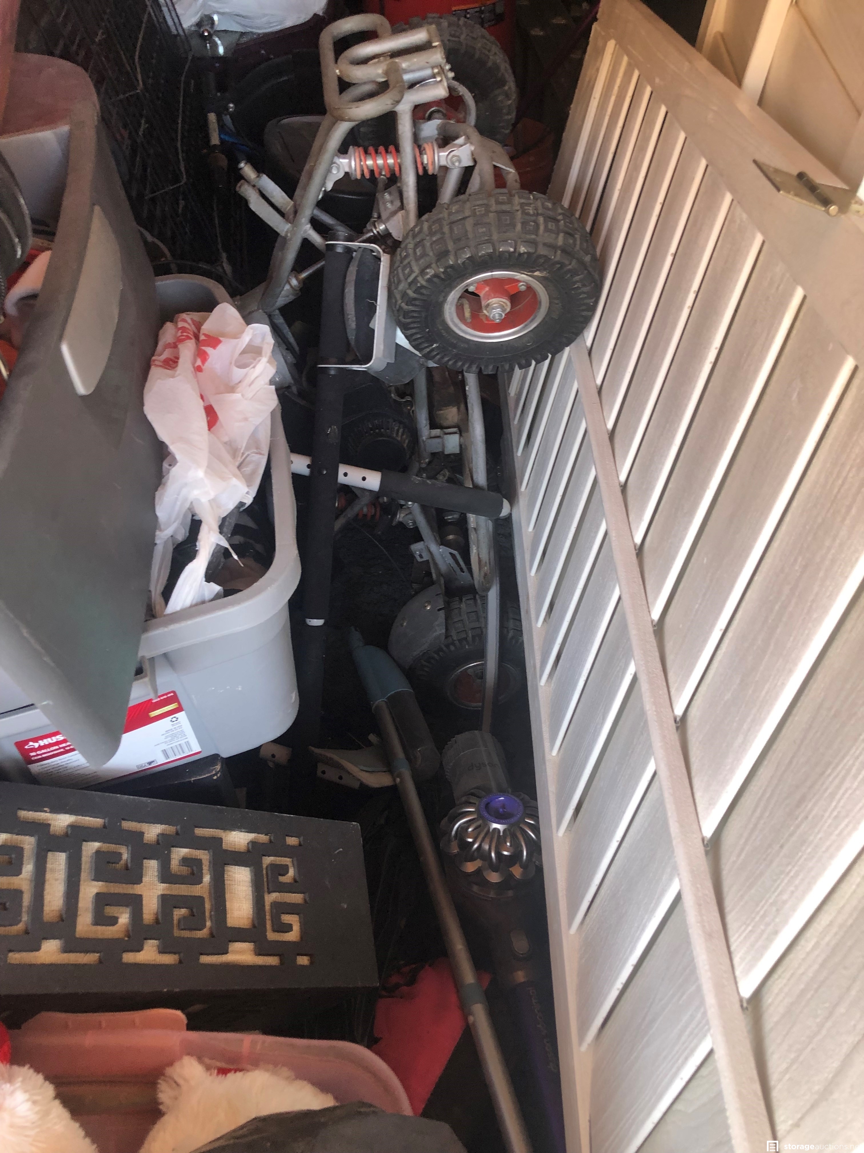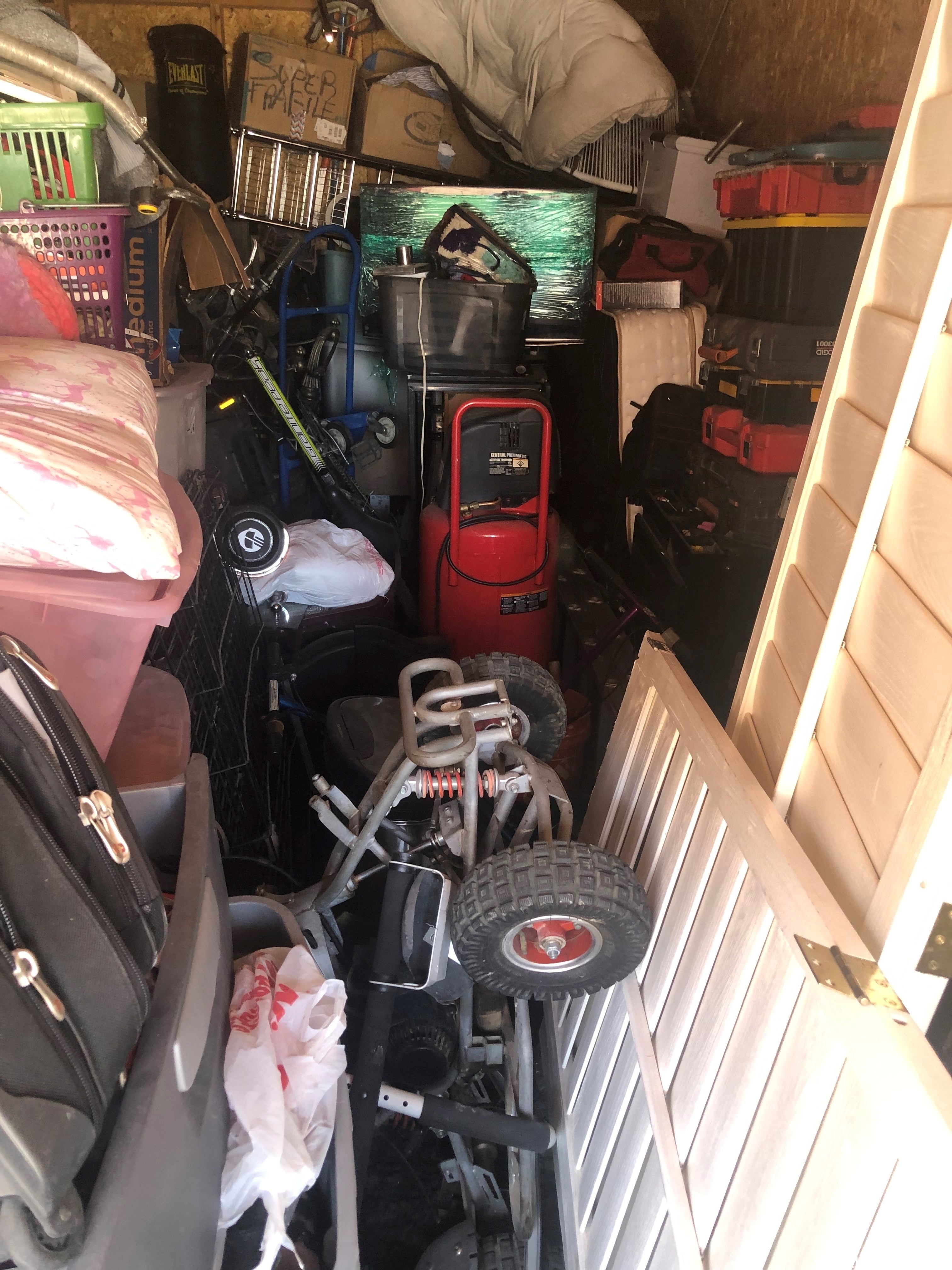 UNIT APPEARS TO CONTAIN: Guitar, 4 Wheeler, Compressor, Dolley, Bike, Tool boxes, Charis, Dart Boards, Dyson, Pipe Benders, 20-30 Containers, Ext Ladder