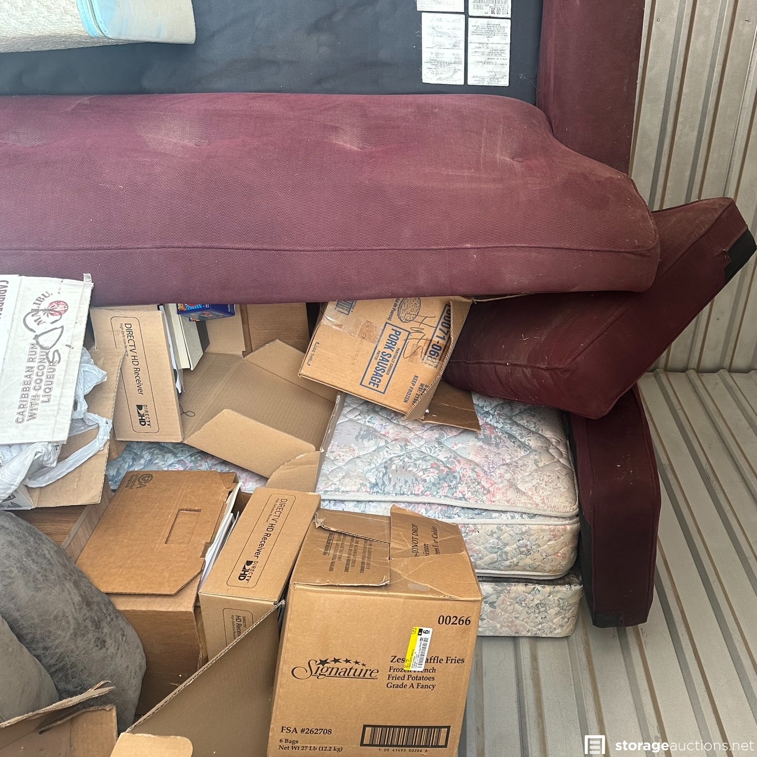 furniture (couch, possibly leather recliner, bedframe), mattresses, filtered water dispenser, various household goods