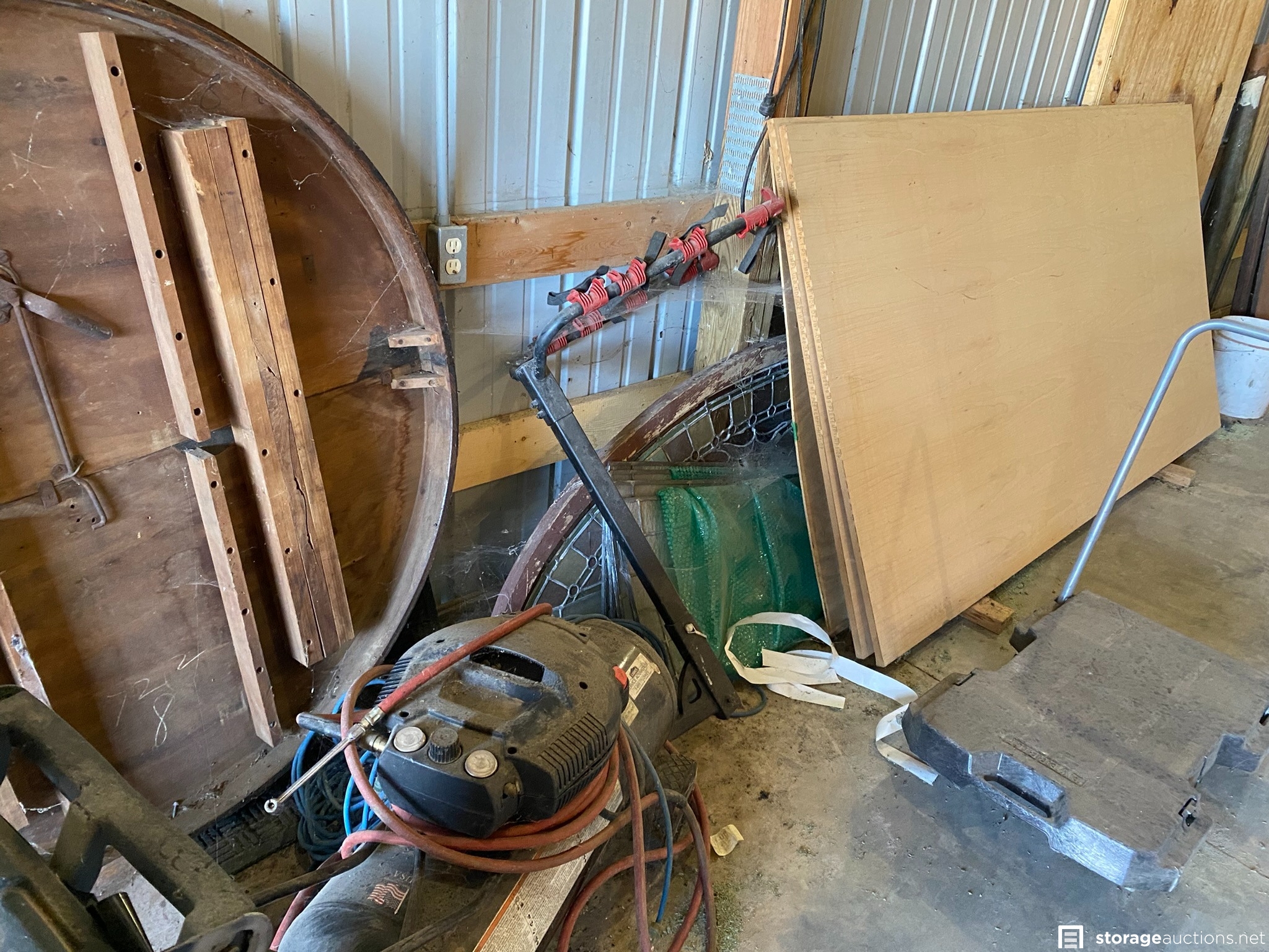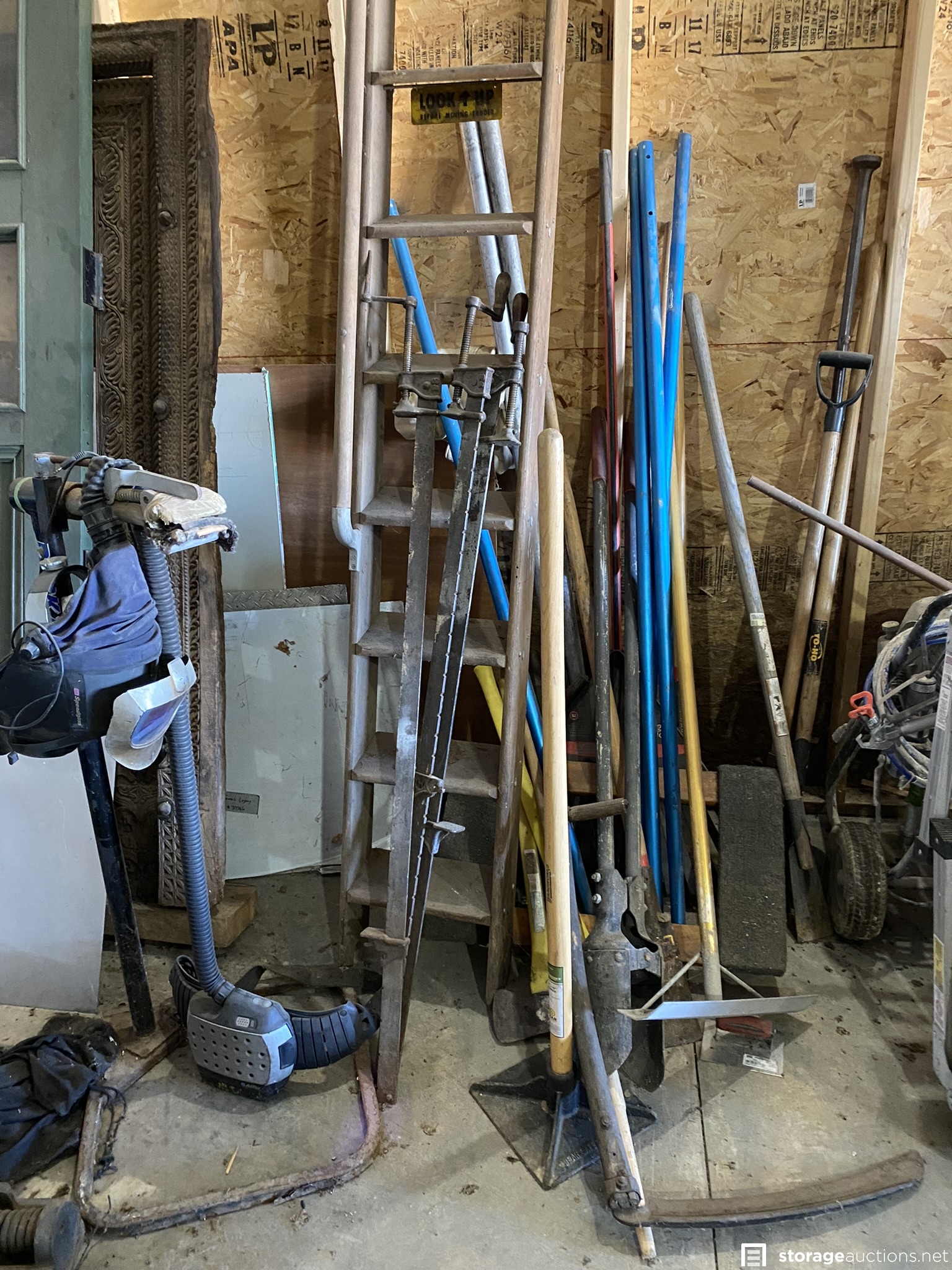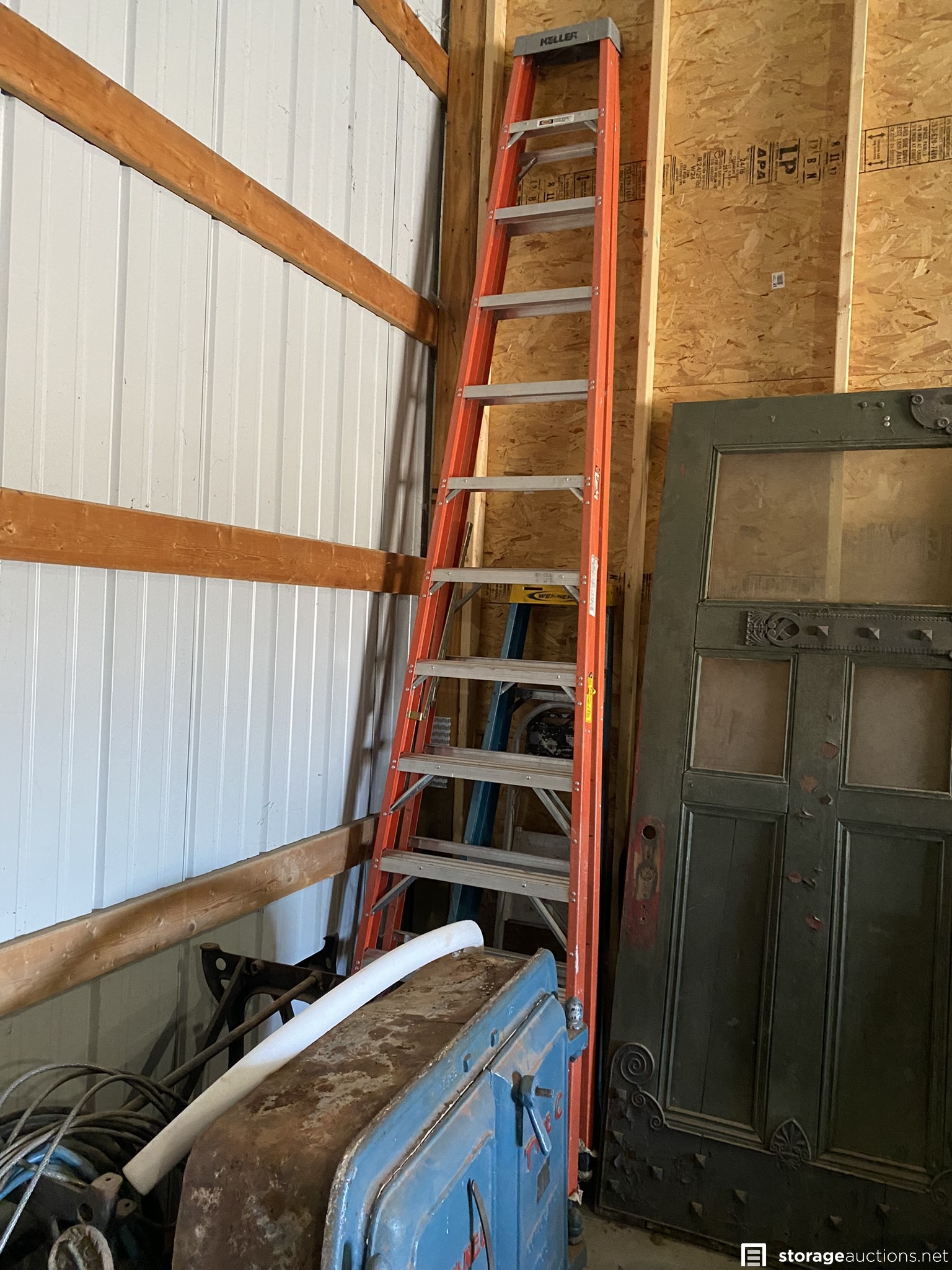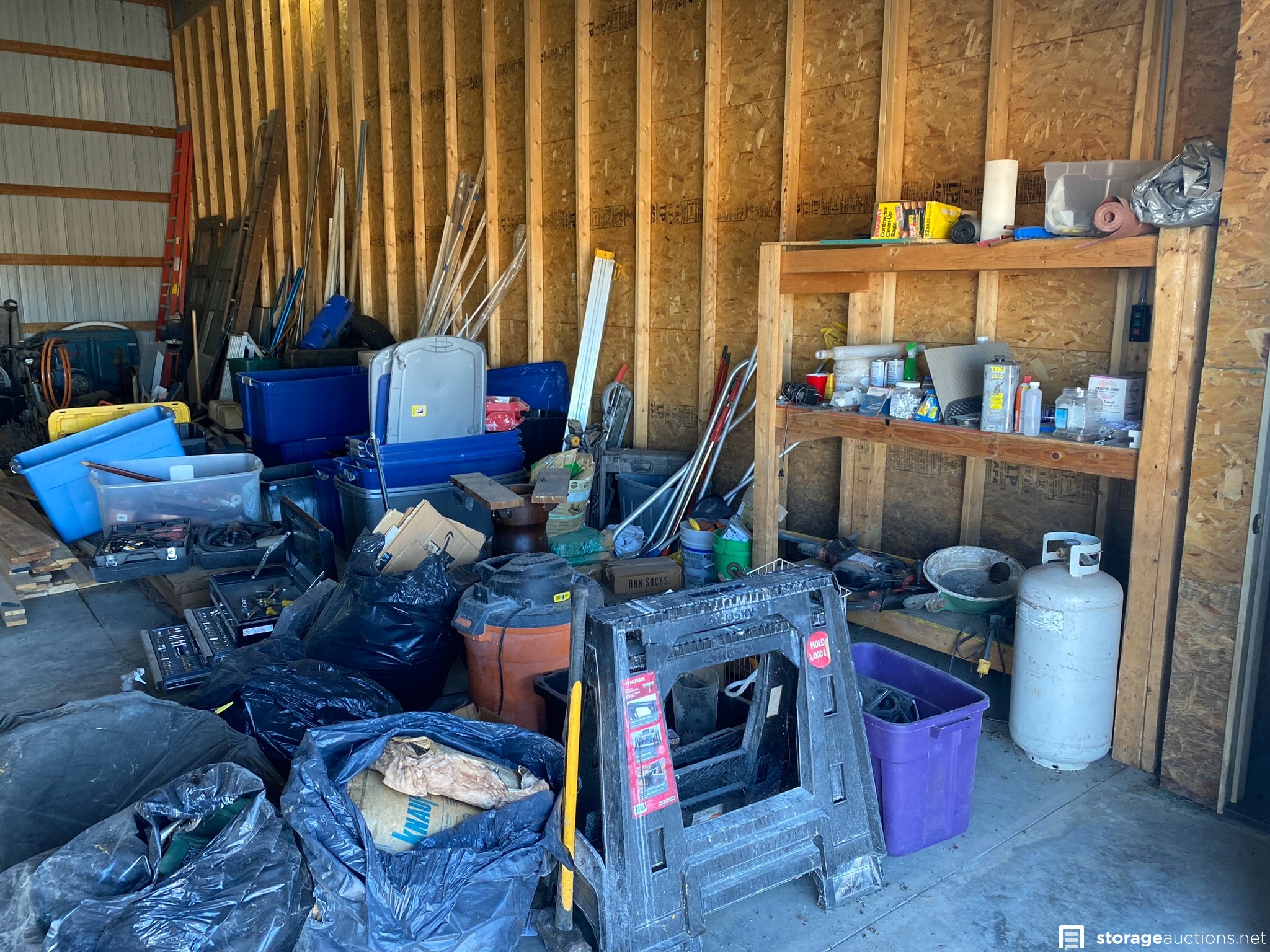 Contractor bay full of tools, materials, and lot of antiques. Some of the items are Kawasaki propane sander, Keller and Werner ladders, extension cords, metal desk/table, downhill skis, various construction equipment and tools, doors, fans, Kewanee boiler, rooftop carrier, PVC pipes, totes, dollies, air compressor, lots of wood in various sizes, shop vac, heavy duty saw horses, tool boxes, antiques, mountain bike, tires, and many other items.