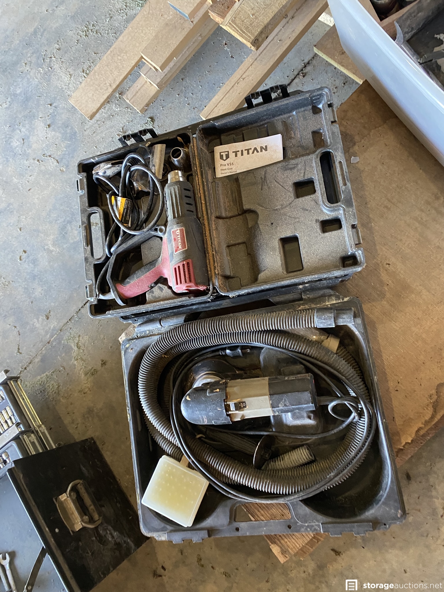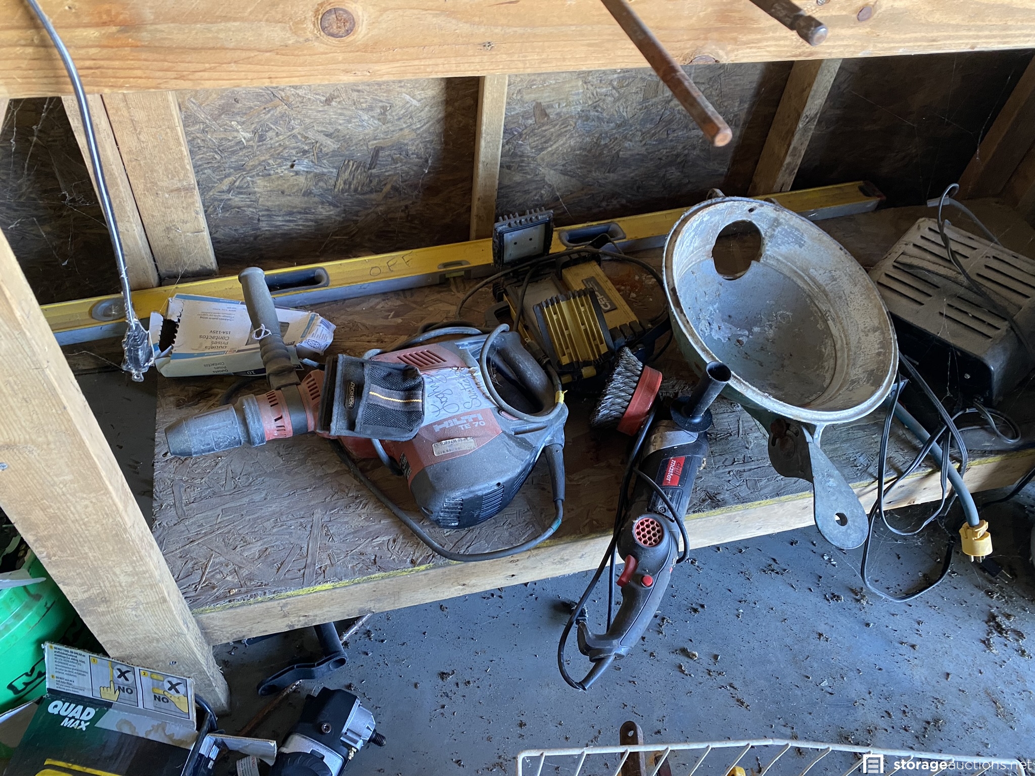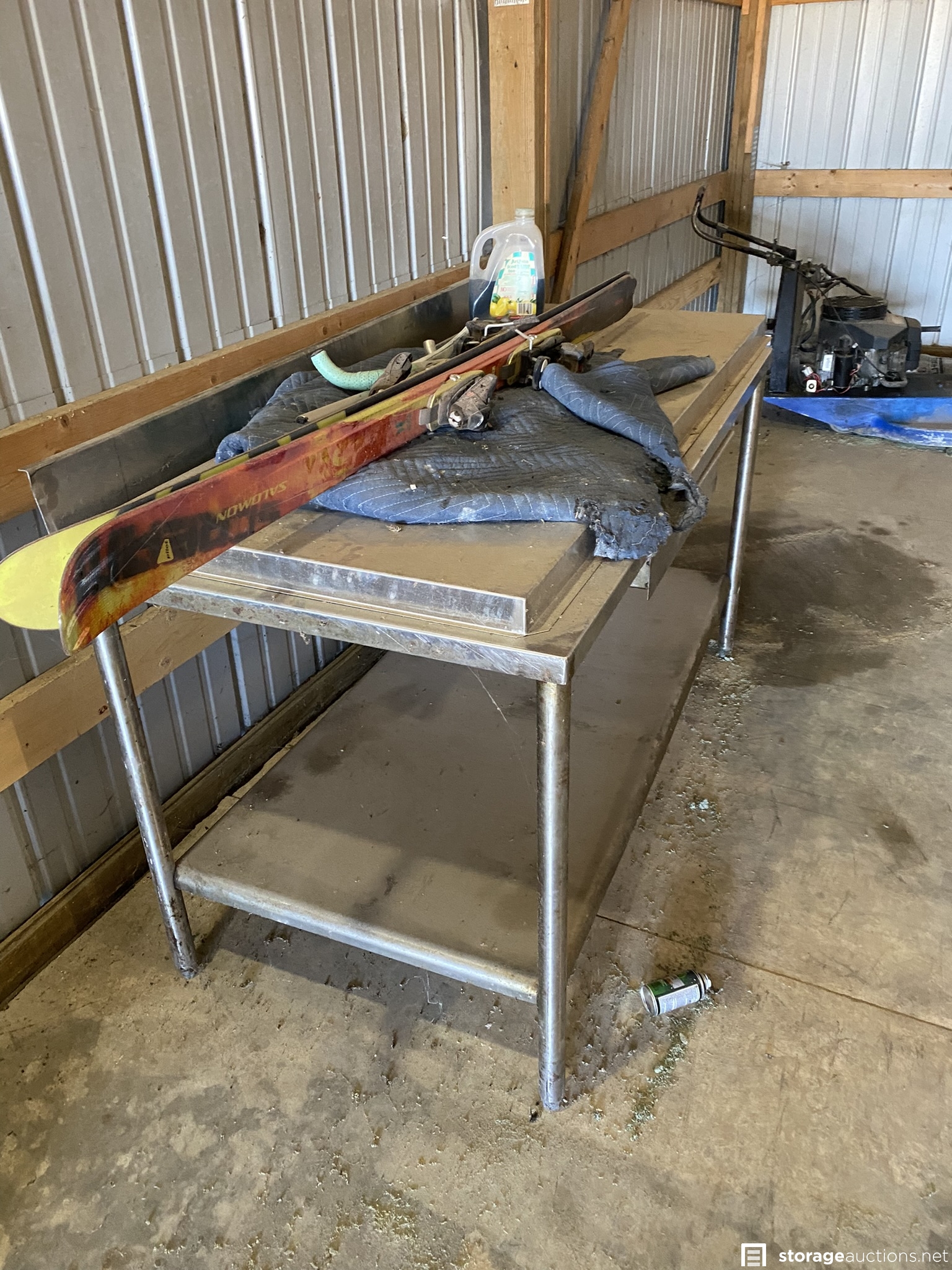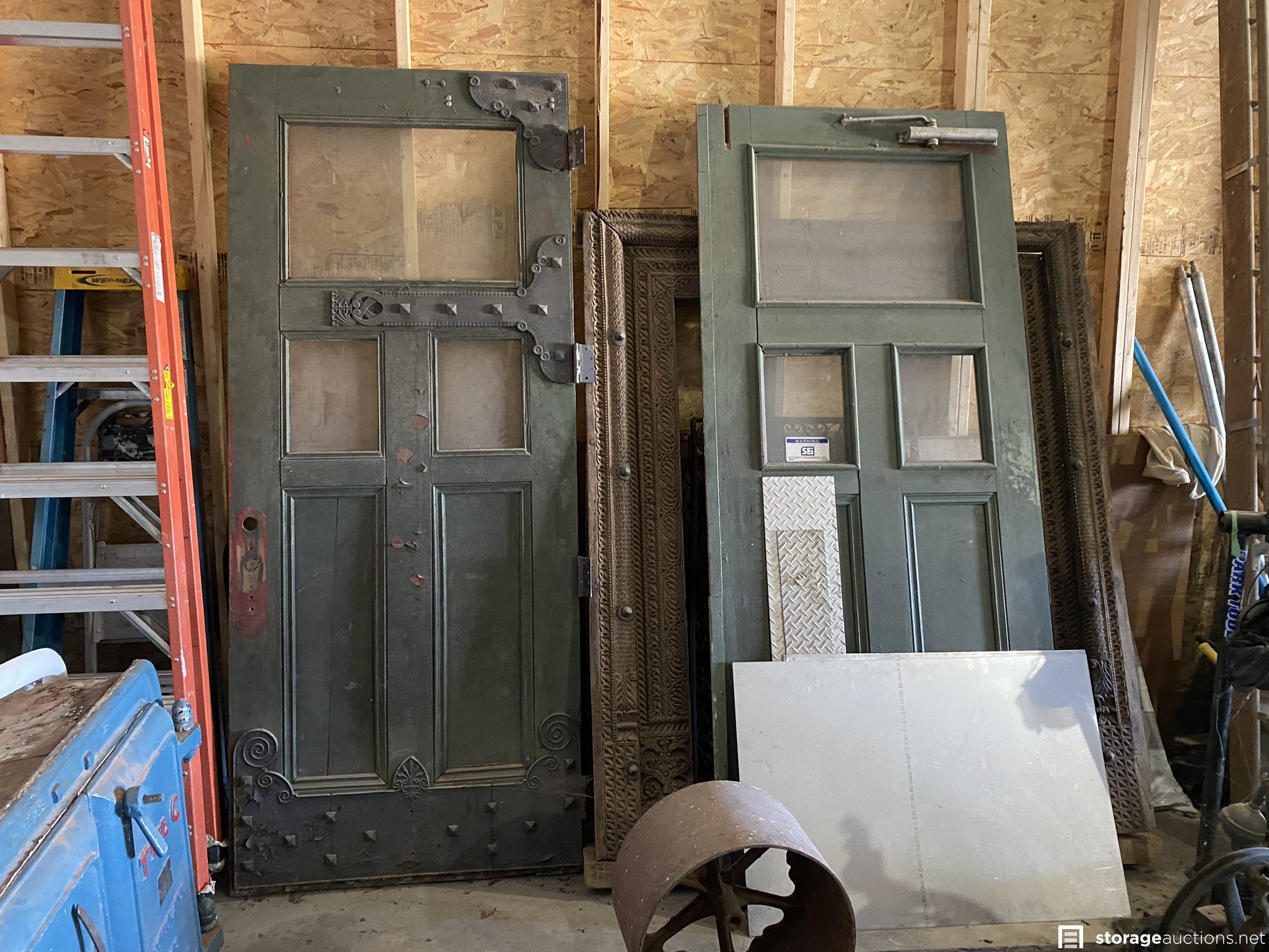 Contractor bay full of tools, materials, and lot of antiques. Some of the items are Kawasaki propane sander, Keller and Werner ladders, extension cords, metal desk/table, downhill skis, various construction equipment and tools, doors, fans, Kewanee boiler, rooftop carrier, PVC pipes, totes, dollies, air compressor, lots of wood in various sizes, shop vac, heavy duty saw horses, tool boxes, antiques, mountain bike, tires, and many other items.