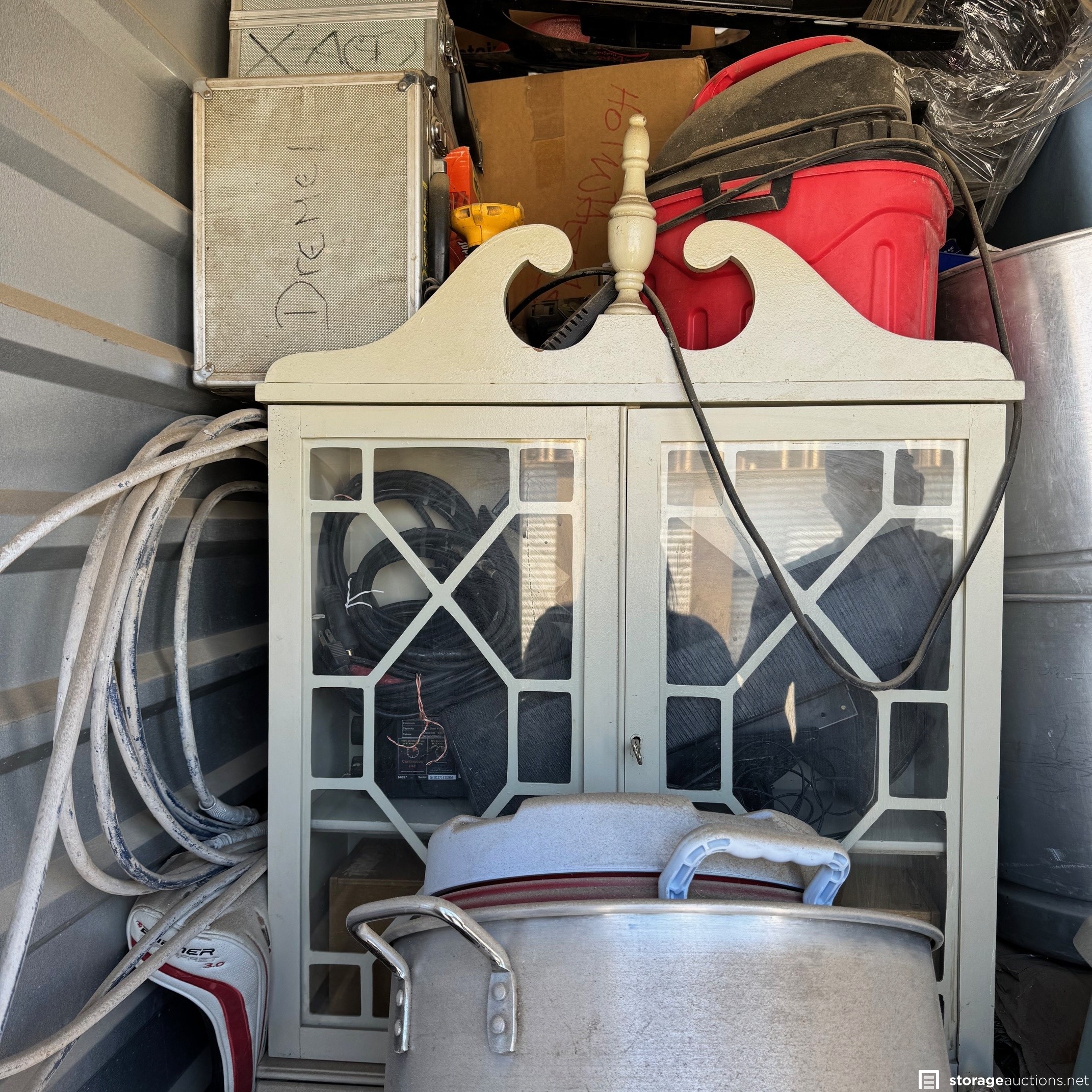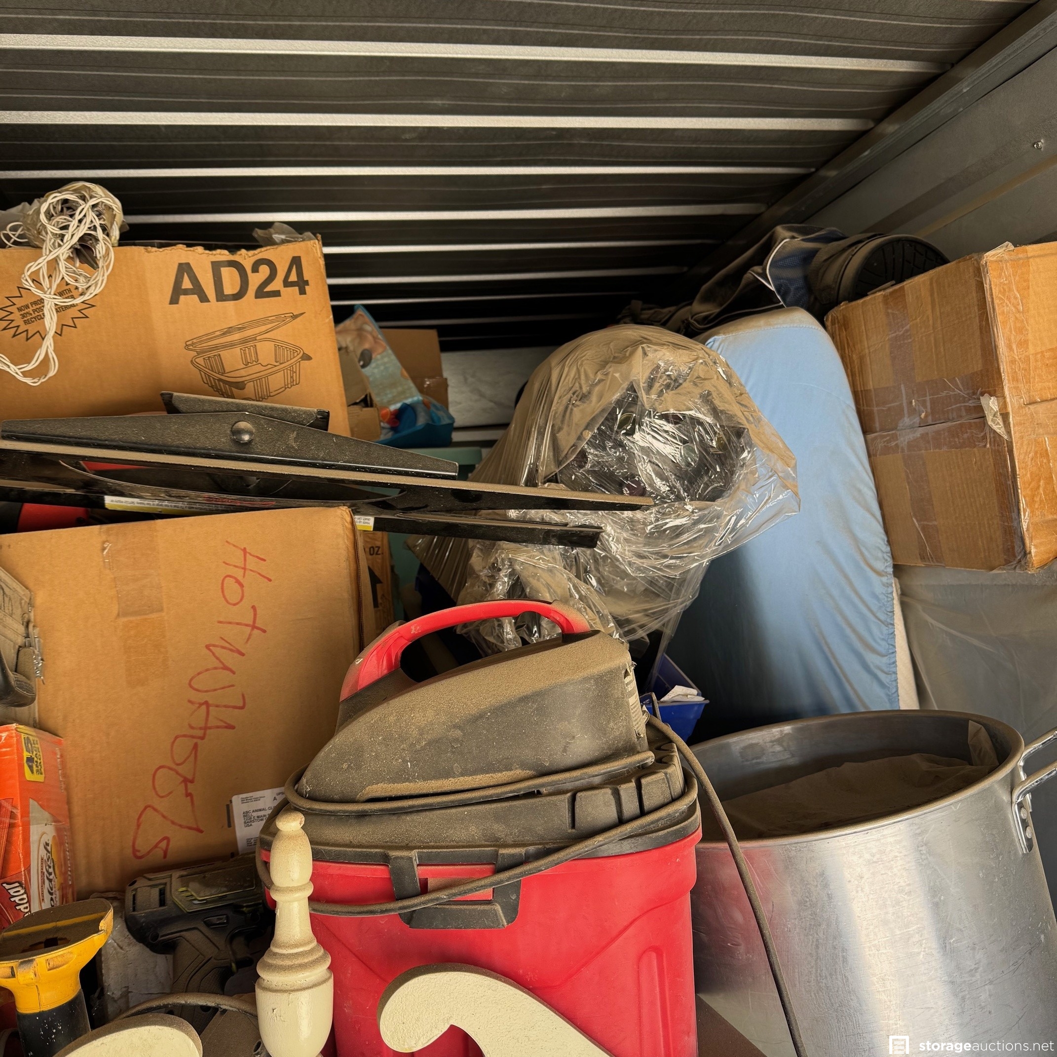 Unit appears to have aluminum stock pots, bookcase, welder, shop vac, tools, disco light, golf bag & club, and misc boxes.