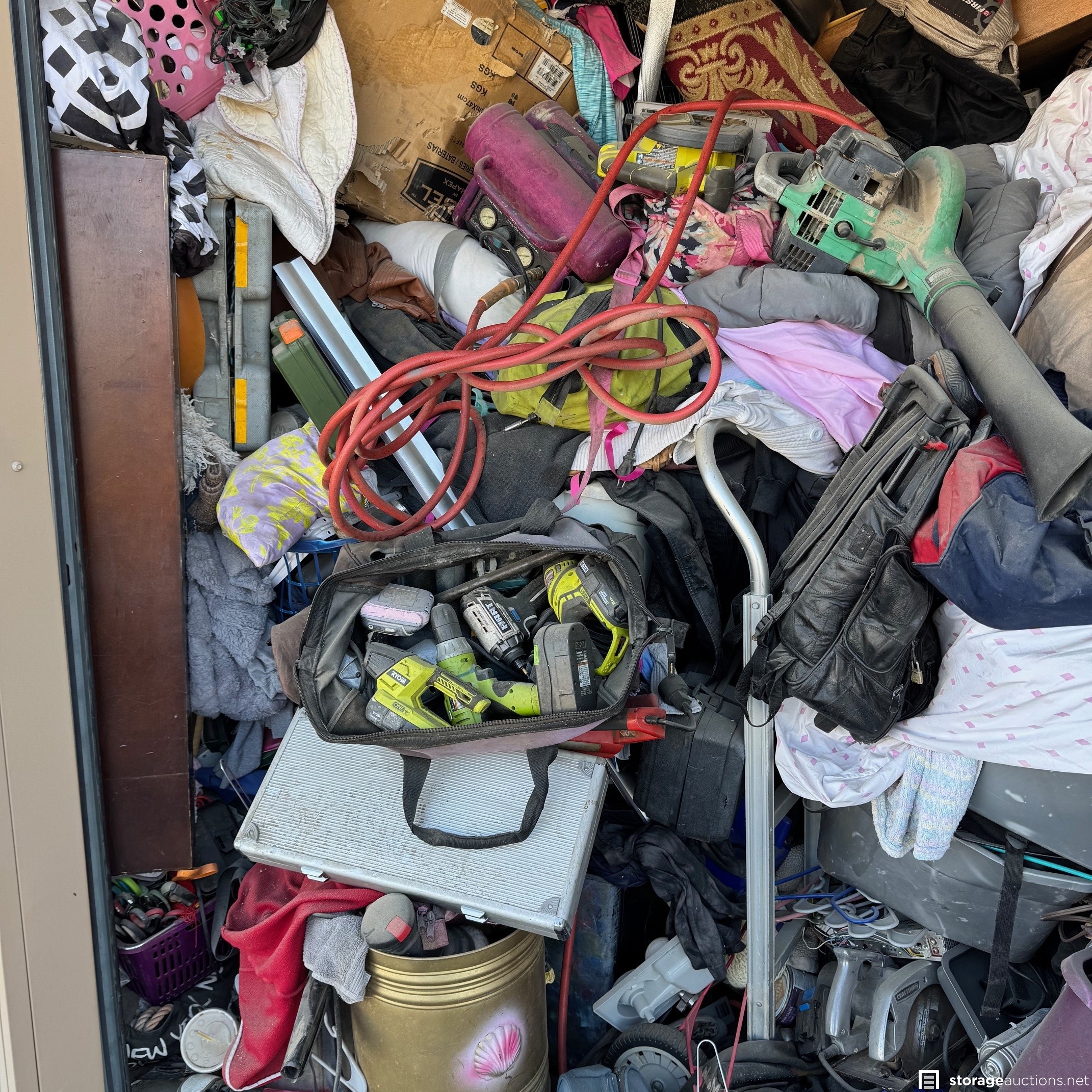 Unit appears to have power tools, skill saw, blower, guitar, misc. household items, rug, and battery charger