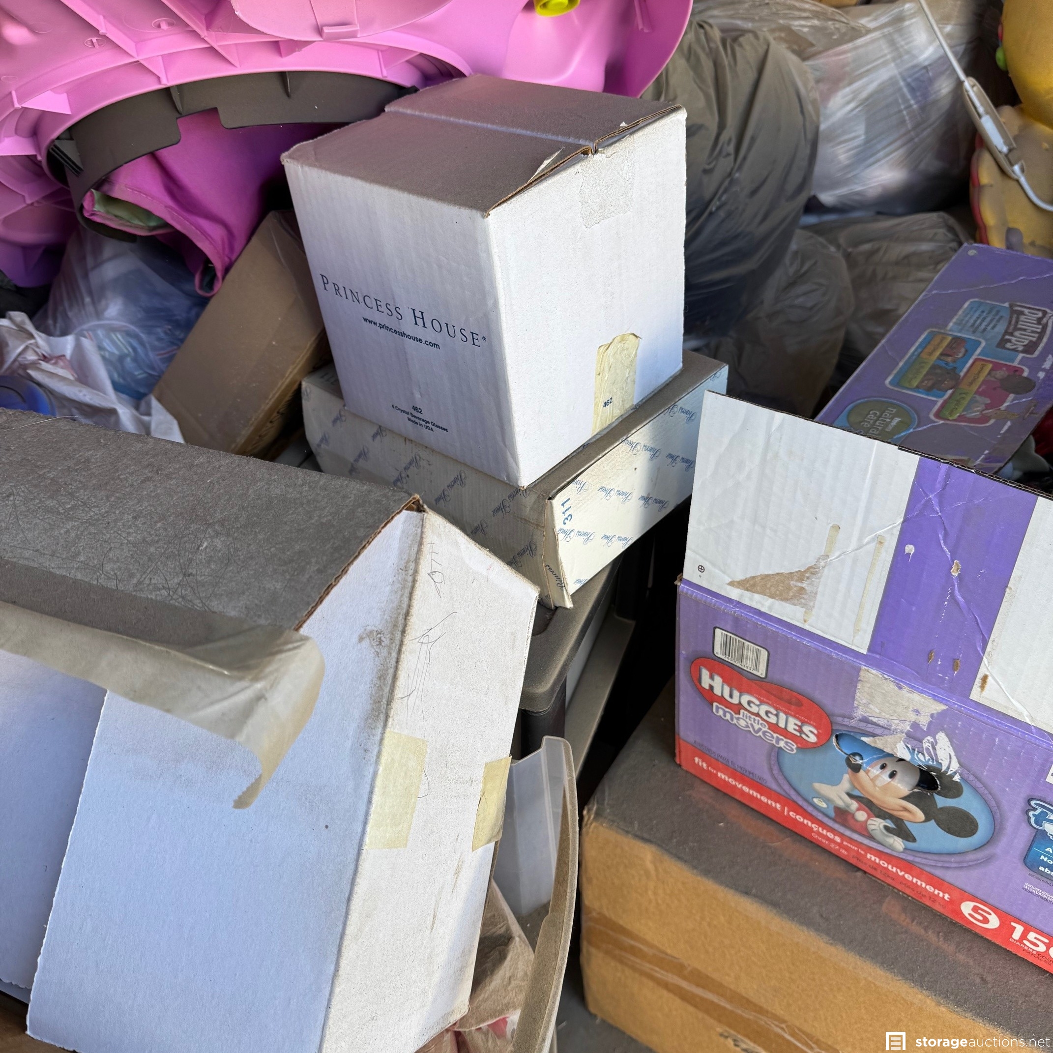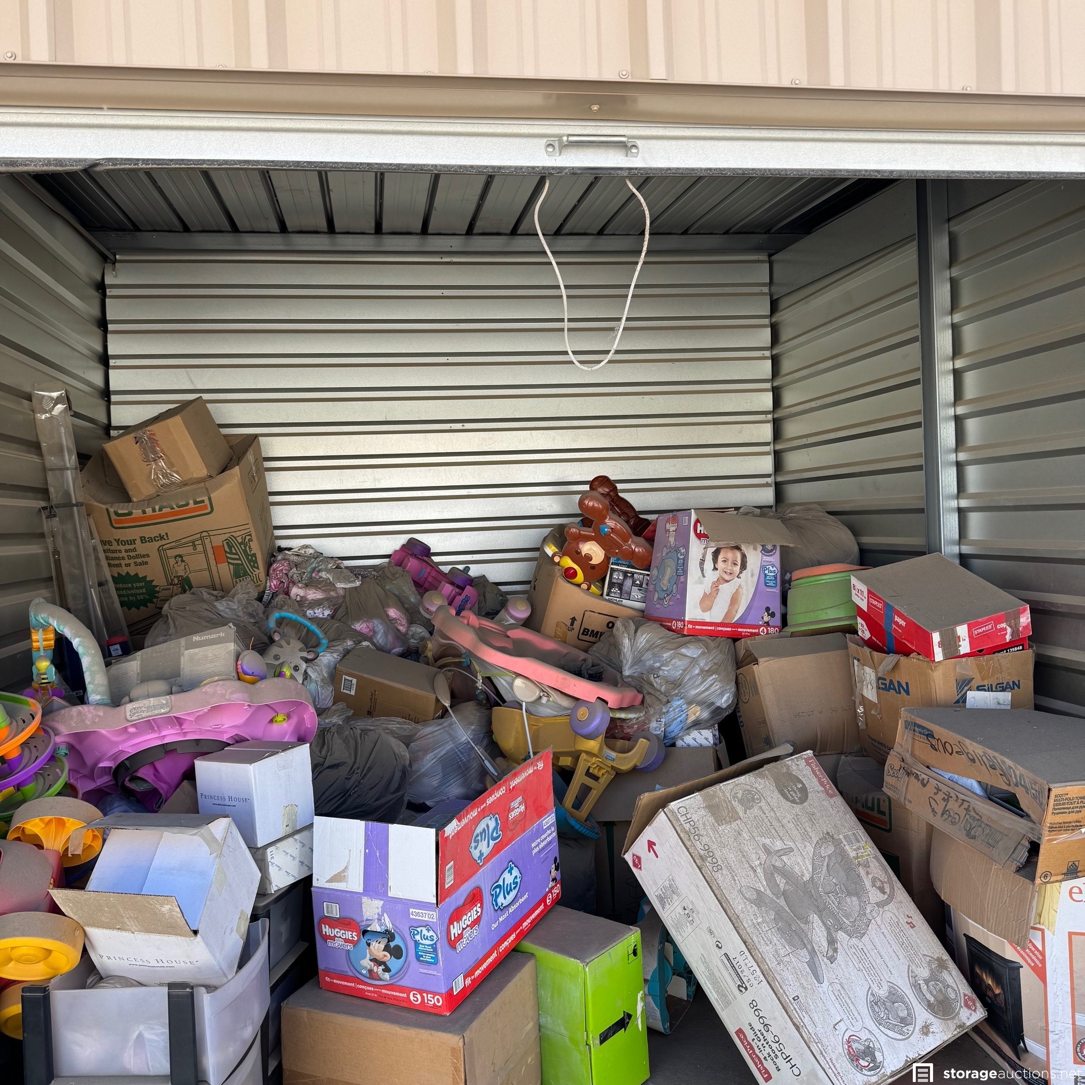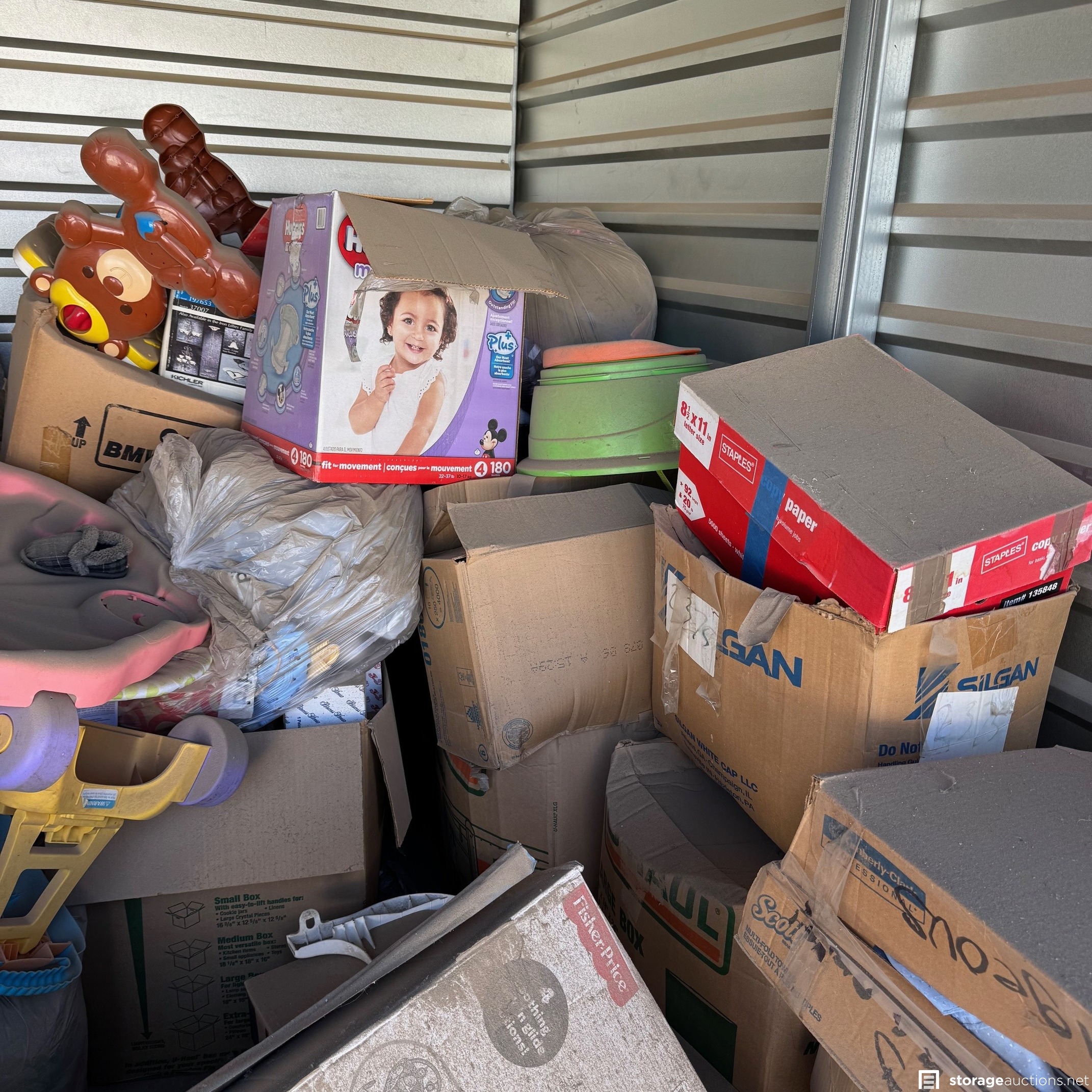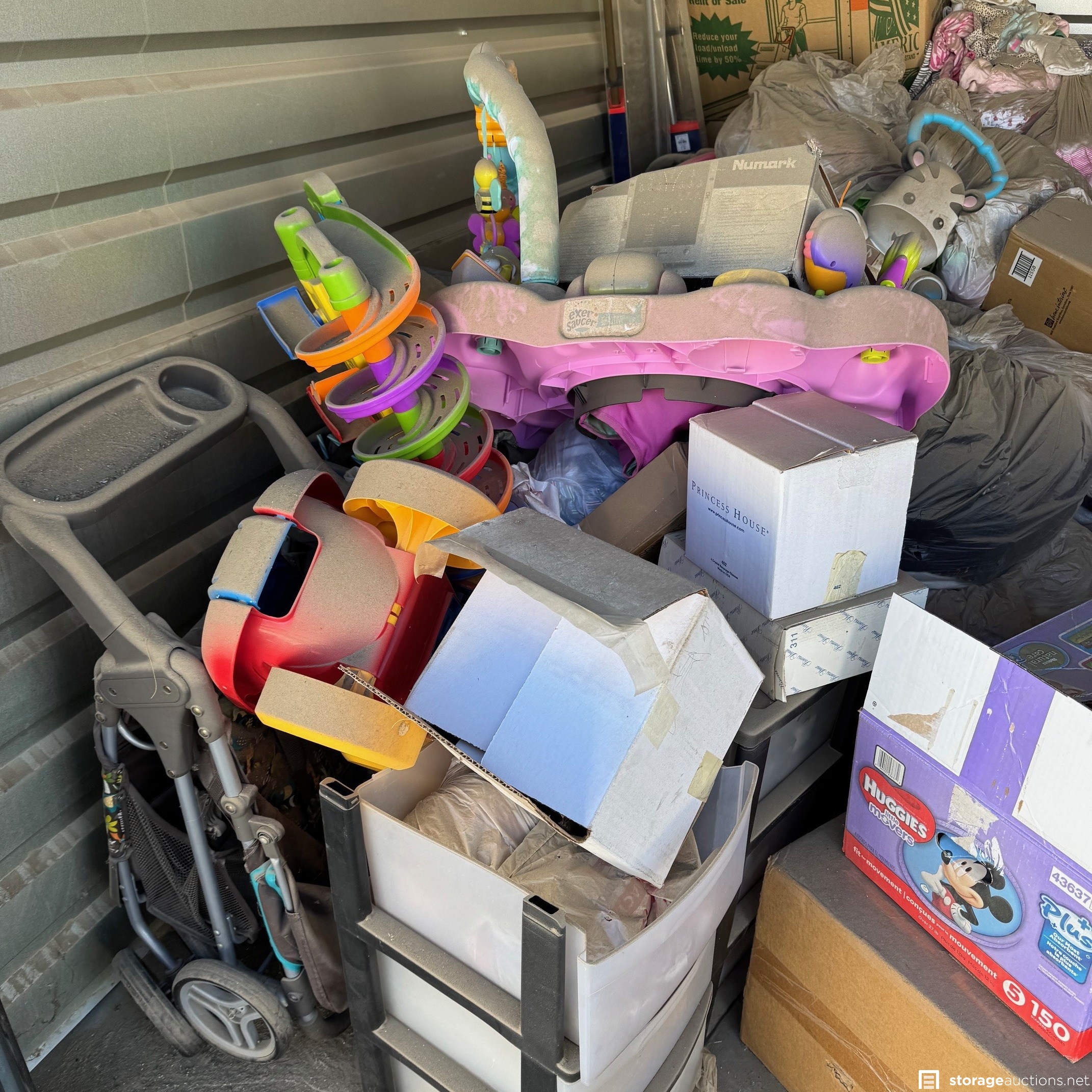 Unit appears to have baby clothes, kids toys, stroller, and other misc. boxes