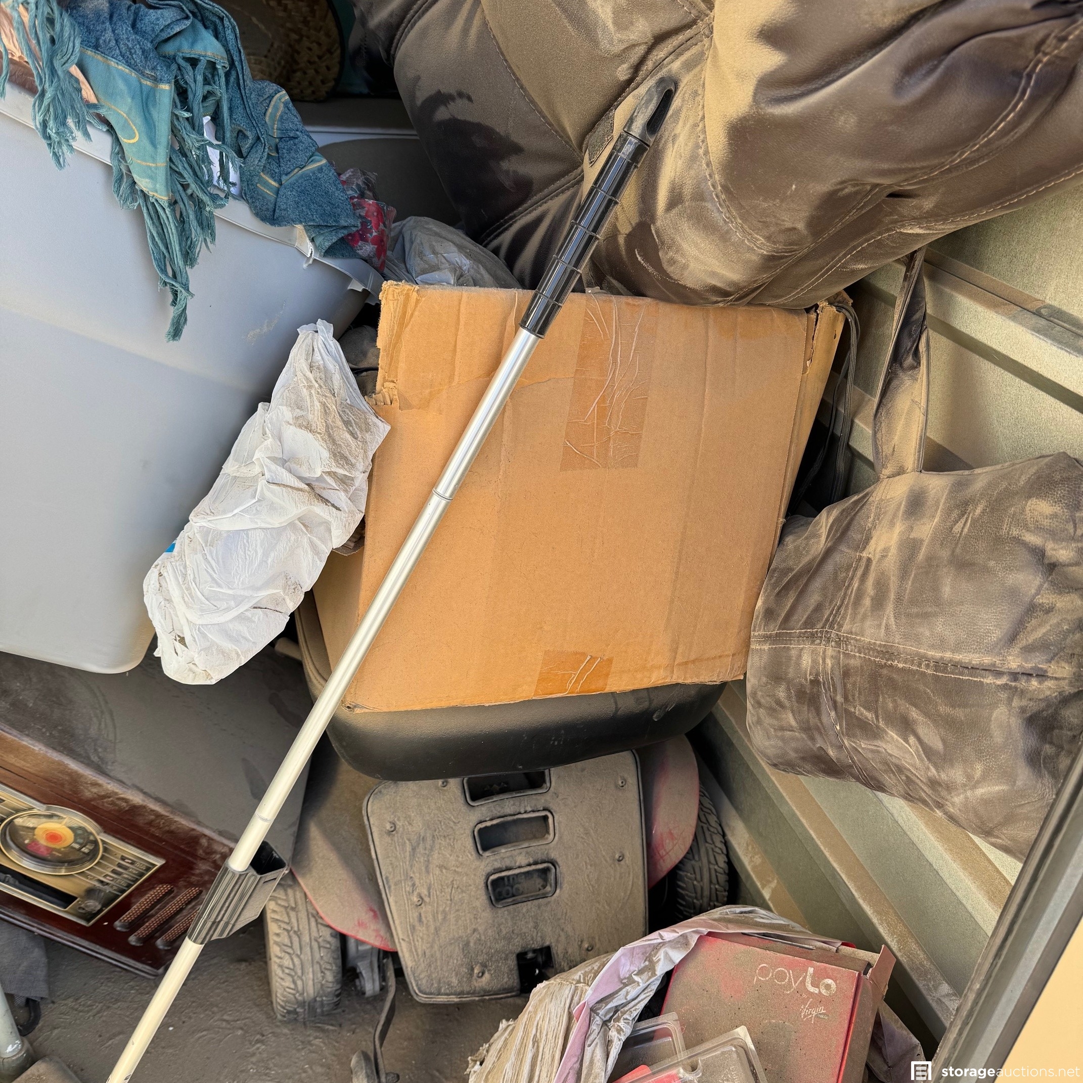 Unit appears to have lounge chair, record player, furniture, motorized scooter, and other misc. boxes