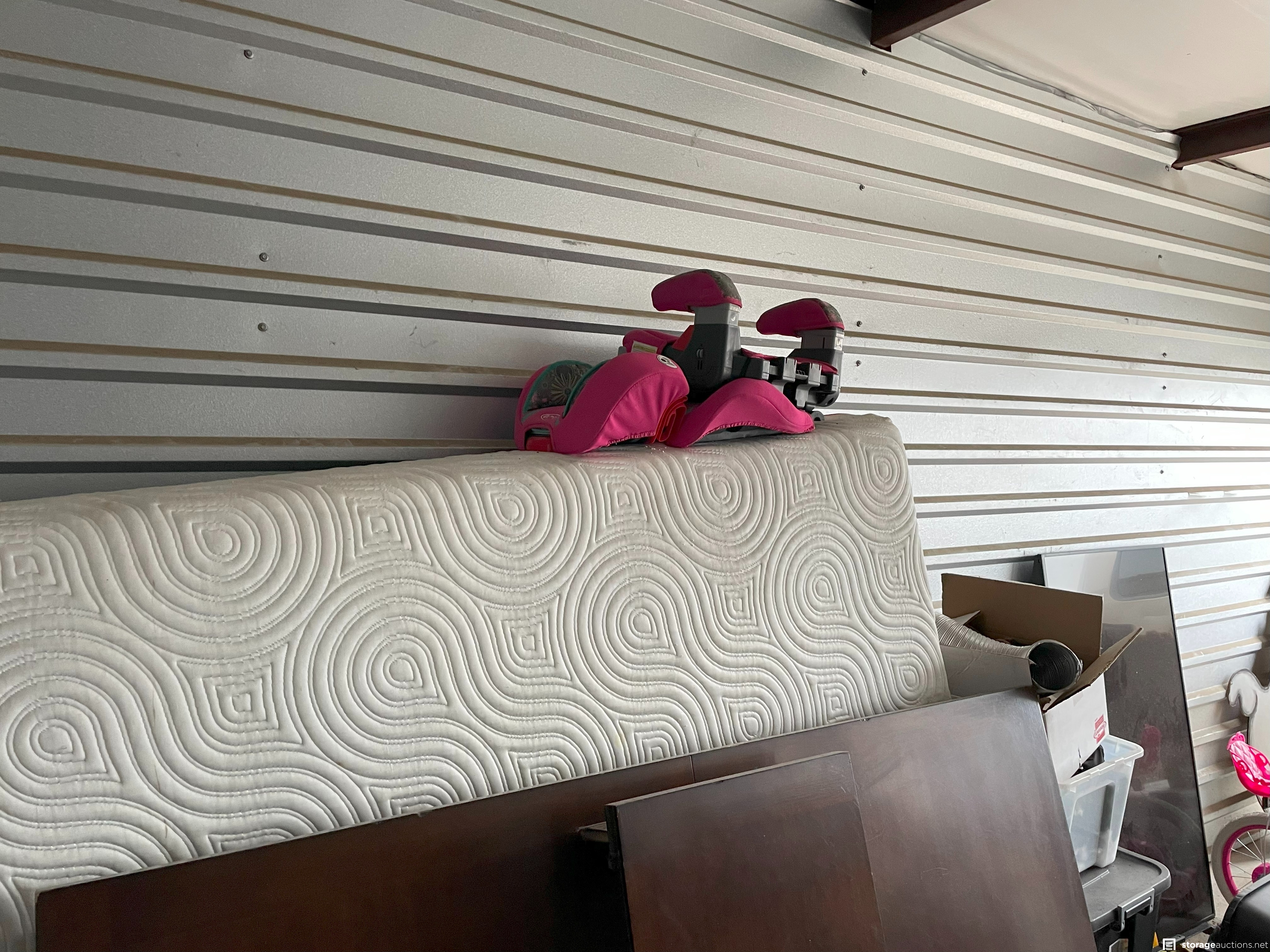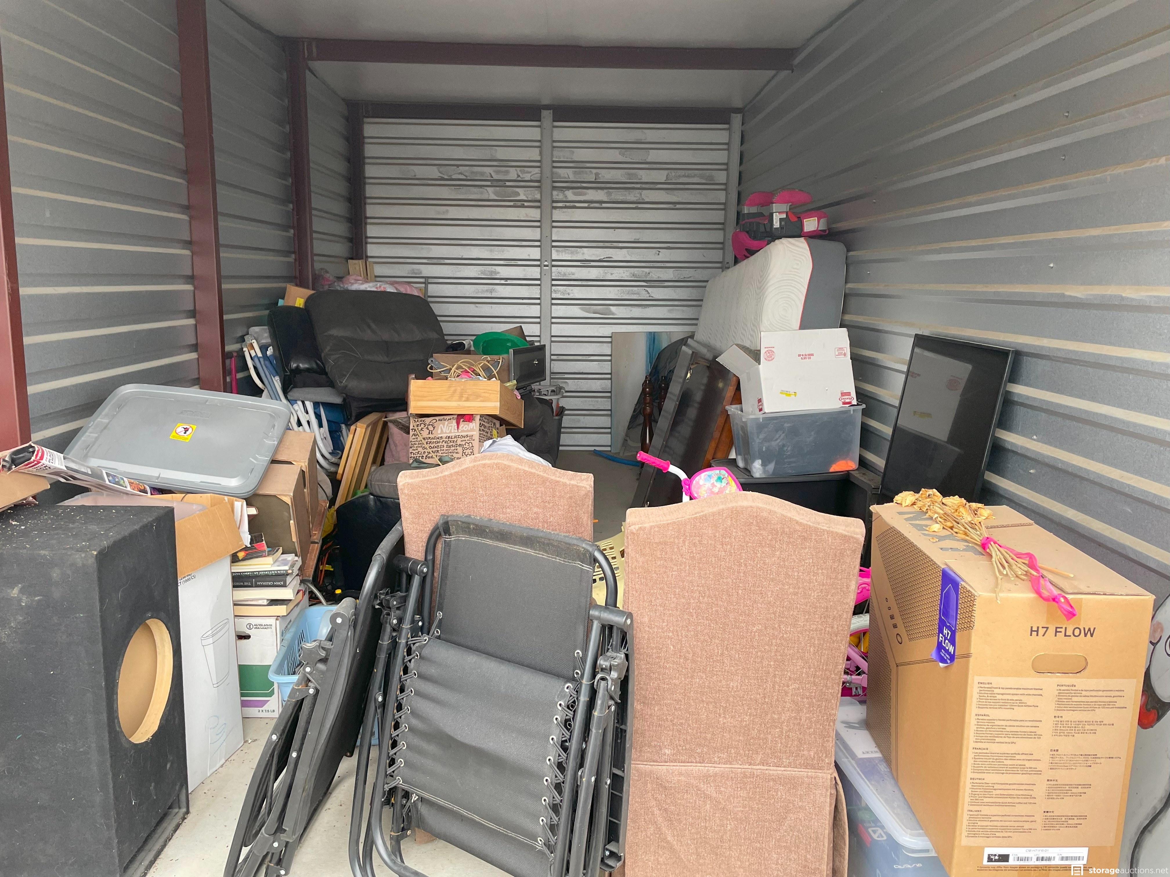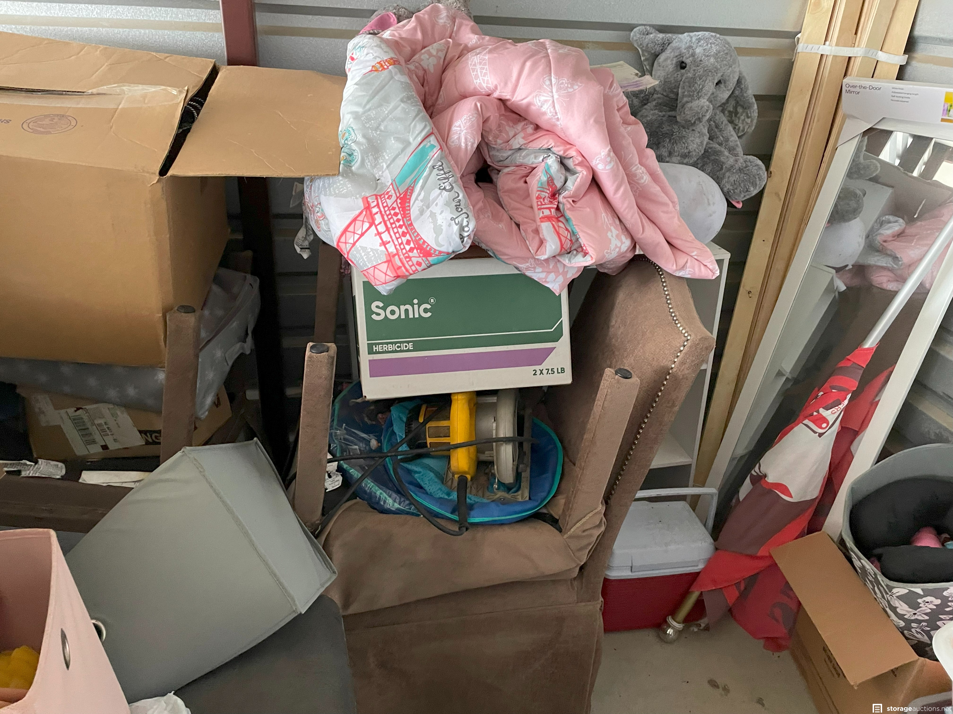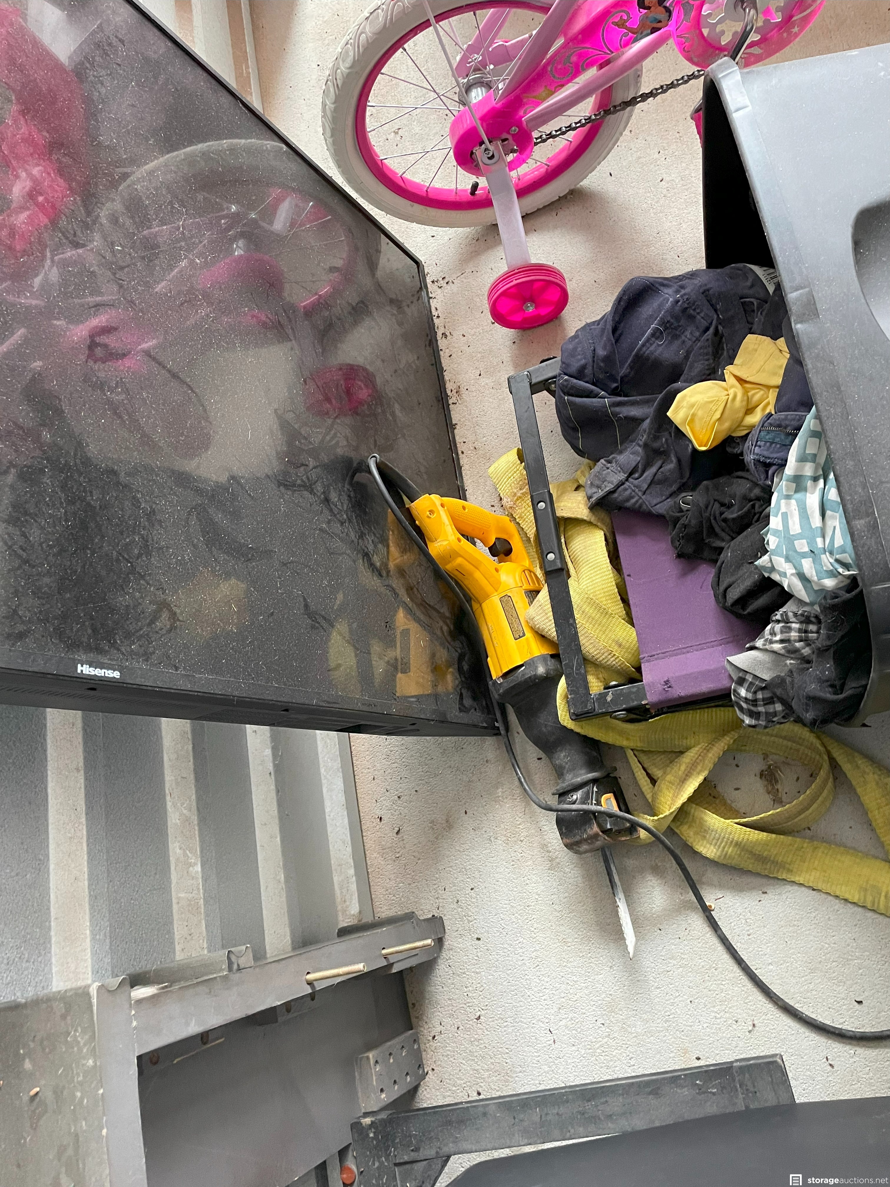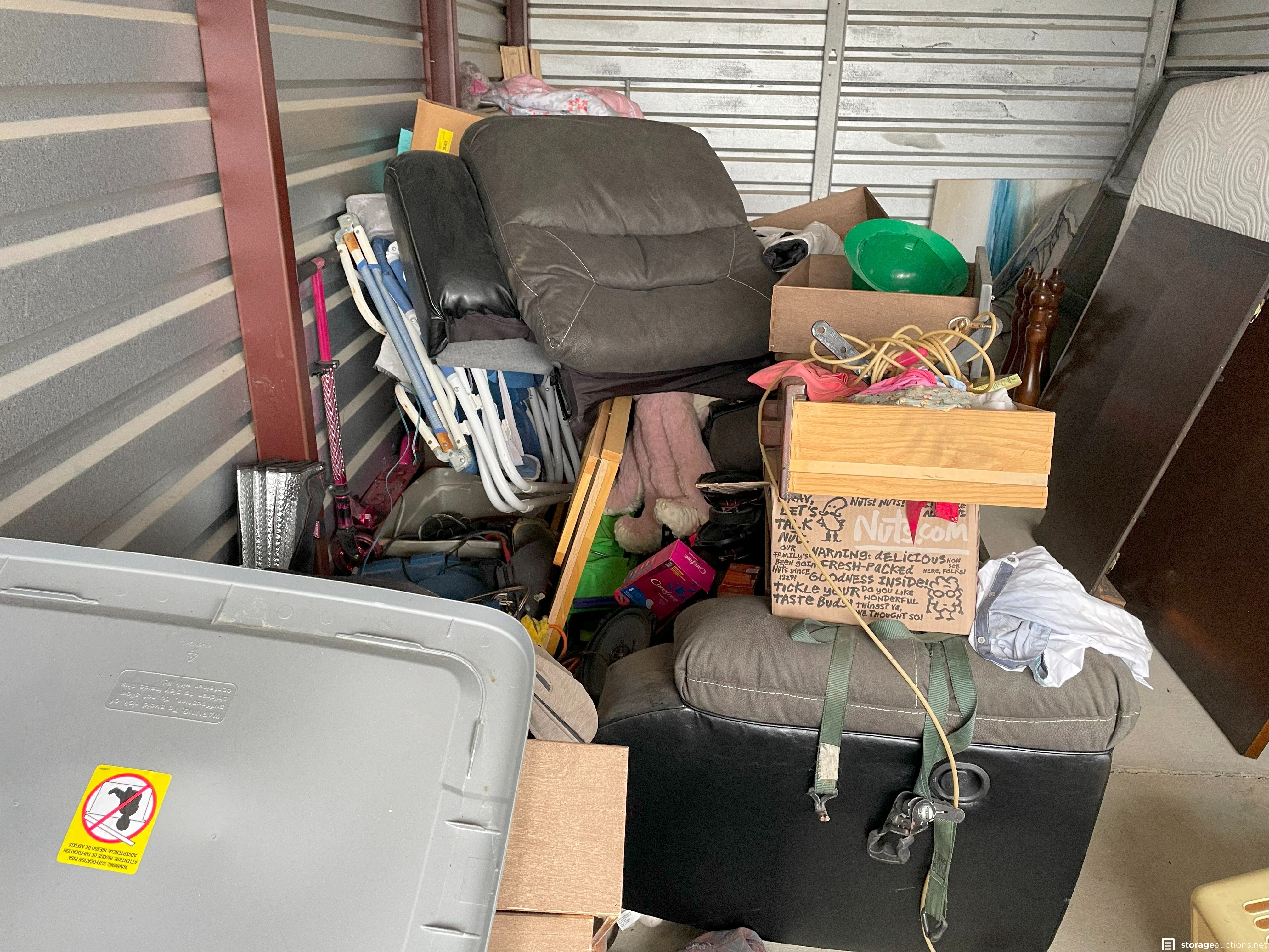 This unit seems to have Dining set, tools, electronics, lawn chairs, kids bicycle, scooter, tv, bed, art and misc. items.