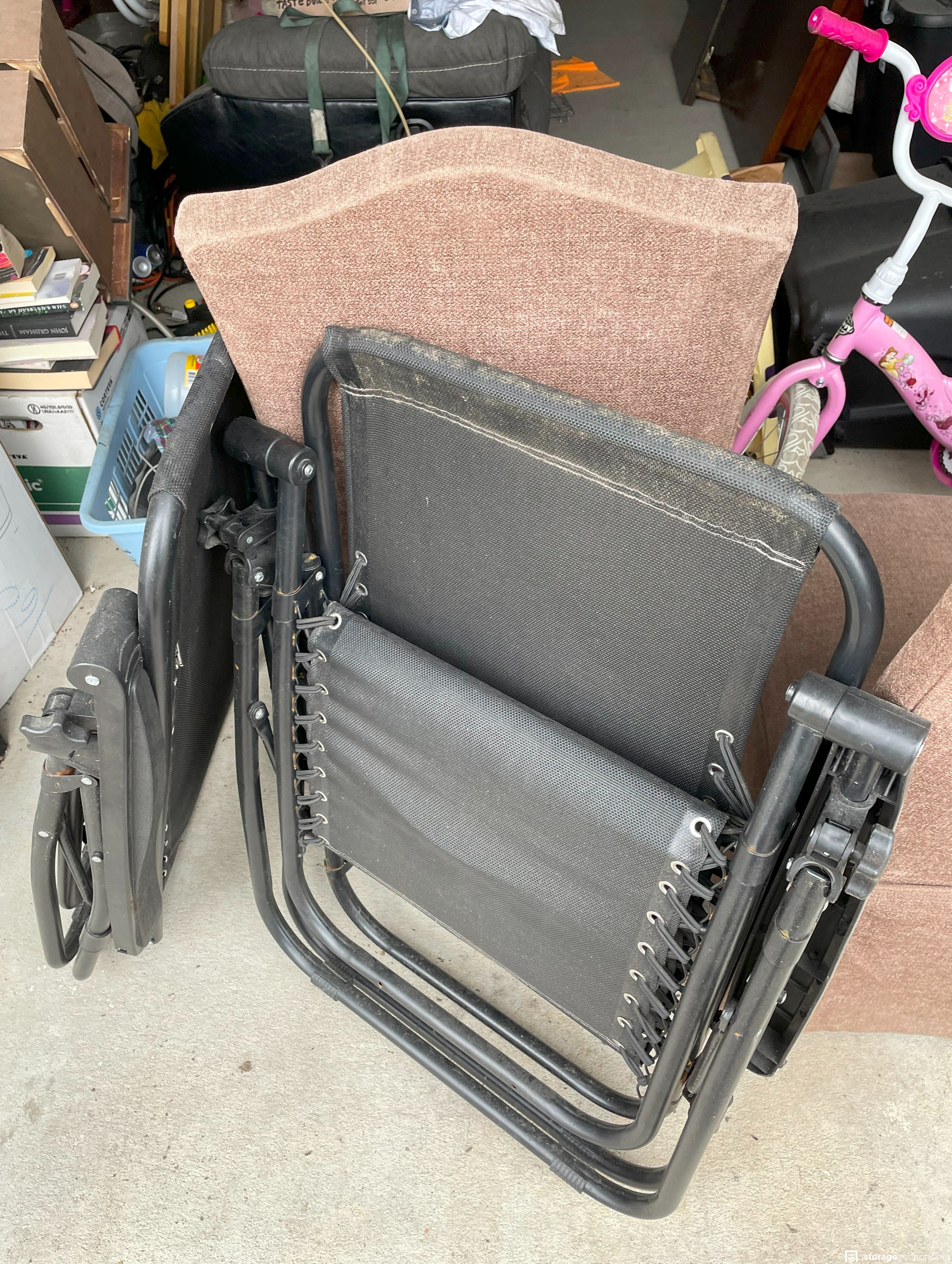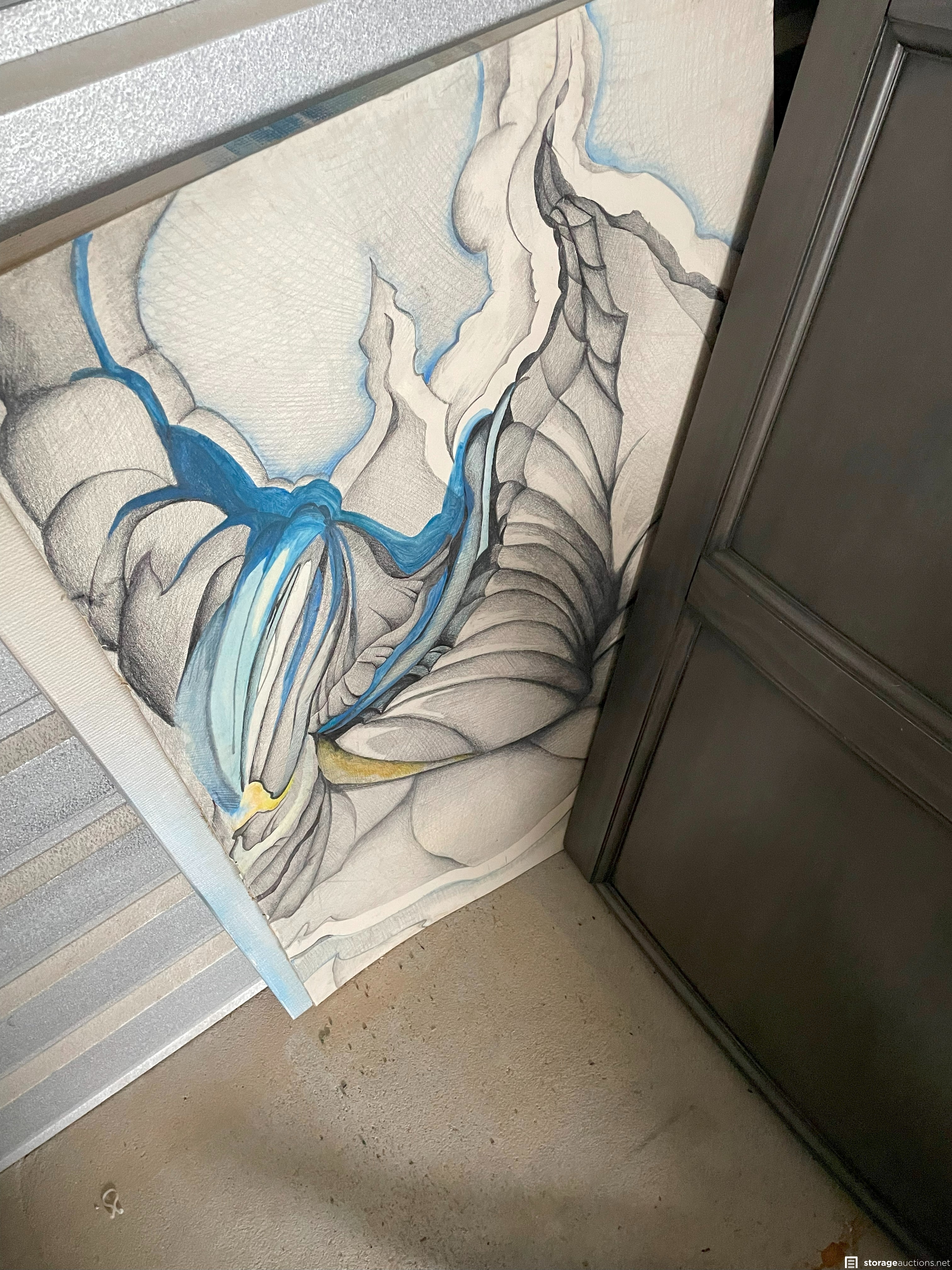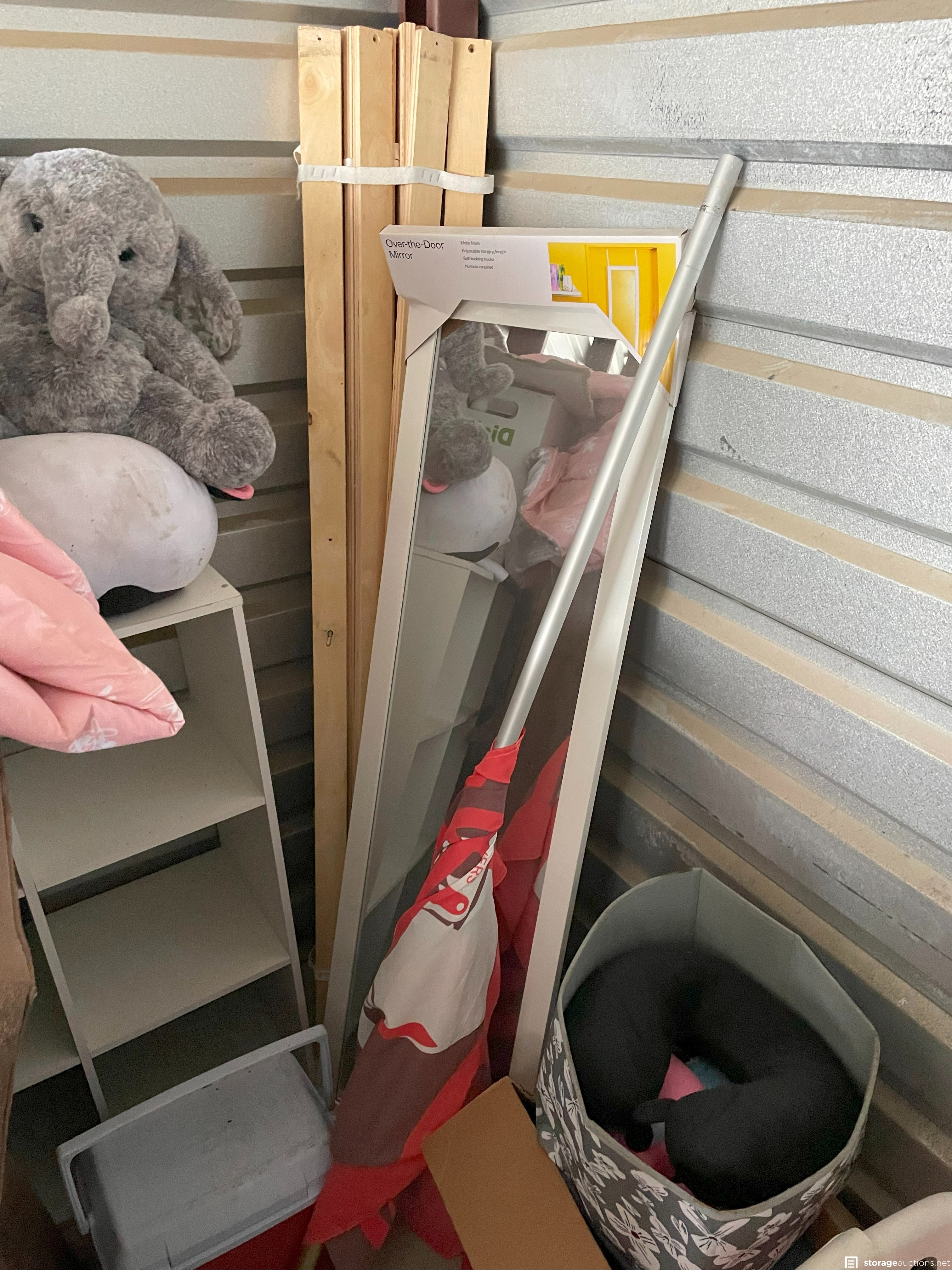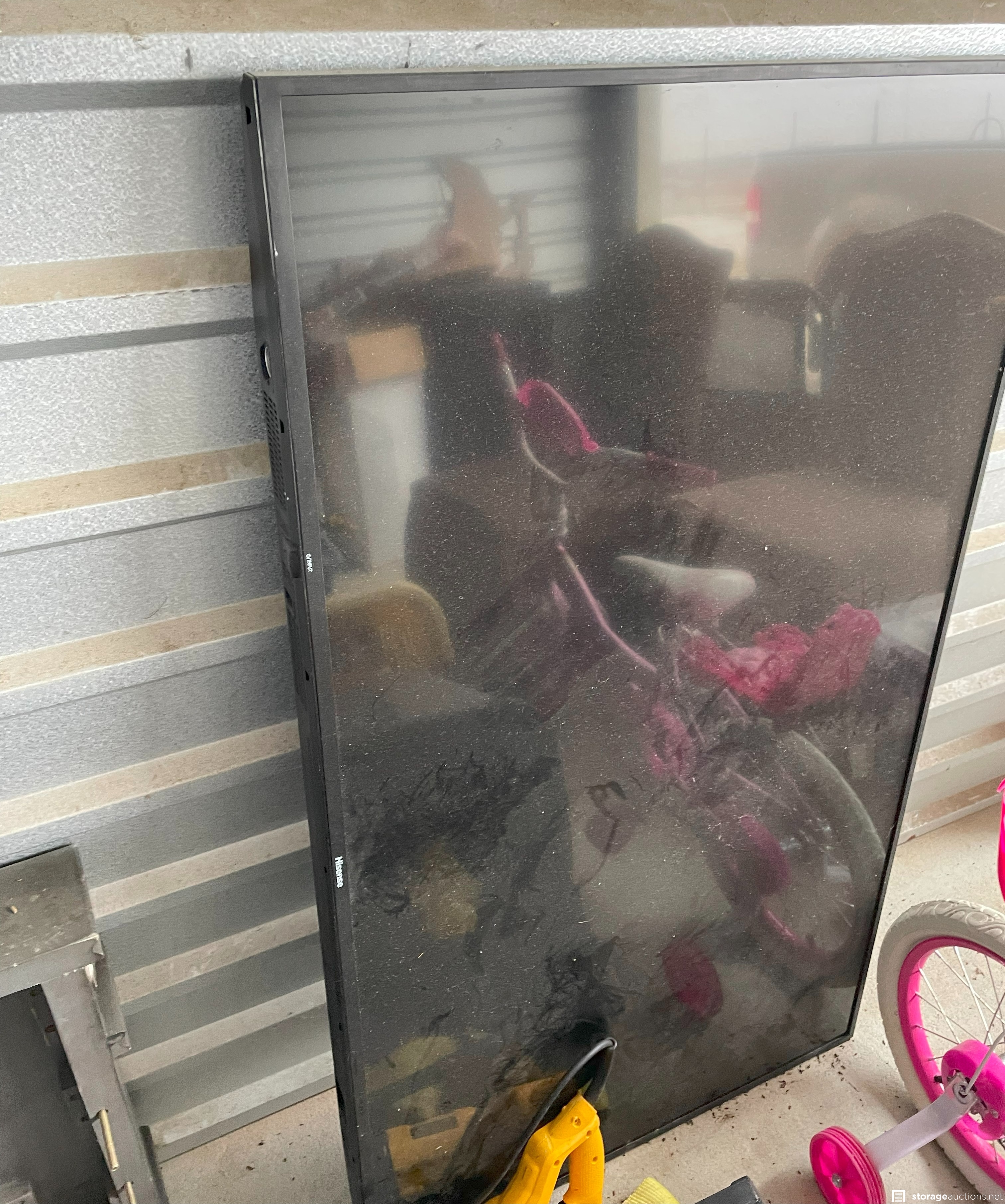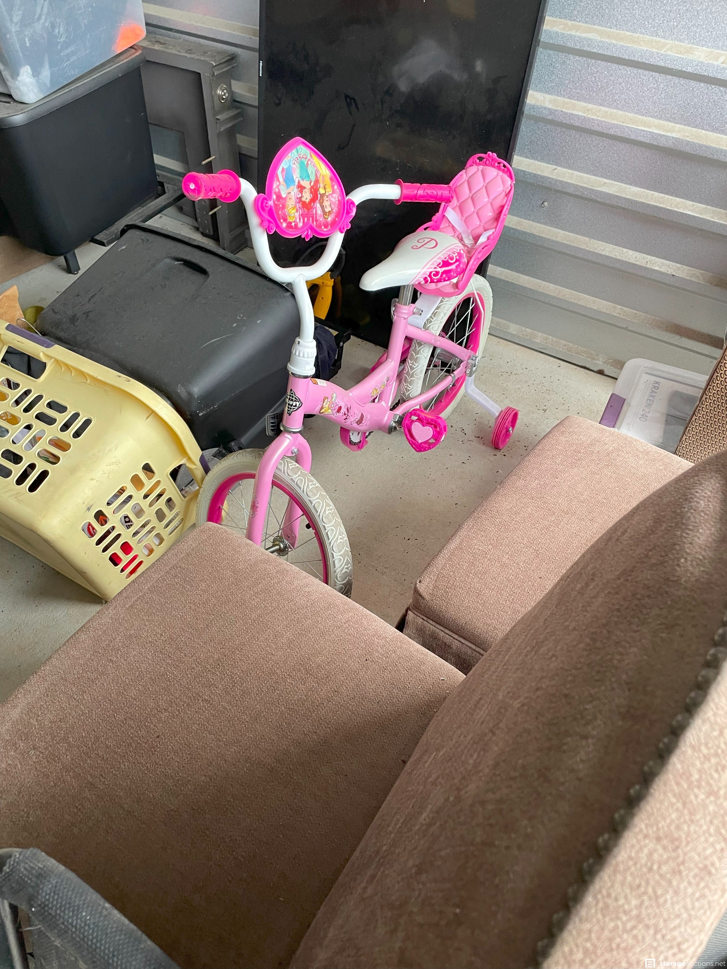 This unit seems to have Dining set, tools, electronics, lawn chairs, kids bicycle, scooter, tv, bed, art and misc. items.