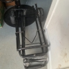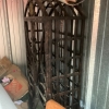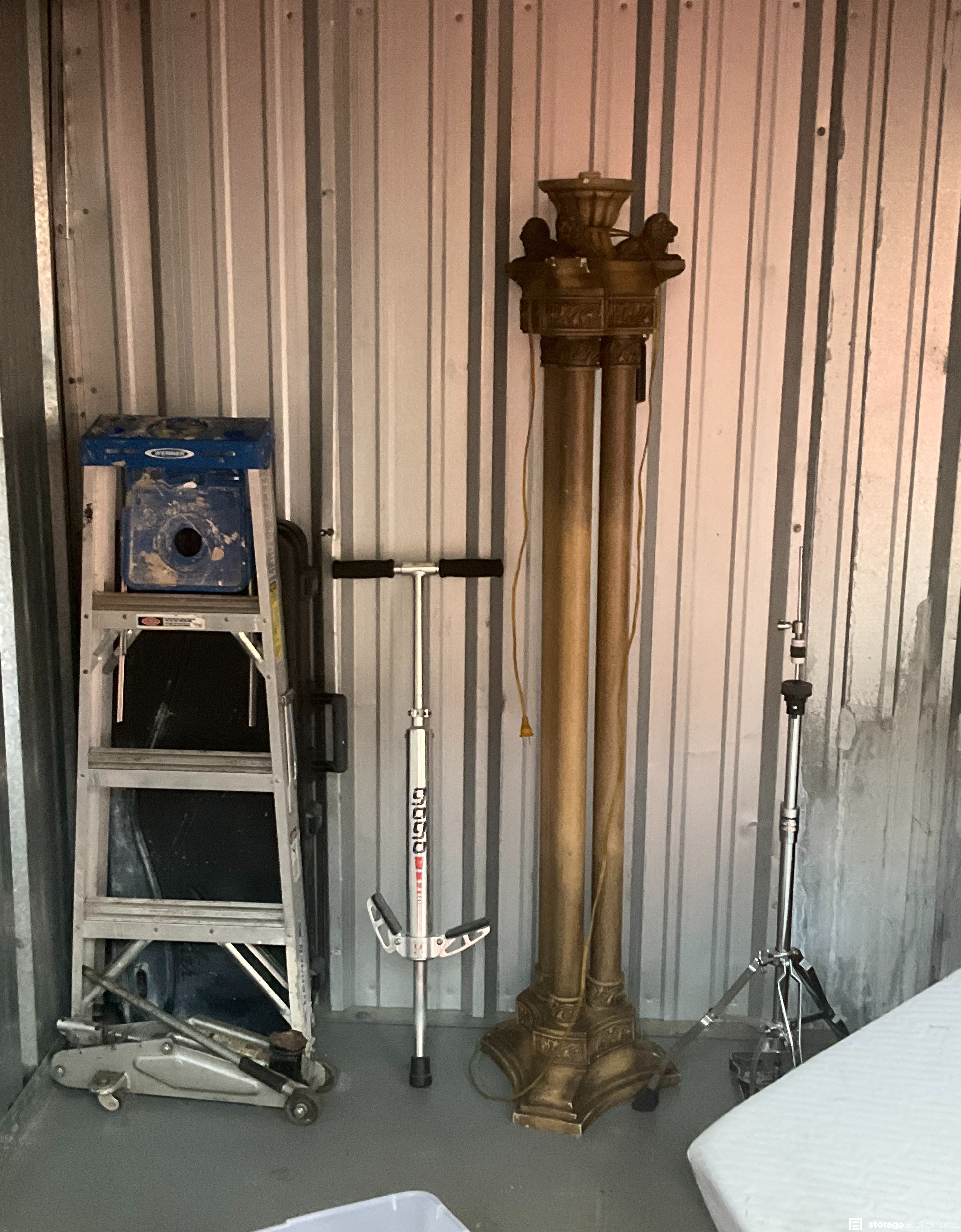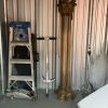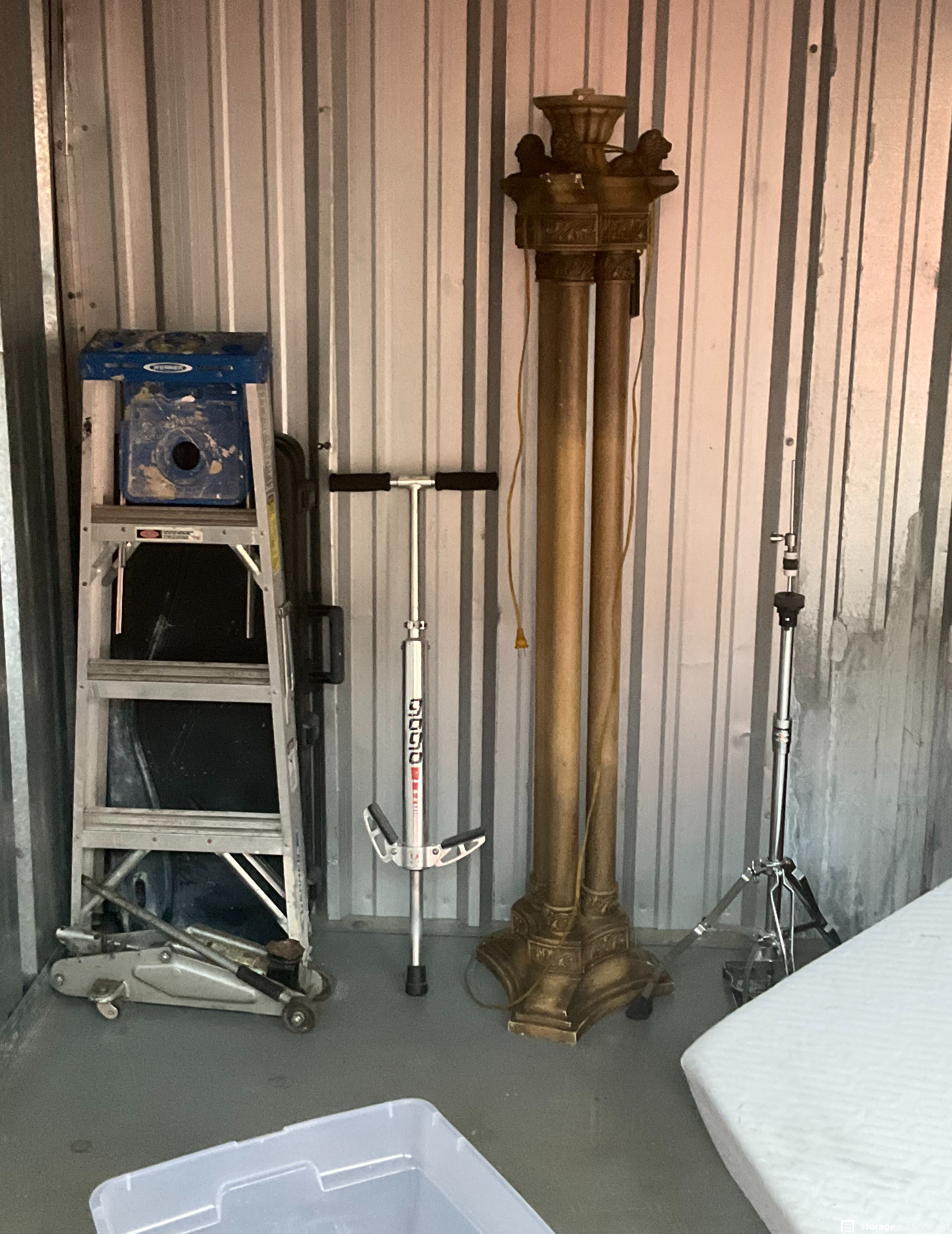 A handful of cool things! A vintage wine rack, a column shaped lamp, pogo stick, ladder, manual car jack, some posters, possibly some sporting equipment "Thor," and framing for a children's bed! The mattress appears to be in OK condition as well! Come grab it while you can!