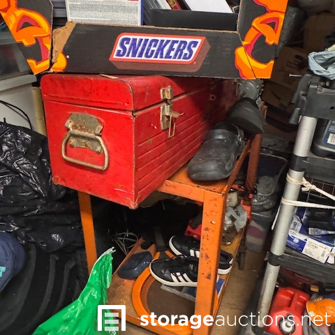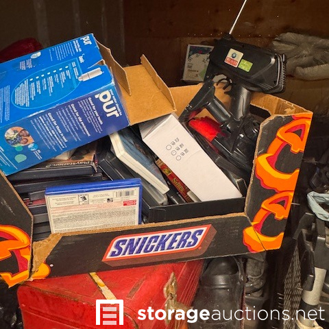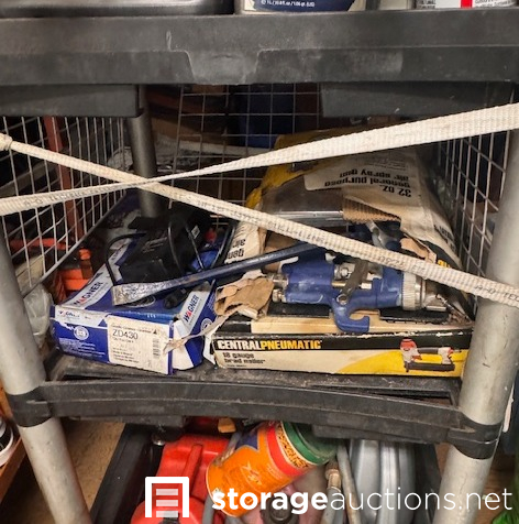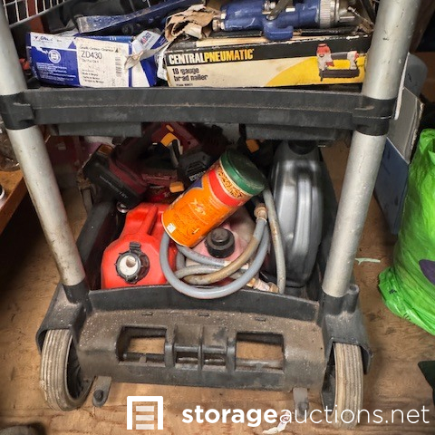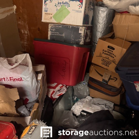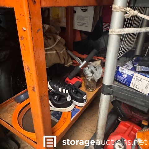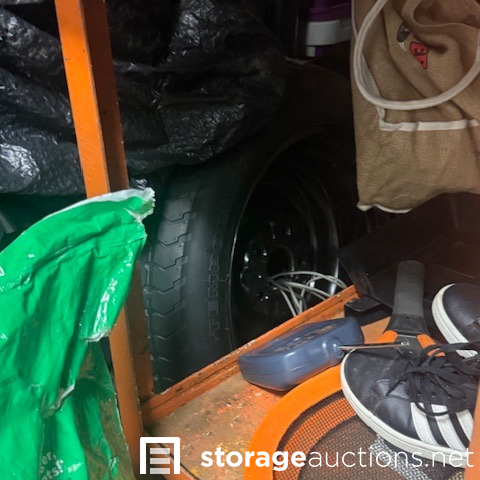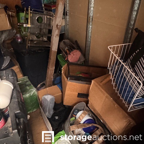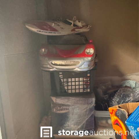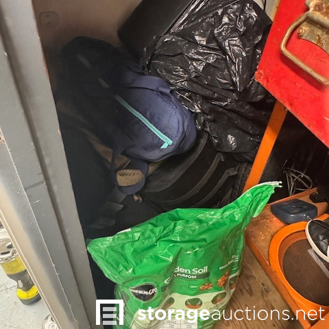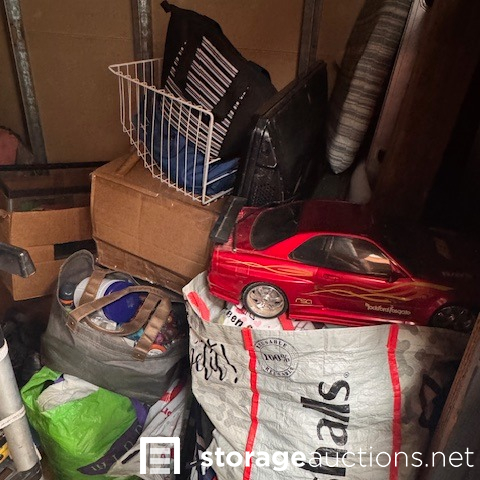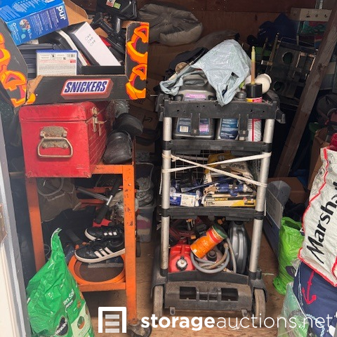 this unit appears to contain bags, clothing, bedding, ladder, 2 totes, tool cart, tool box, RC remote control cars and boats, bag of soil, shoes, scooter, food, food trays, fish tank, dresser, car tire, games, DVDs, tool bag, misc items.