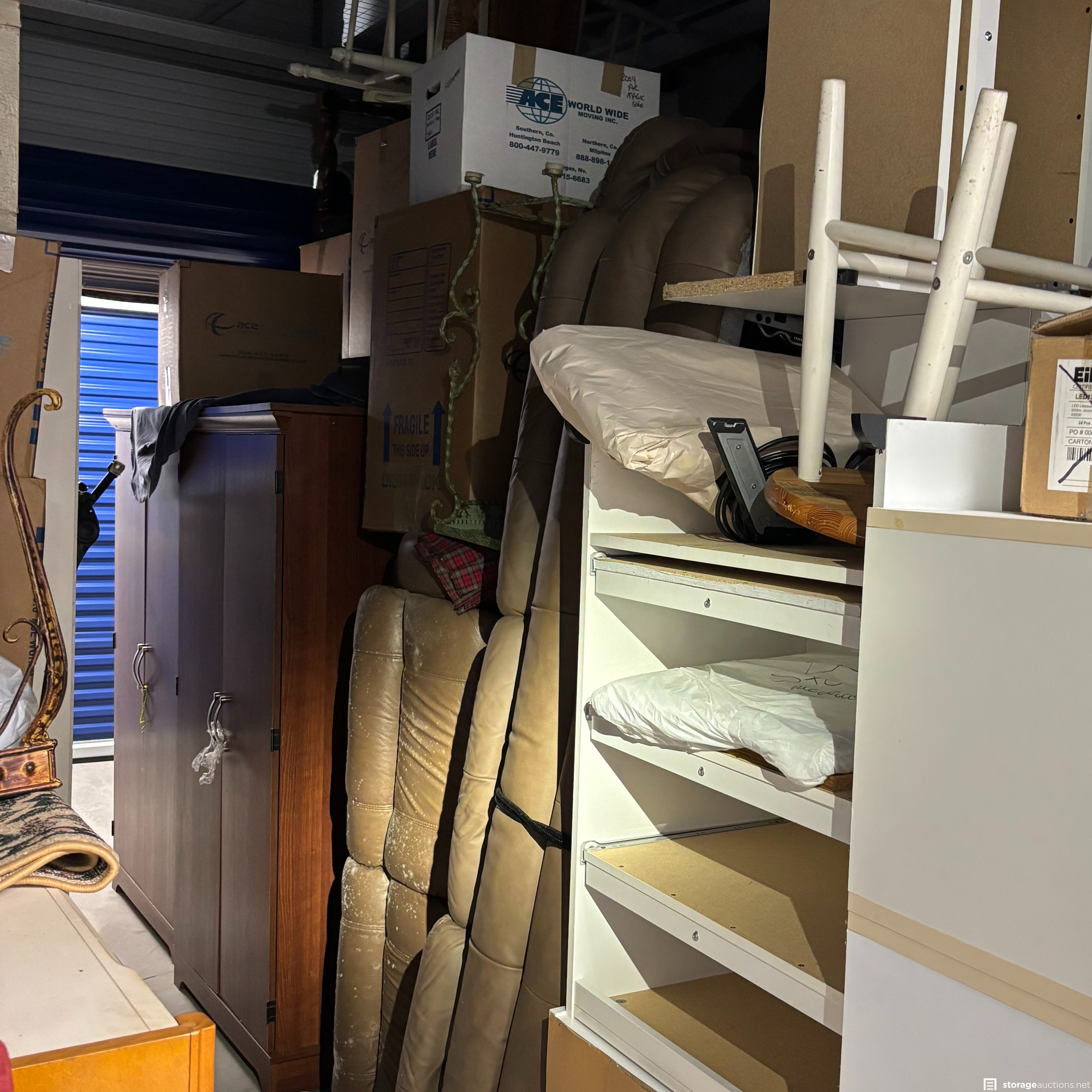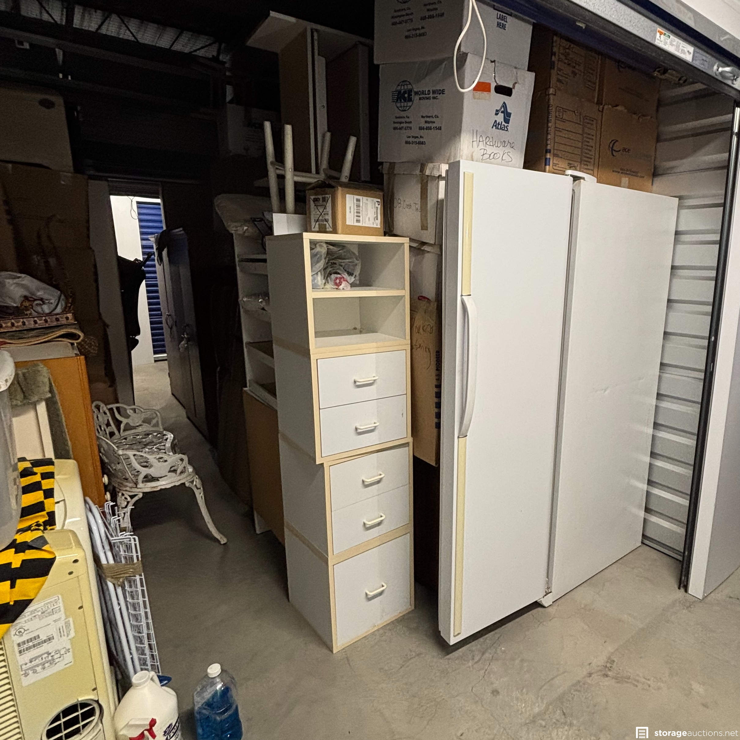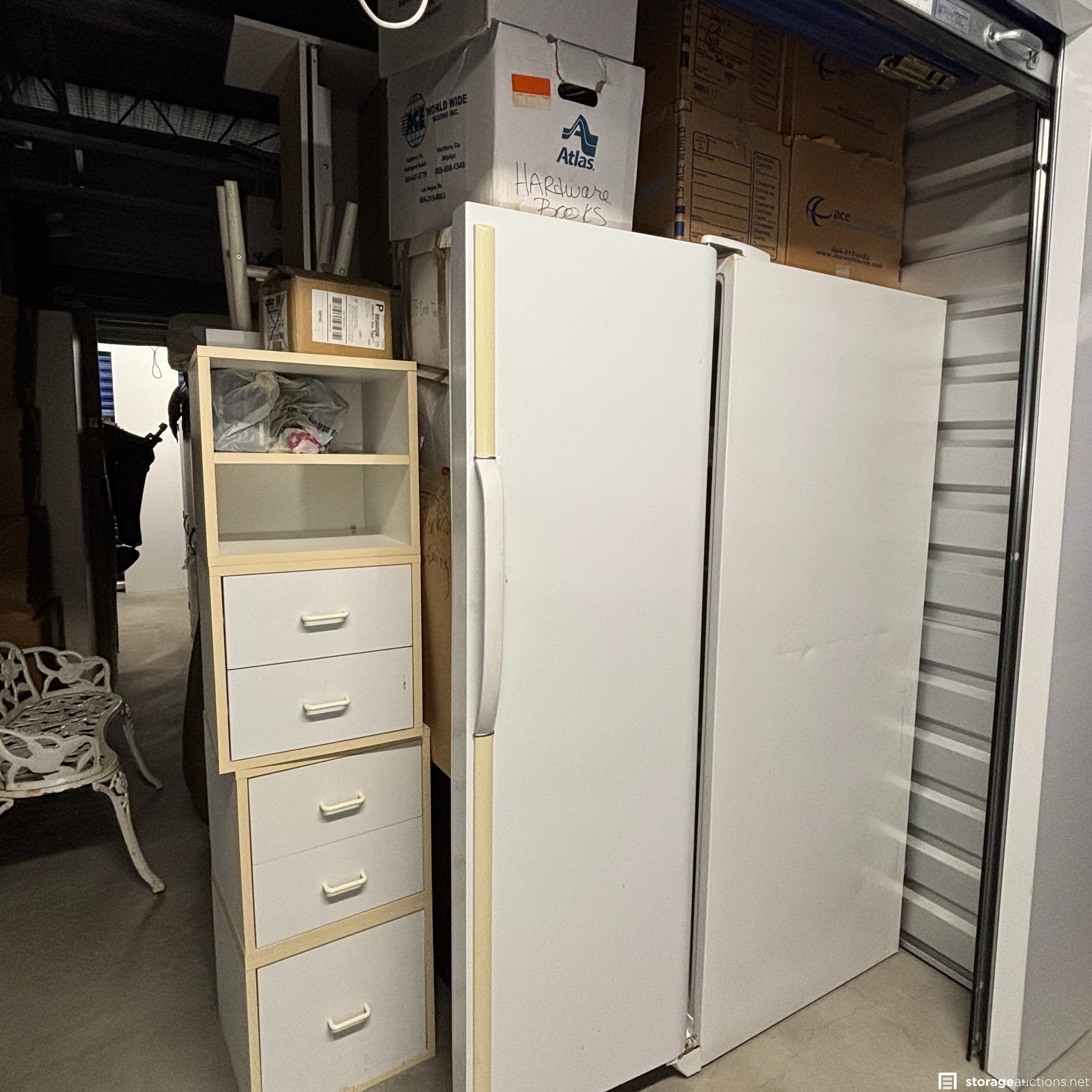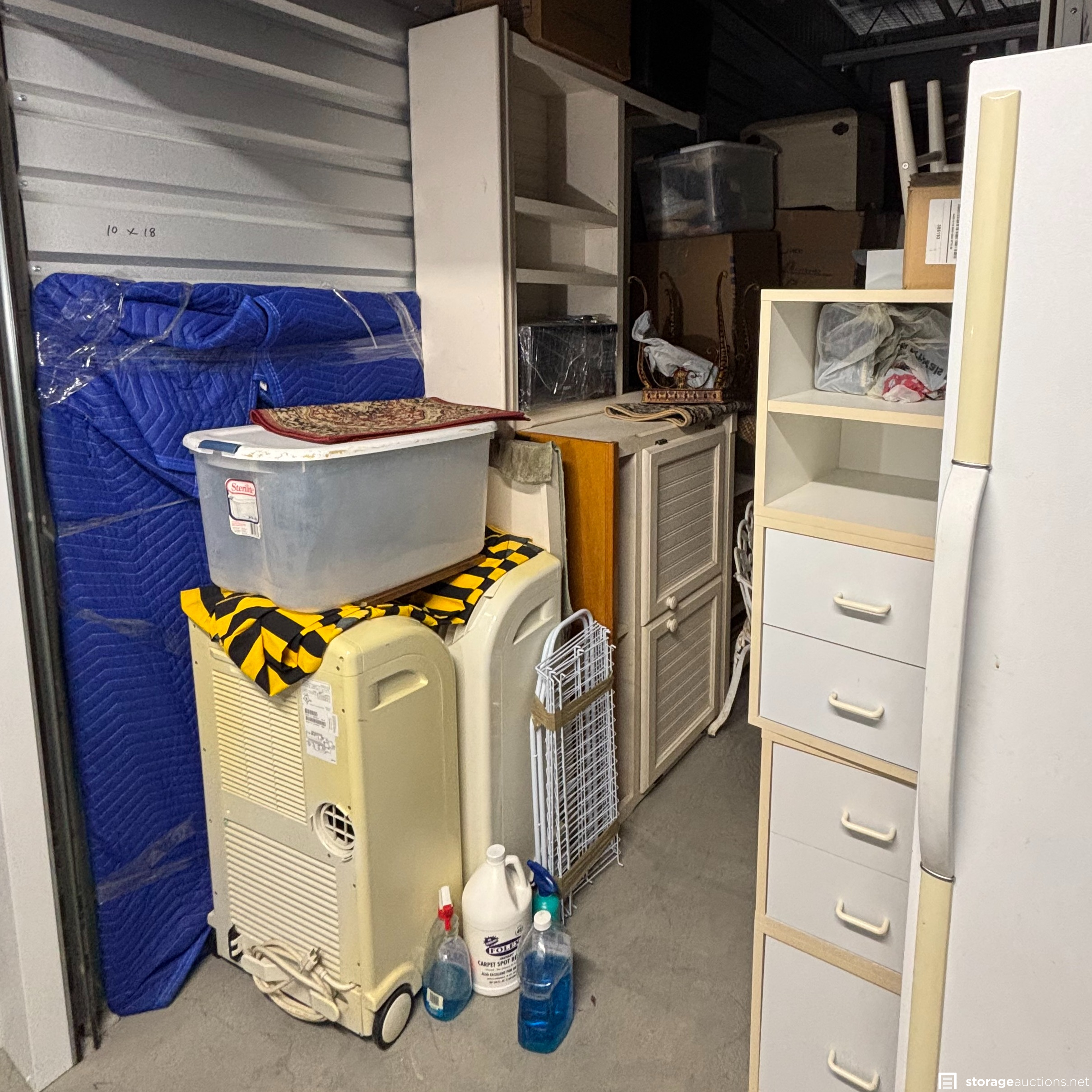The storage unit appears to contain miscellaneous household goods, furniture, mattress, refrigerator, and miscellaneous containers of unknown content.