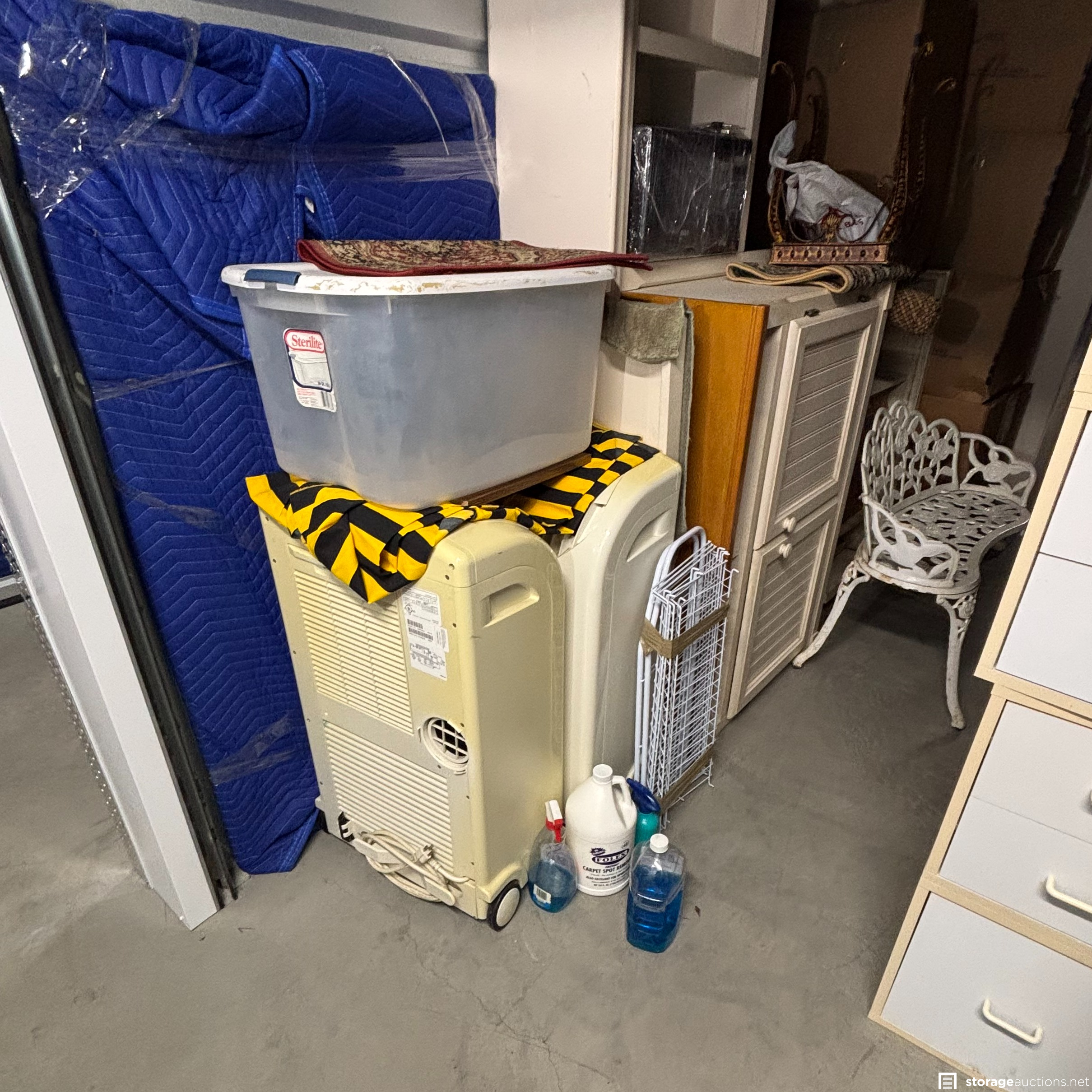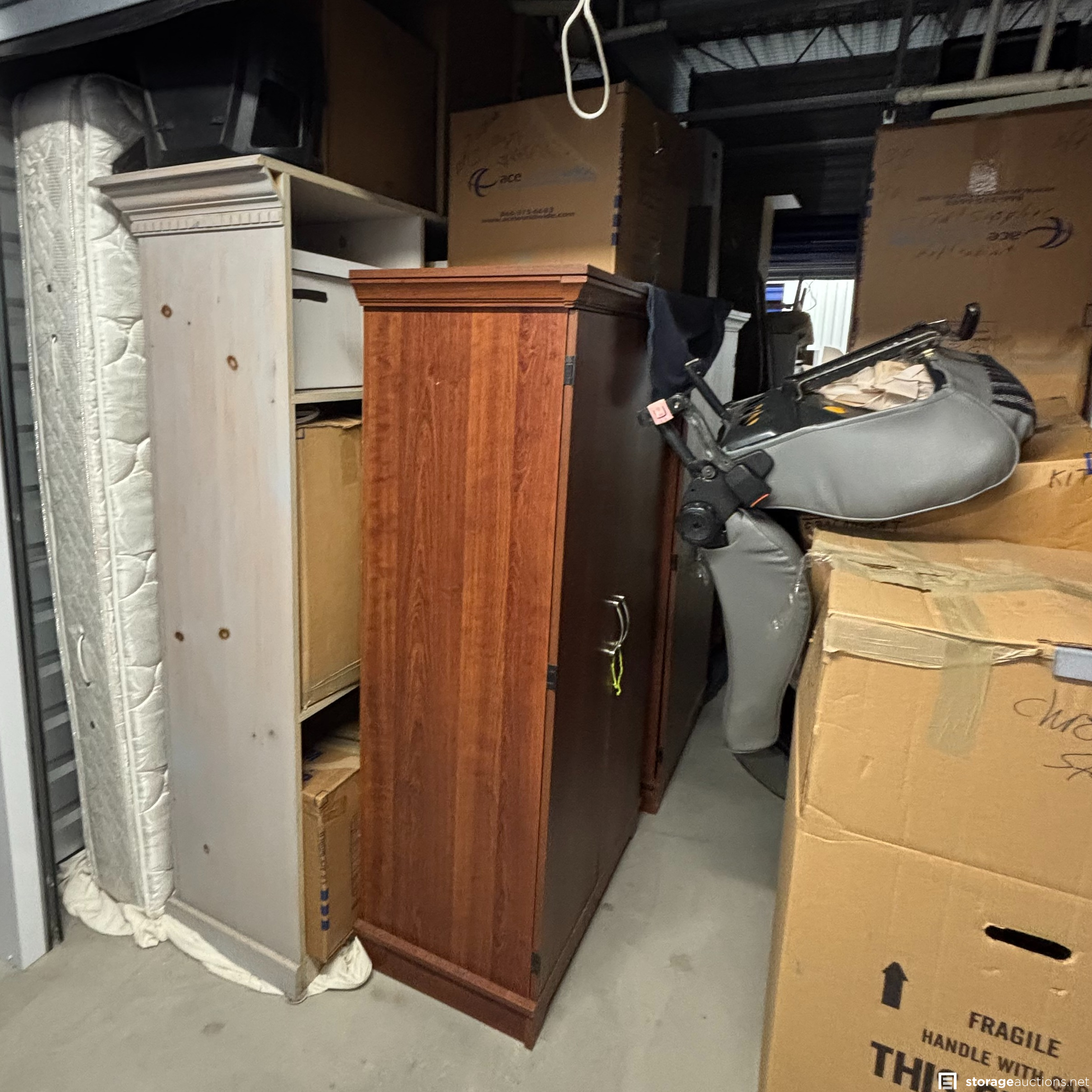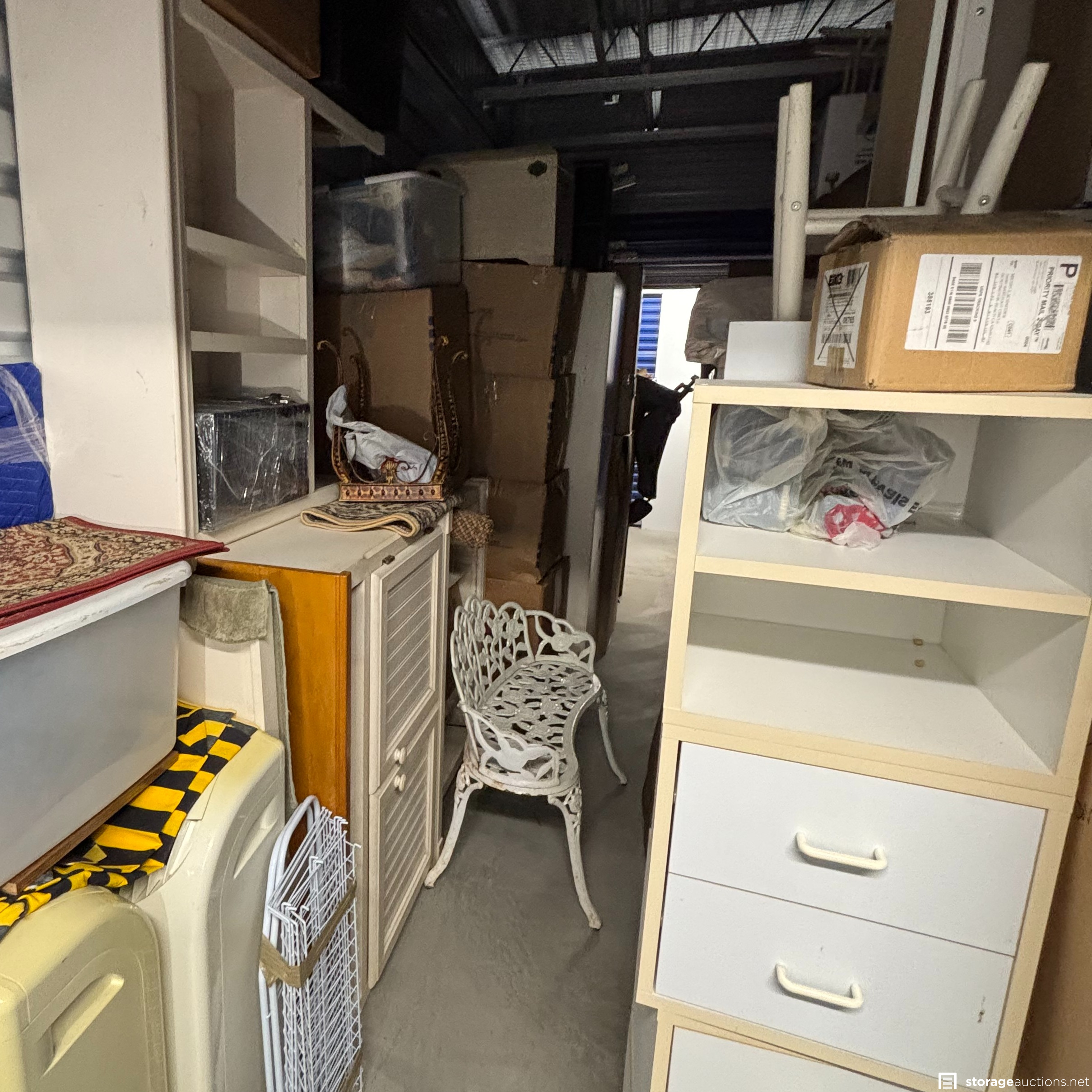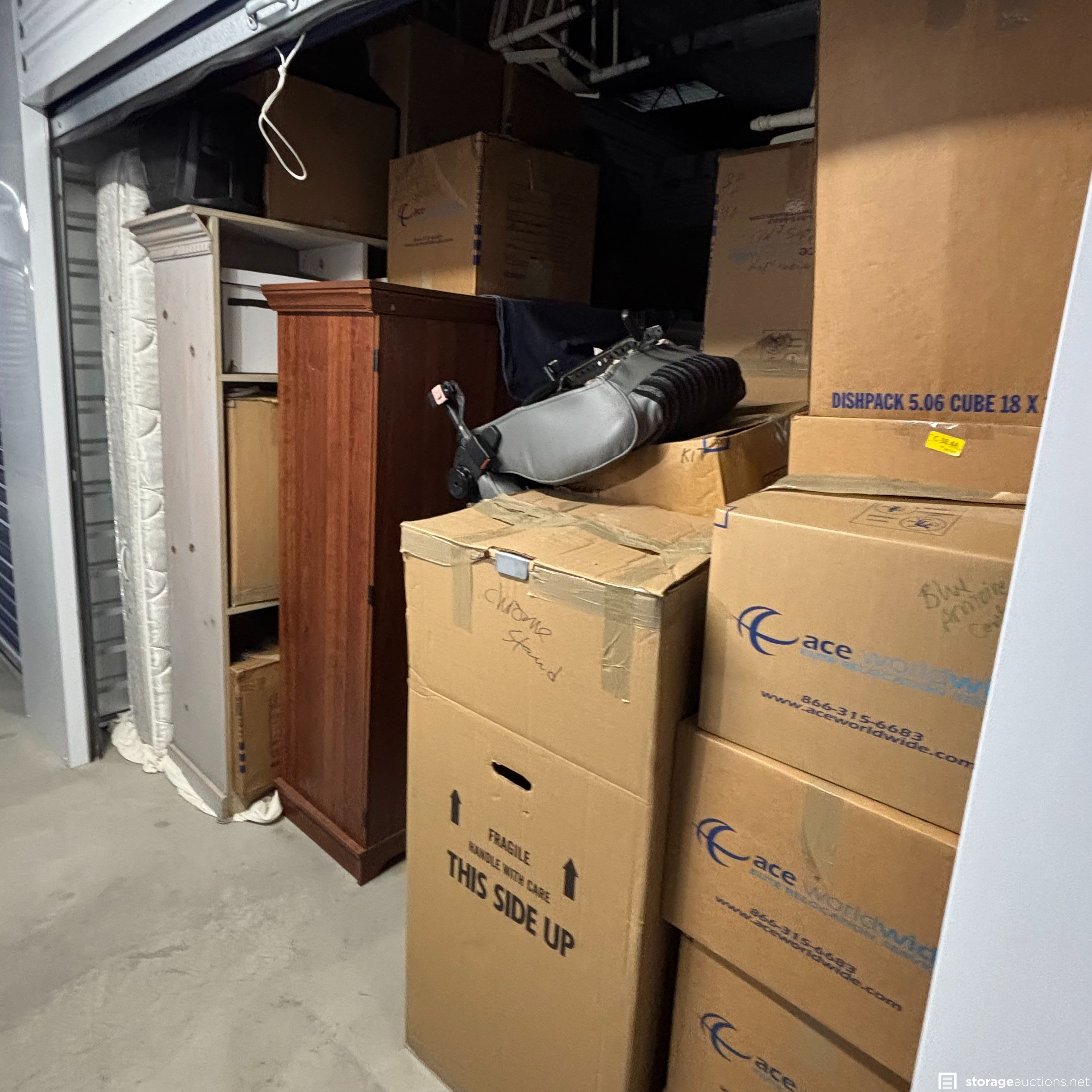The storage unit appears to contain miscellaneous household goods, furniture, mattress, refrigerator, and miscellaneous containers of unknown content.