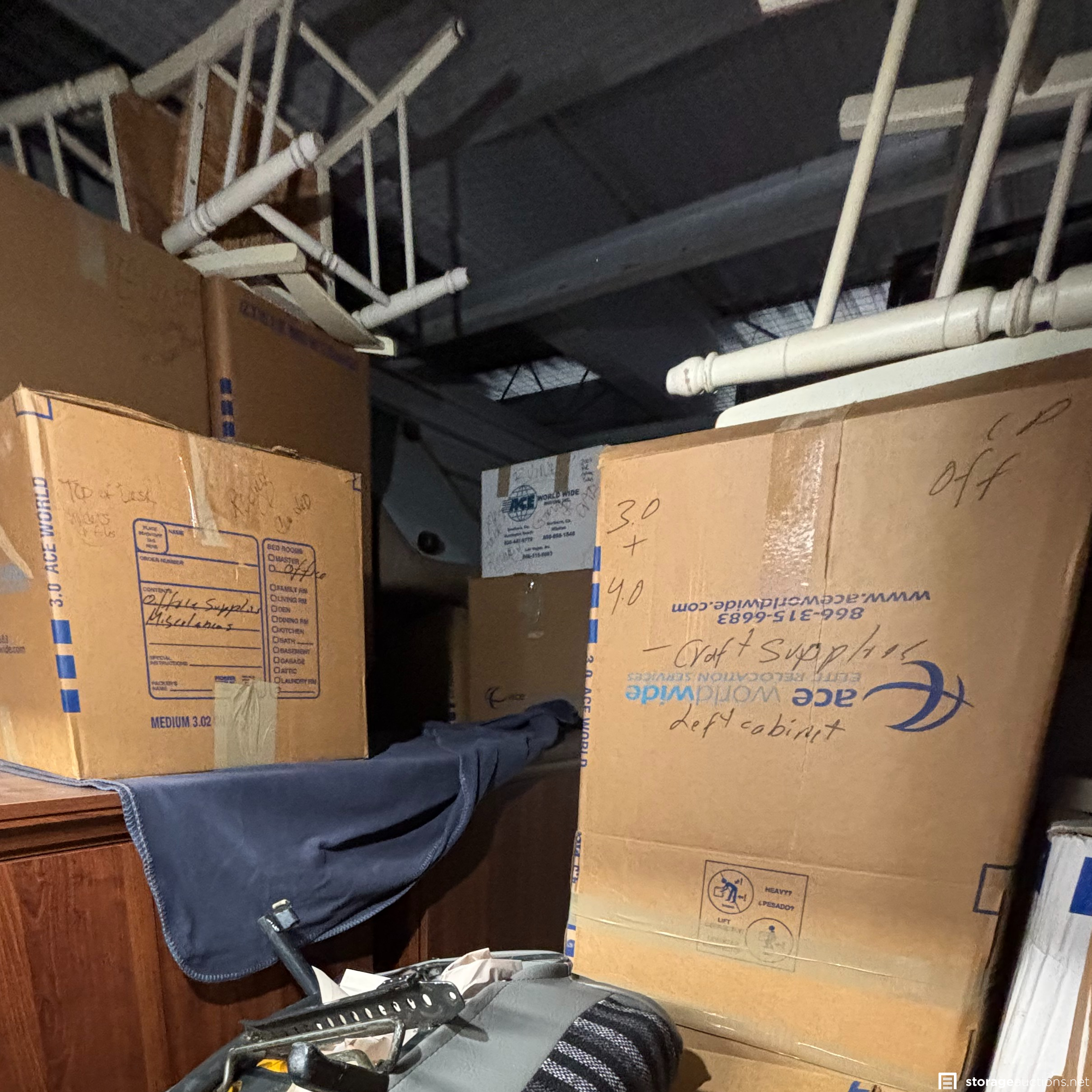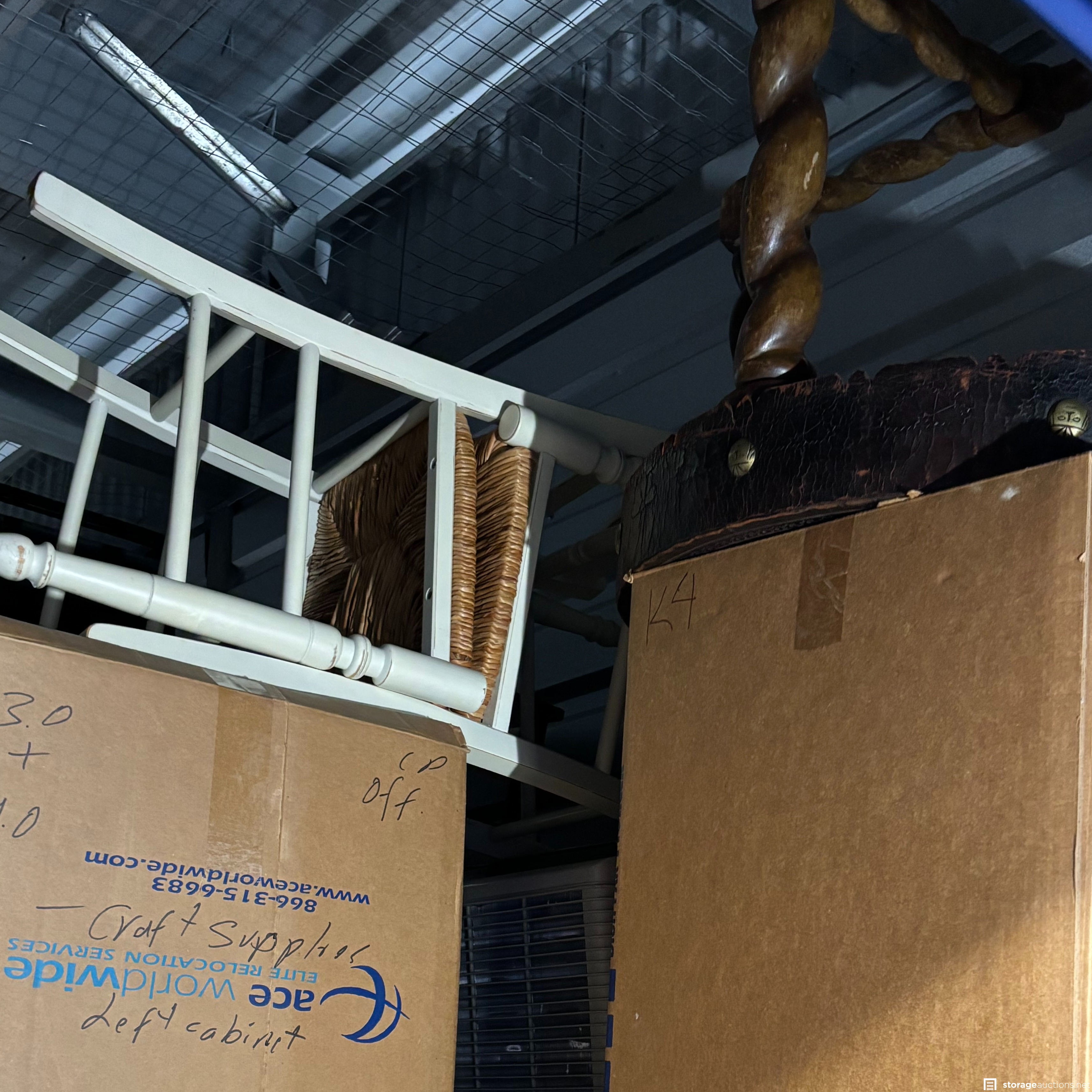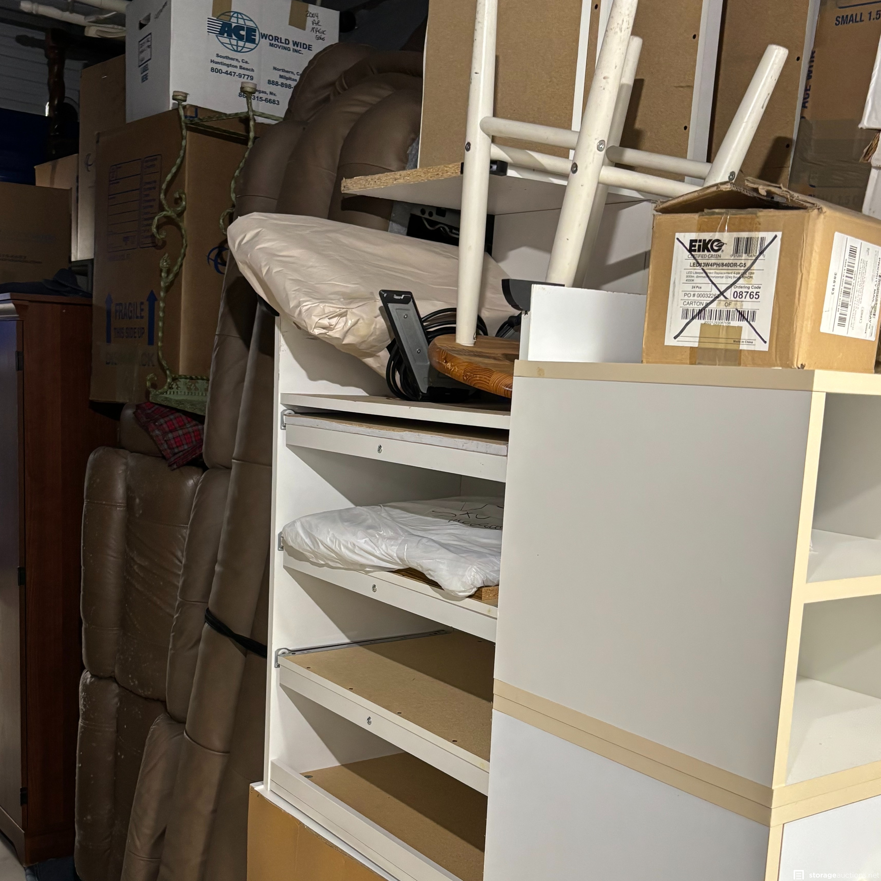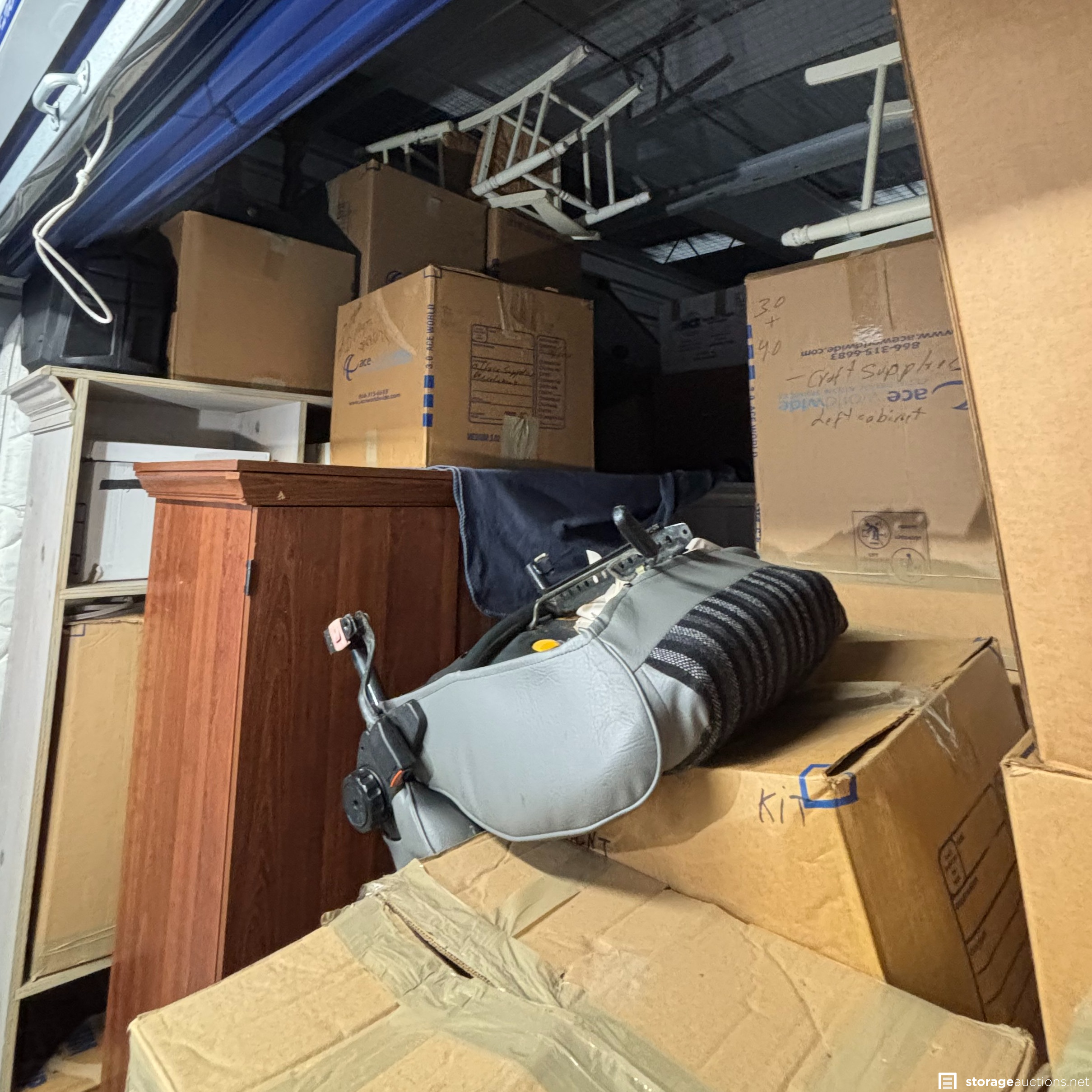 The storage unit appears to contain miscellaneous household goods, furniture, mattress, refrigerator, and miscellaneous containers of unknown content.