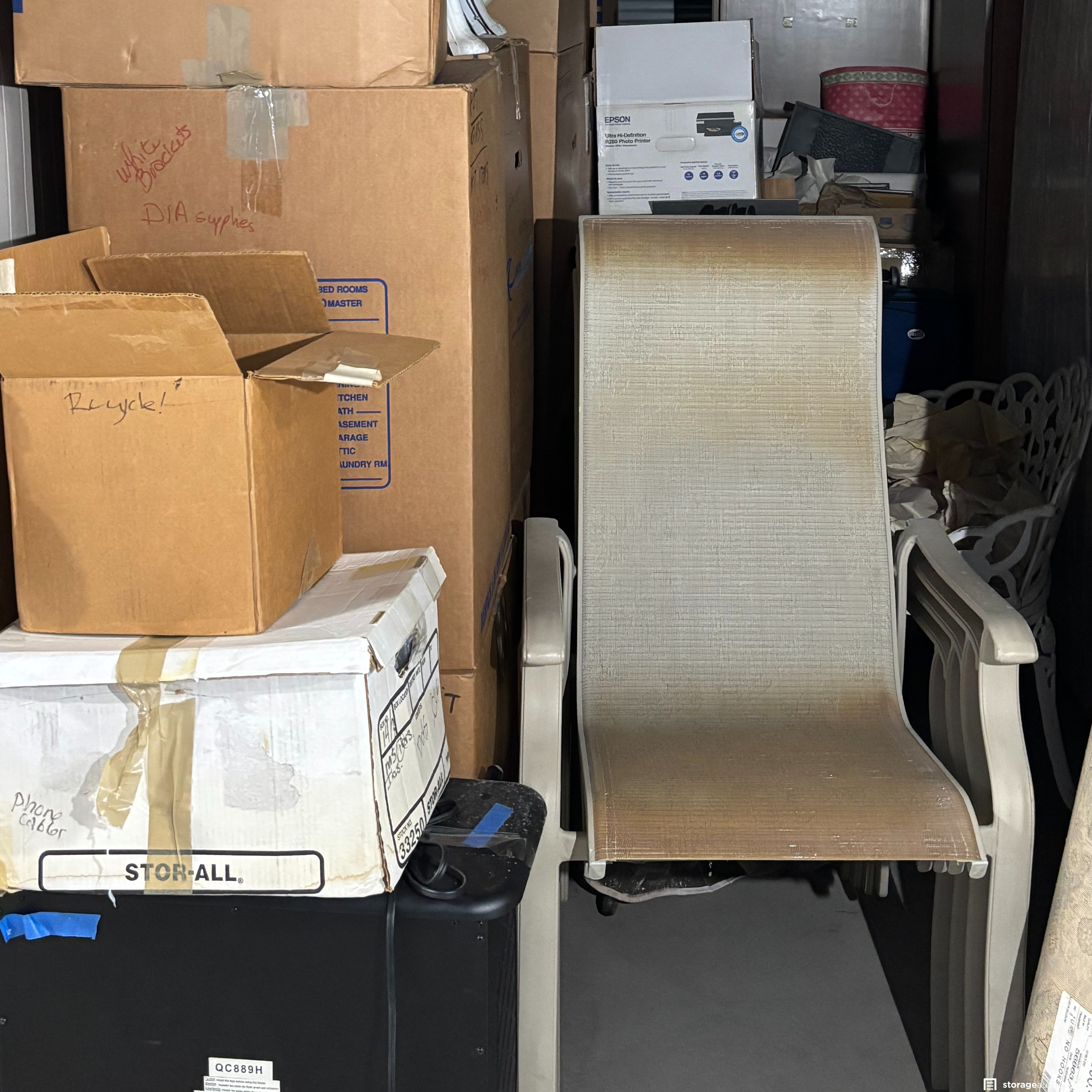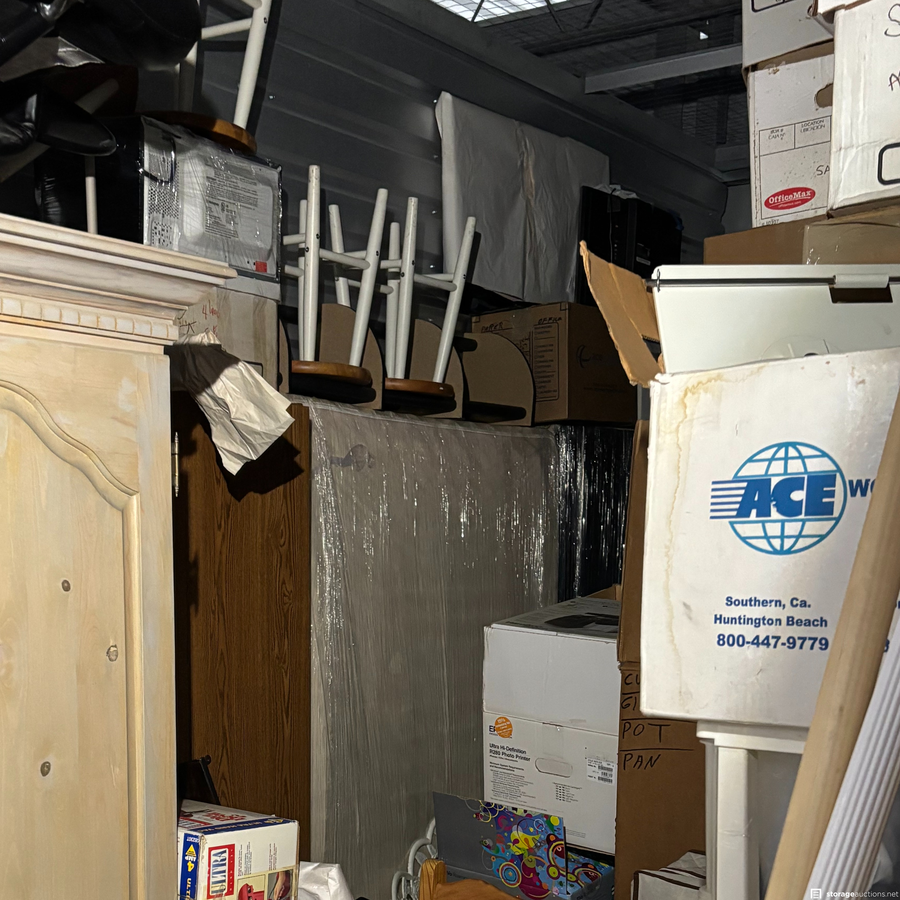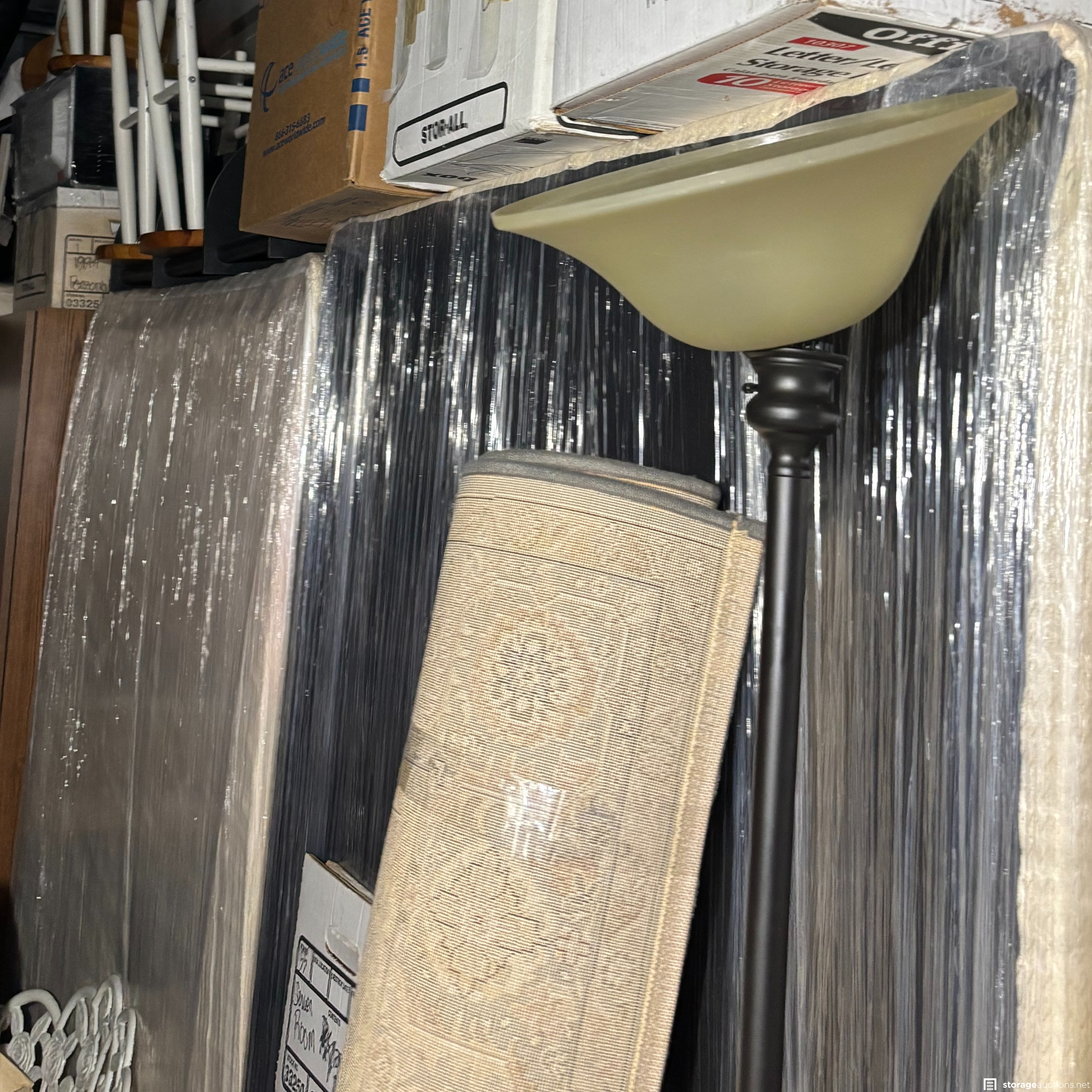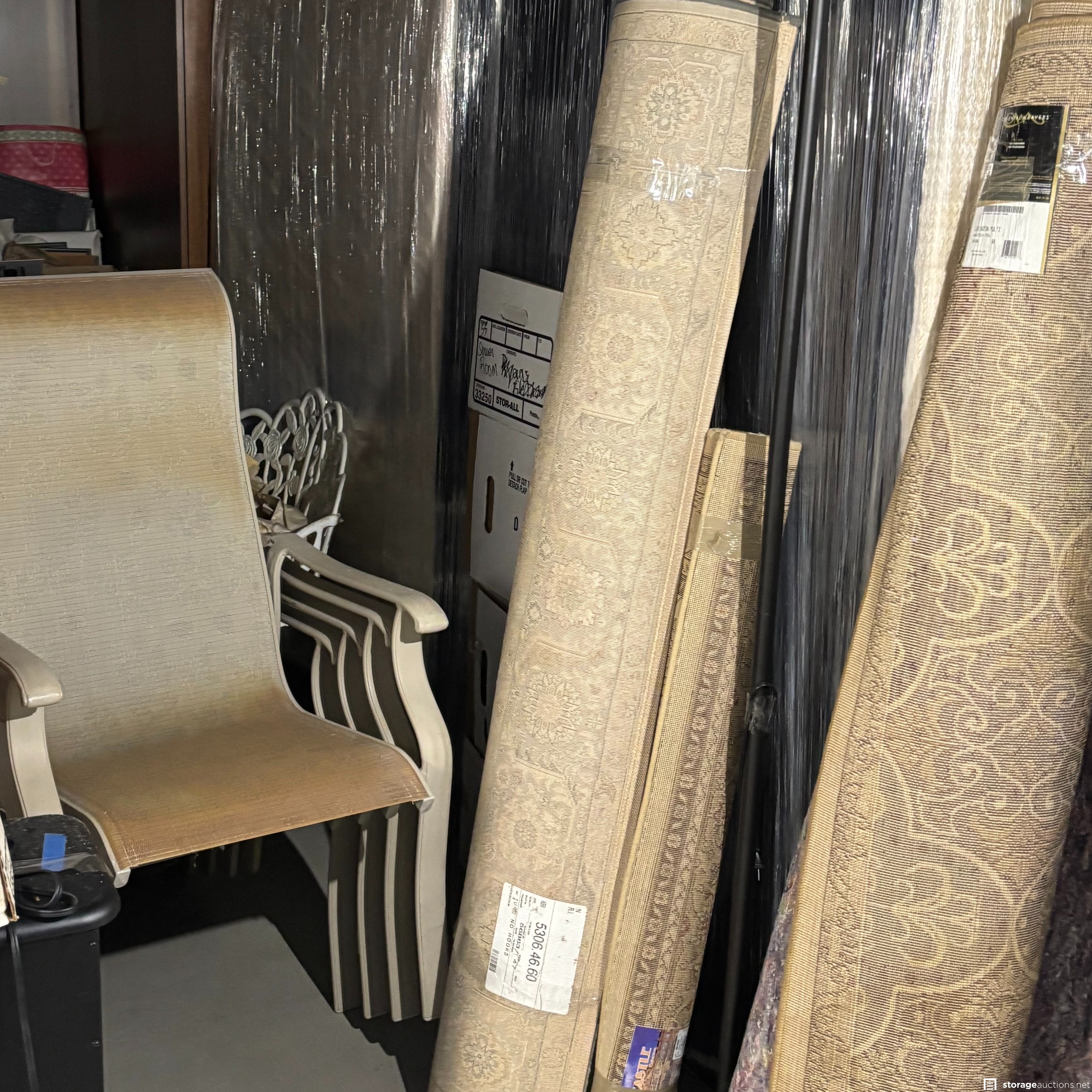 Storage unit appears to contain miscellaneous household goods, furniture, luggage, mattress, patio furniture, rugs and miscellaneous containers of unknown content.