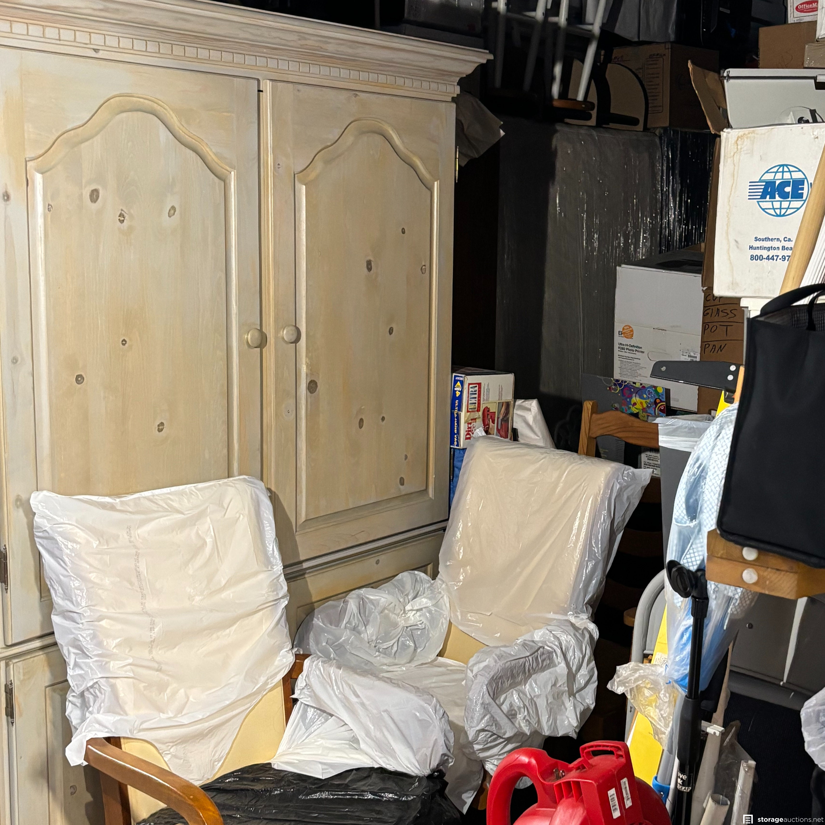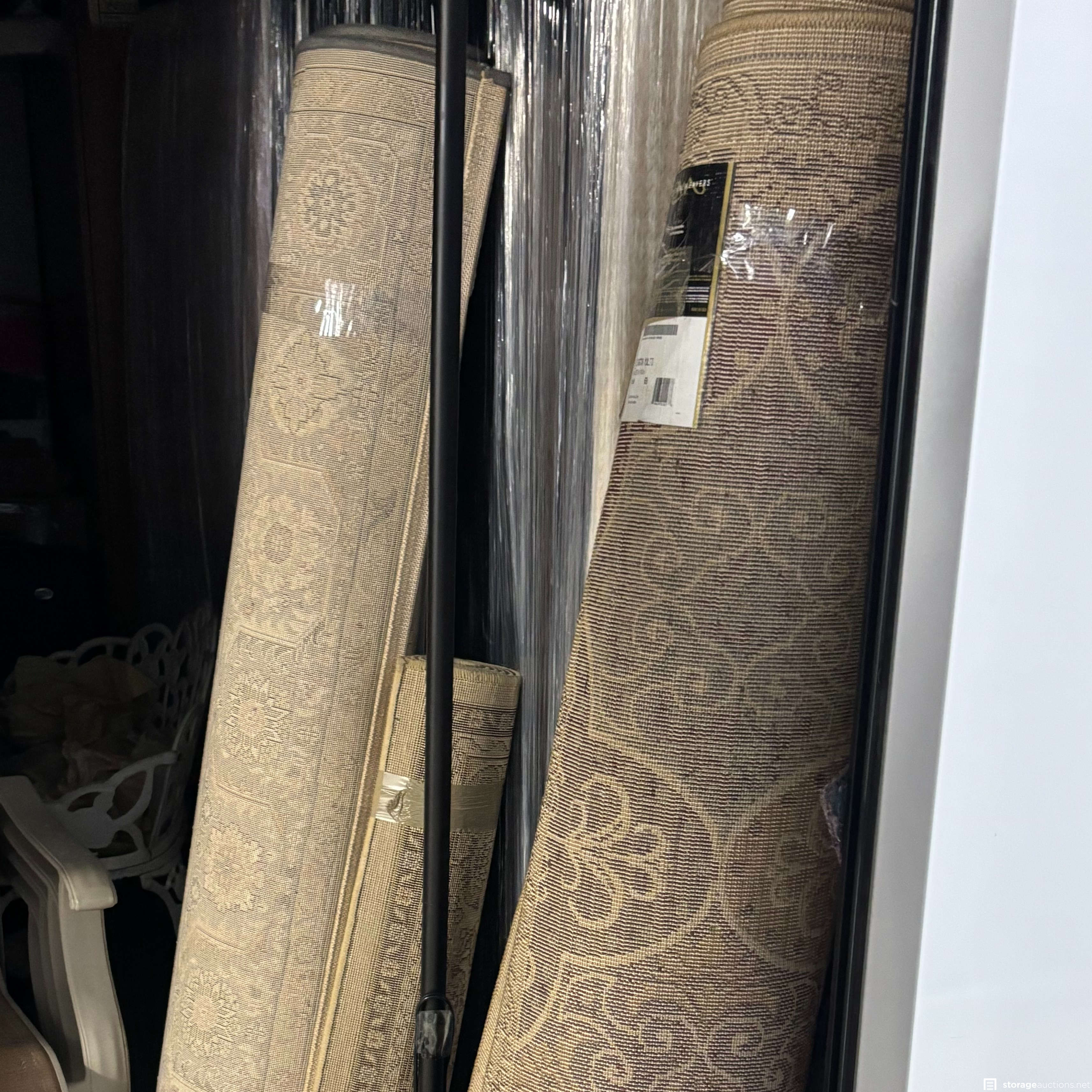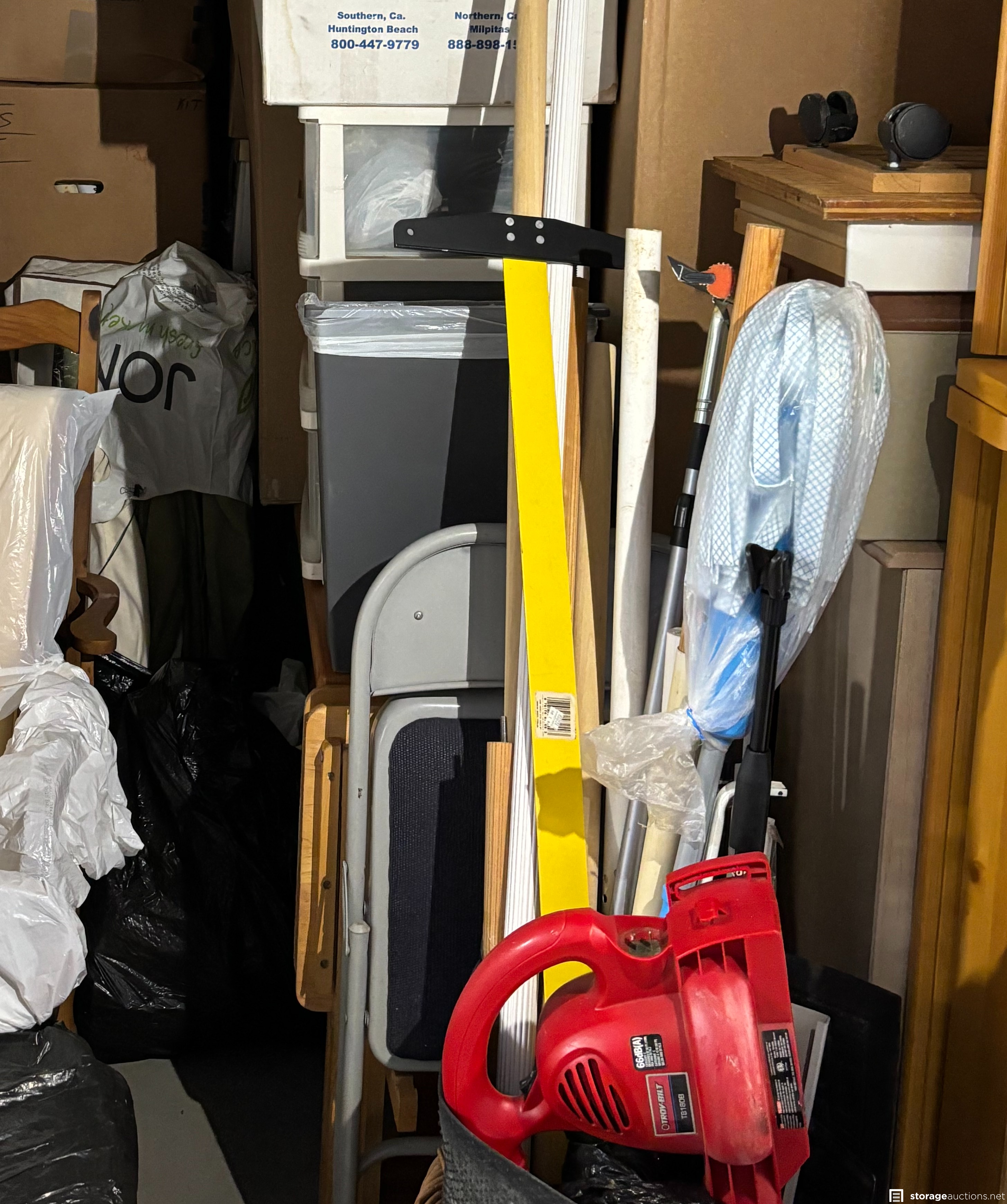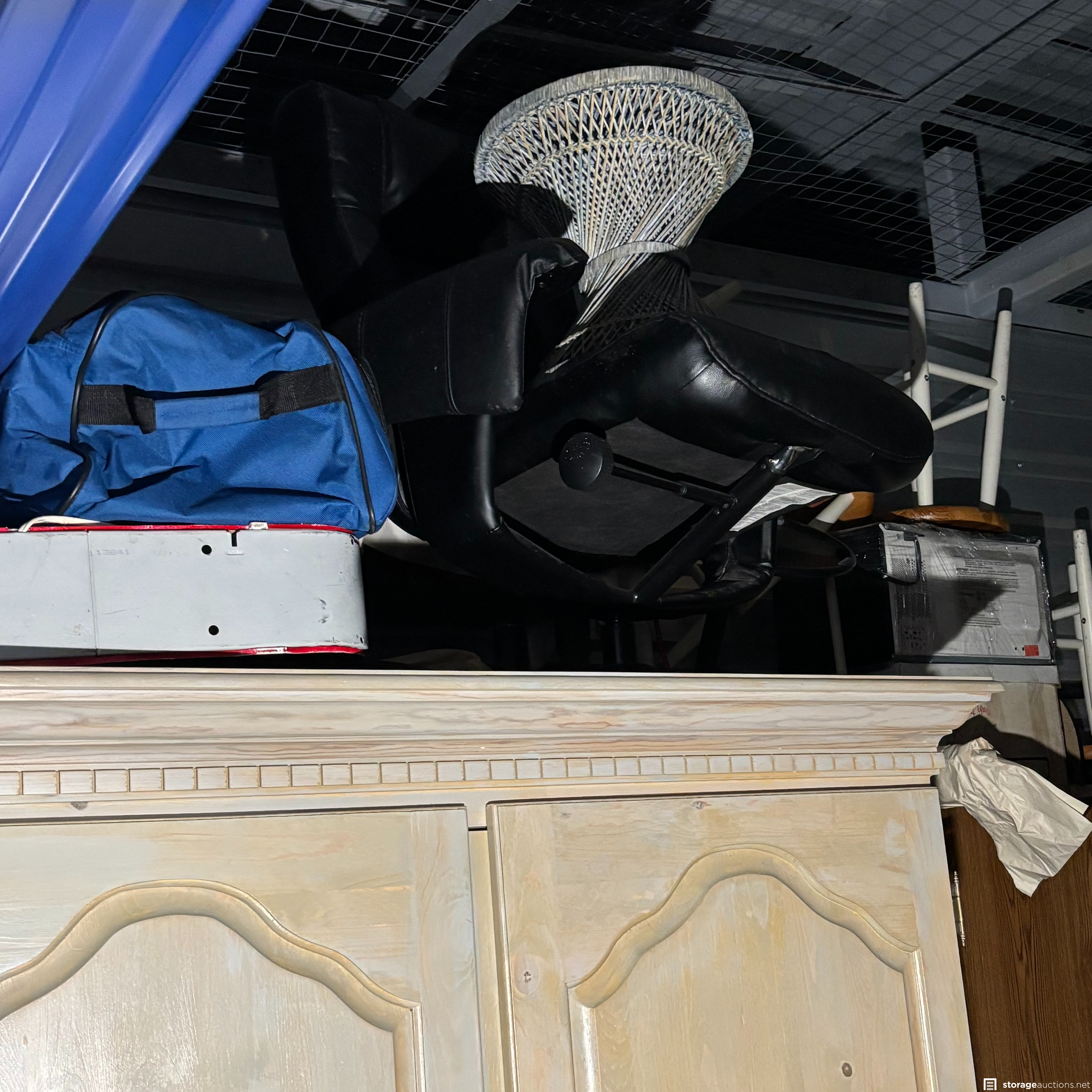 Storage unit appears to contain miscellaneous household goods, furniture, luggage, mattress, patio furniture, rugs and miscellaneous containers of unknown content.