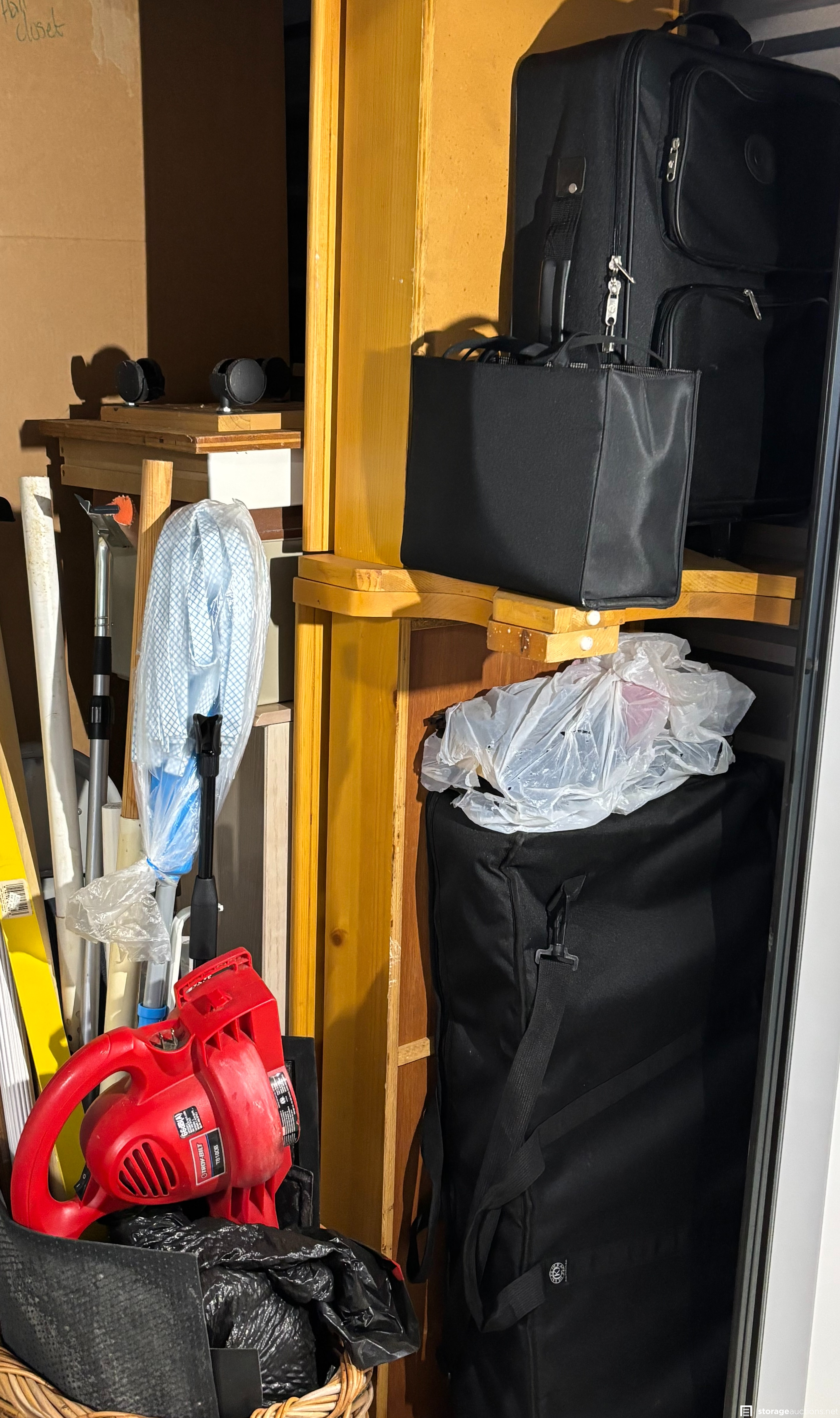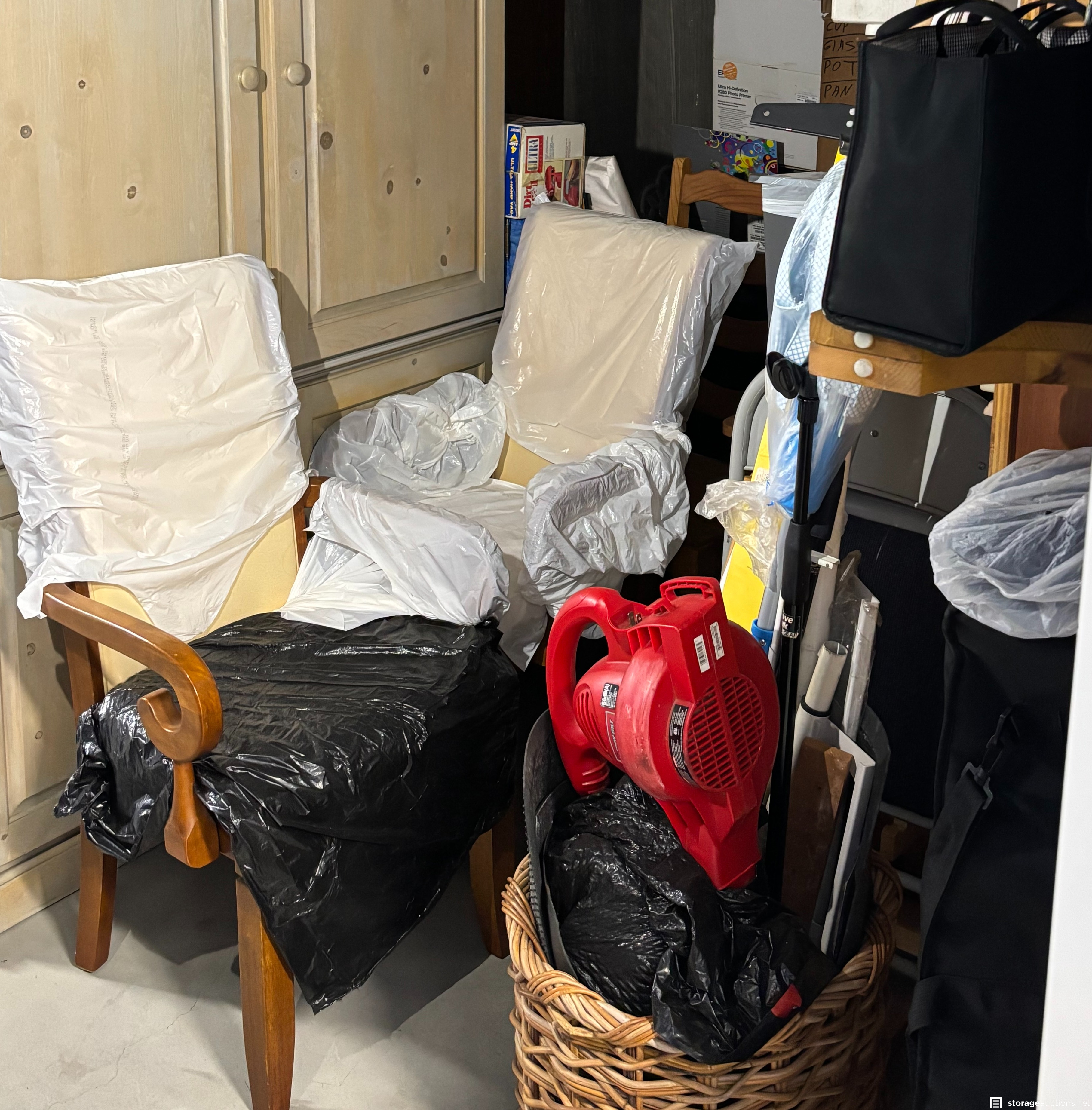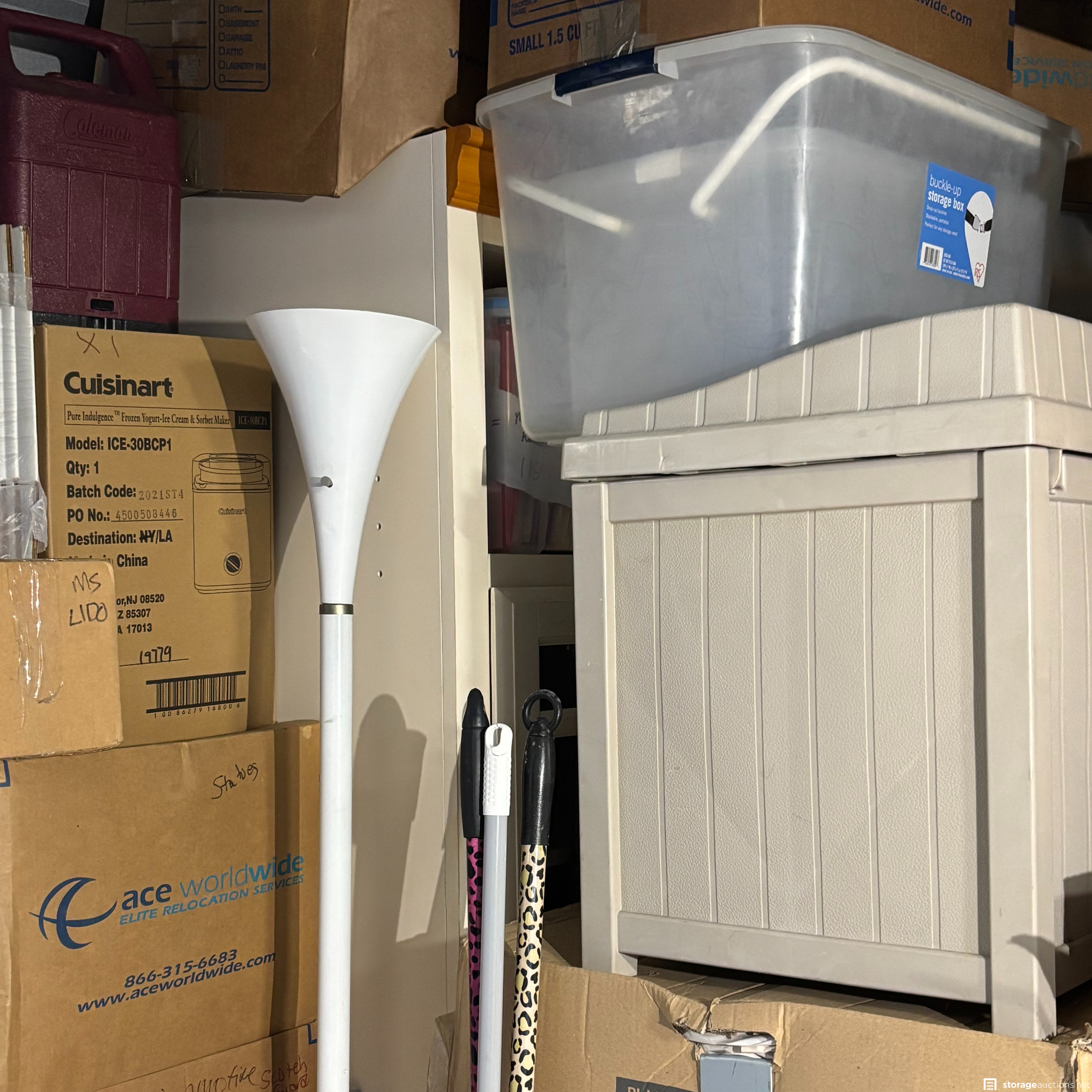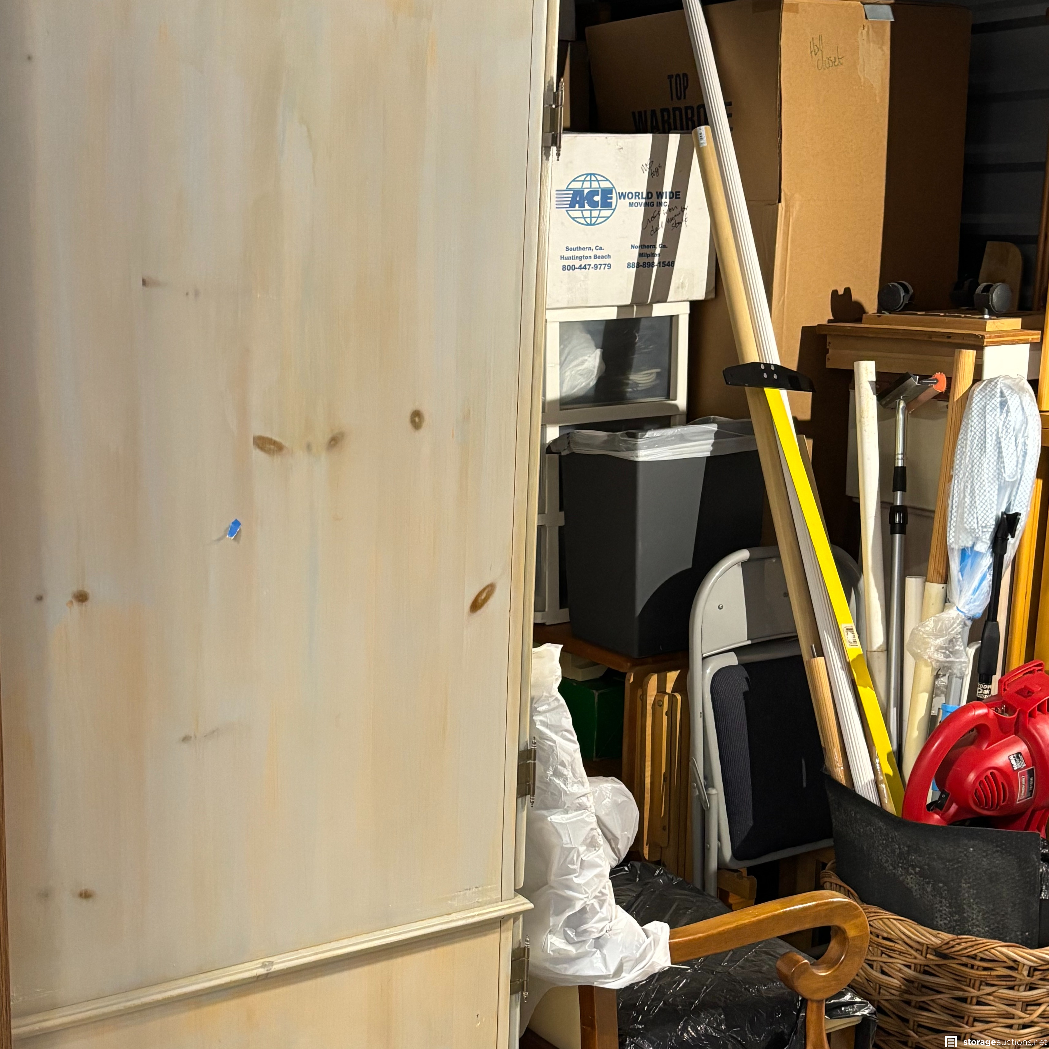 Storage unit appears to contain miscellaneous household goods, furniture, luggage, mattress, patio furniture, rugs and miscellaneous containers of unknown content.