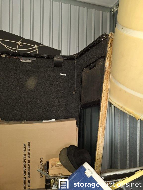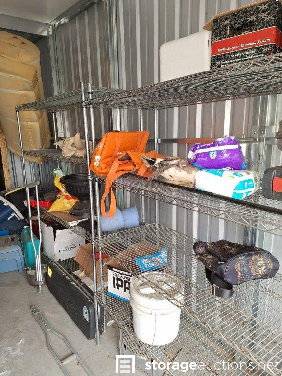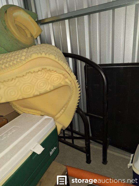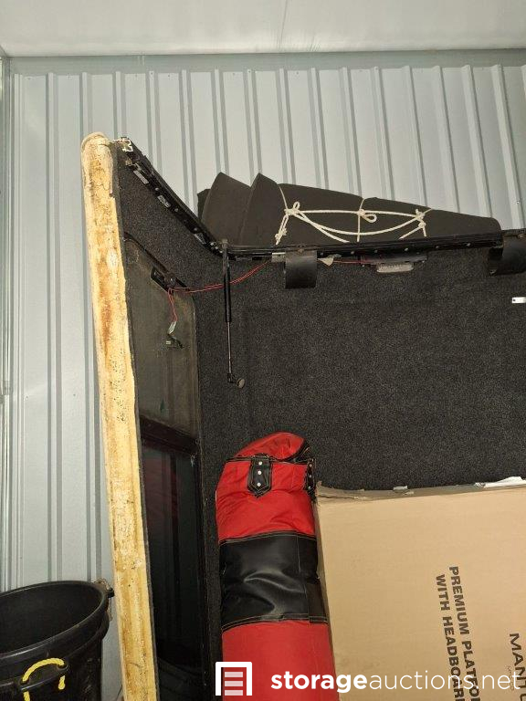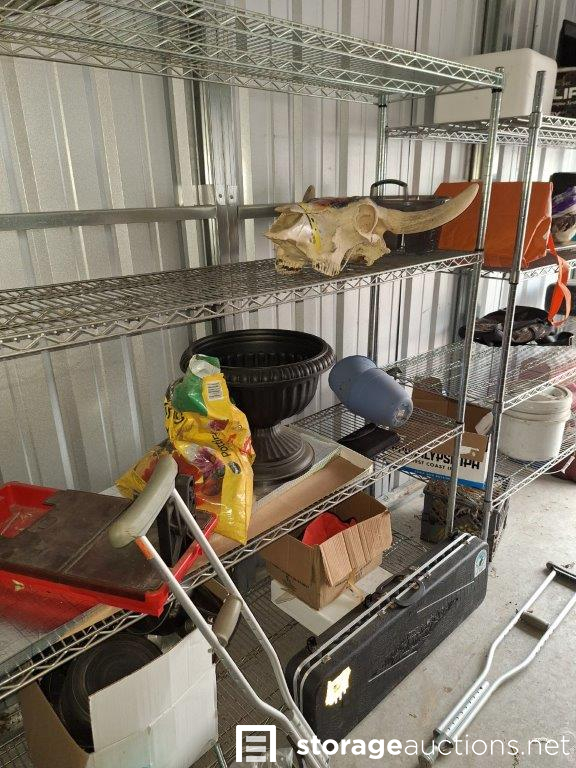 Unit appears to contain: 3 TVs, multiple bed frames, laminate flooring, taxidermy bird, animal skull, sleeping bags, mattress pads, truck canopy, lawn mower, coolers, crutches, punching bag, outdoor garden décor, holiday décor, metal shelving, coffee tables, empty gun case, pots and other misc. items.