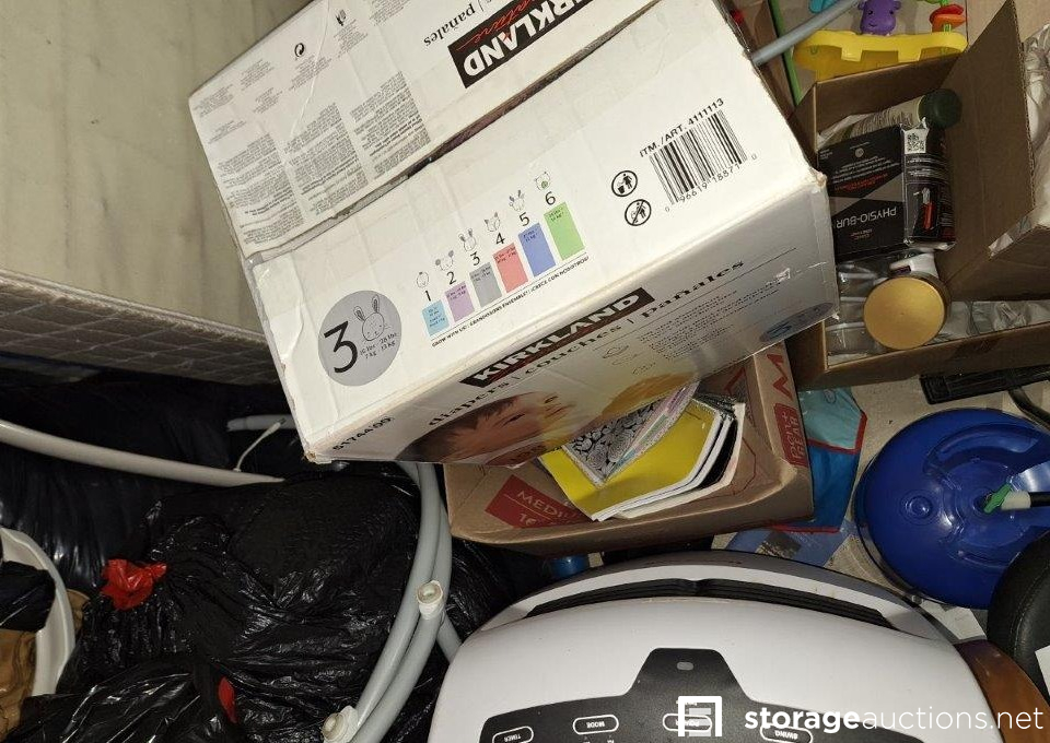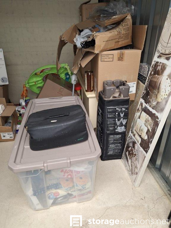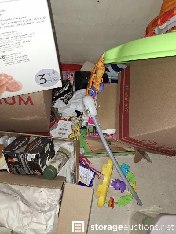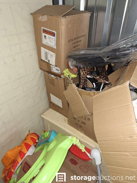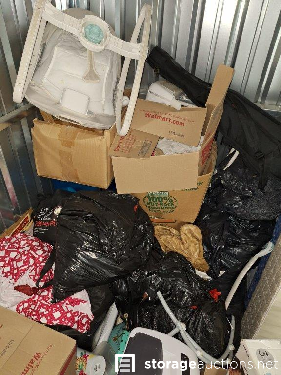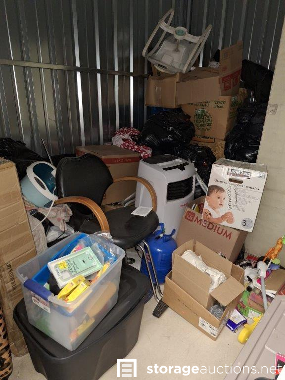 Salon chair, baby play items, pack & play, women’s shoes, stand-up AC unit, 3 mattresses, coffee table, luggage, Christmas décor, birthday party decorations, home décor, office supplies, and other misc items