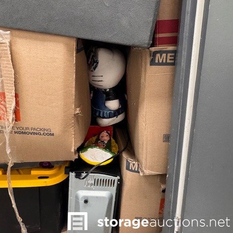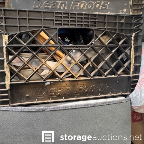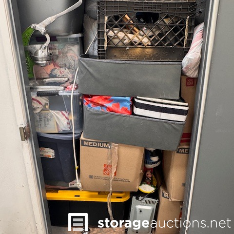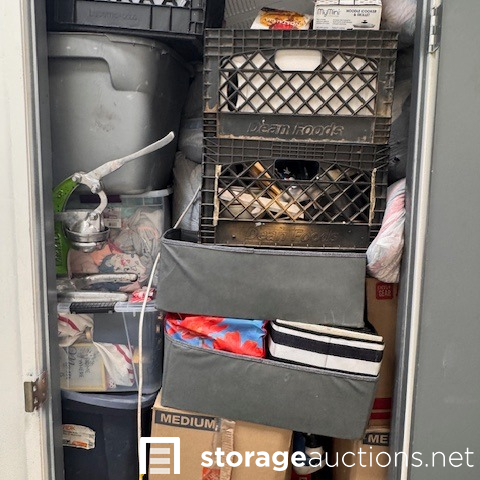 This unit appears to contain bags, clothing, 4 boxes, 6 totes, toaster oven, juicer, 3 milk creates, misc items. kitchen dishes.