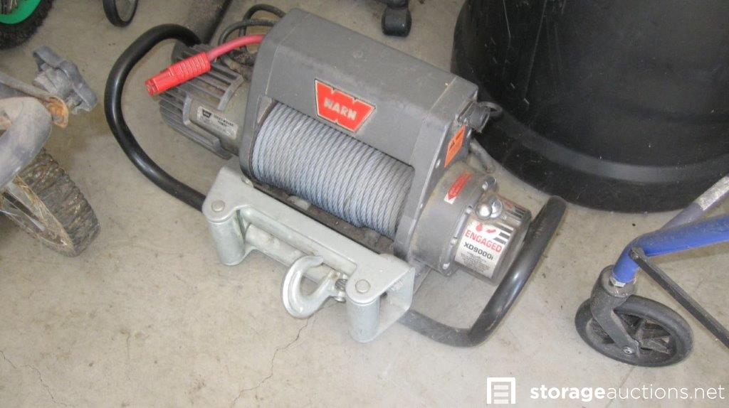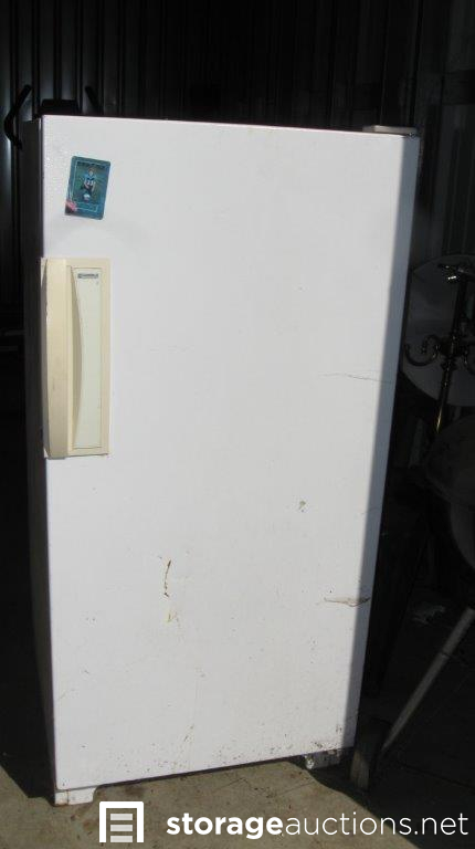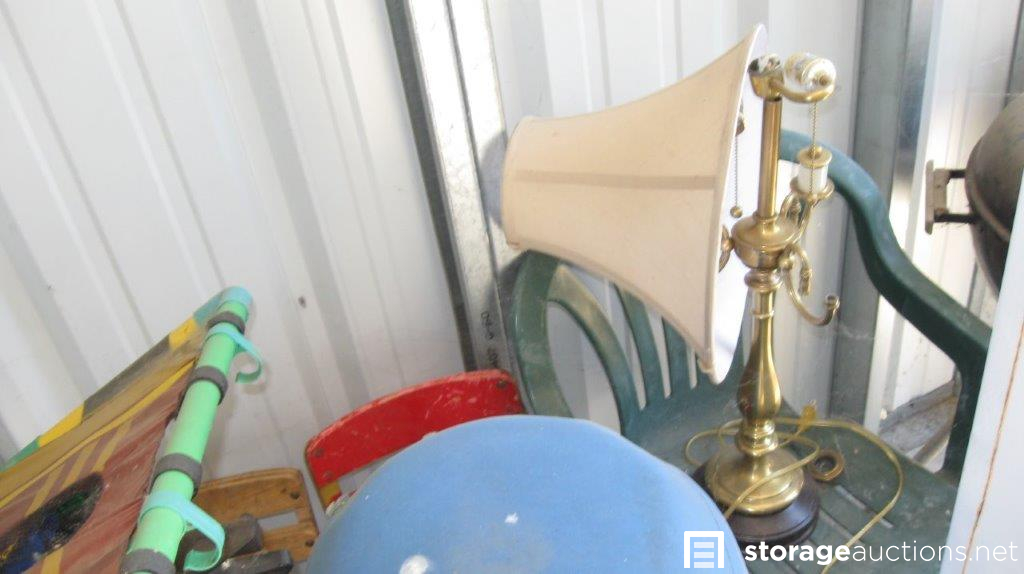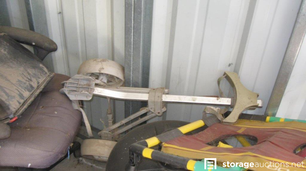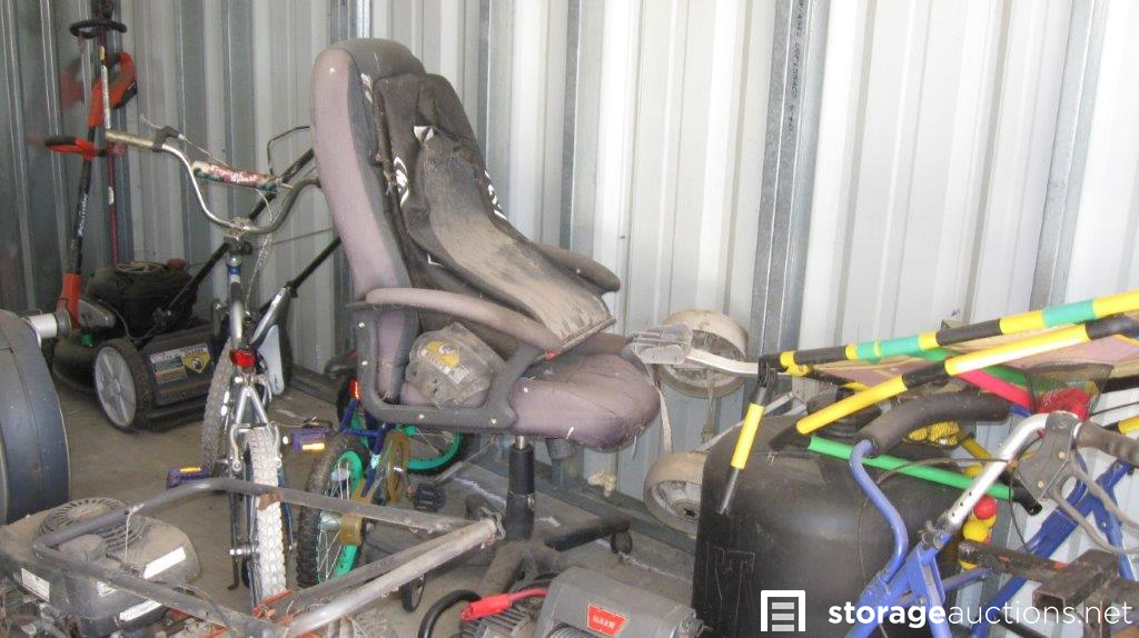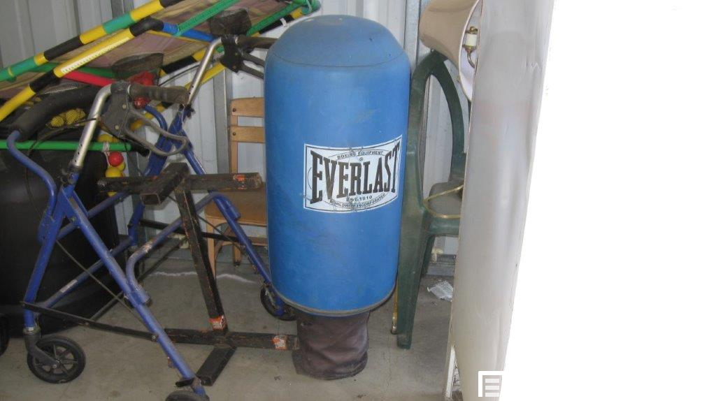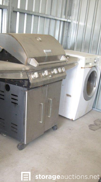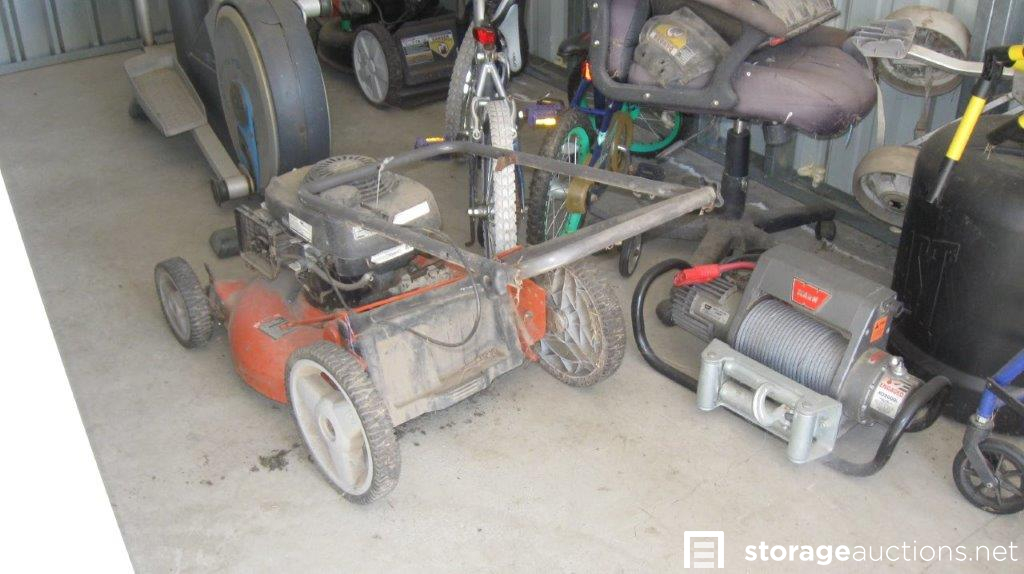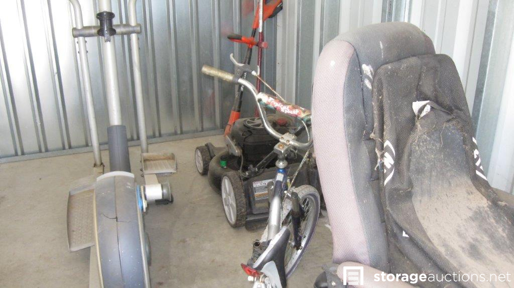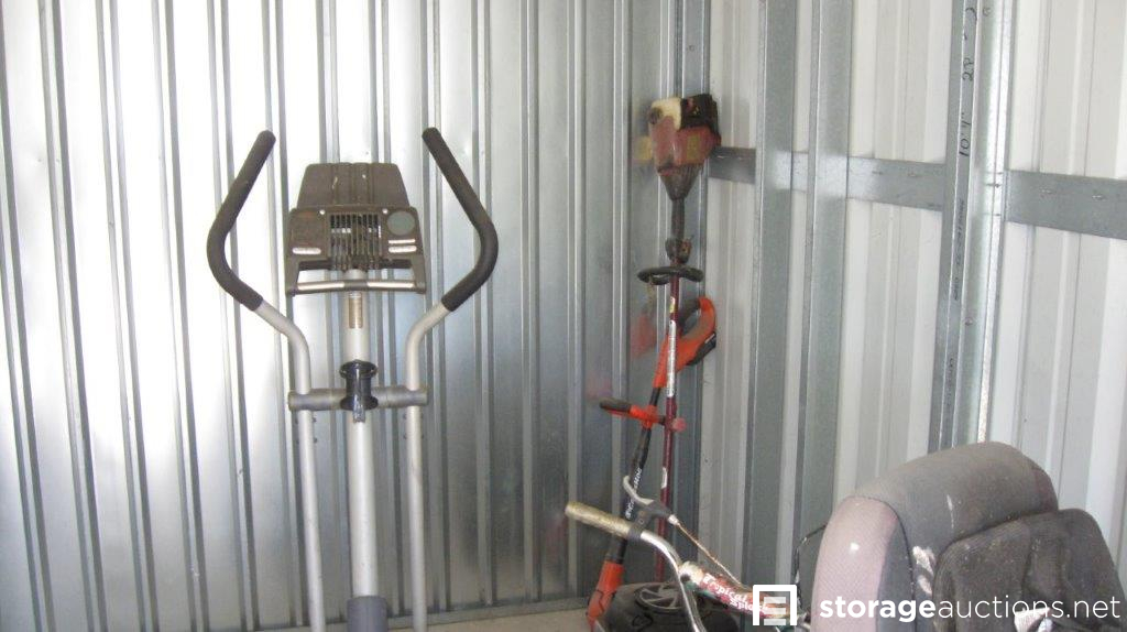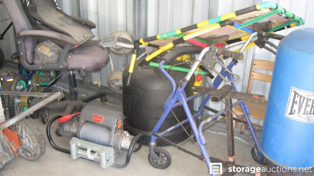 Unit appears to contain: Refrigerator, freezer, barbecue grill, lamp, punching bag, walker, desk, chair, lawnmower, weed eater, winch, exercise bike, clothes washer, other misc. items