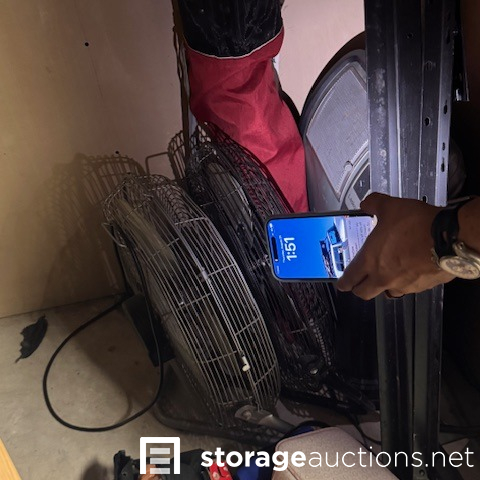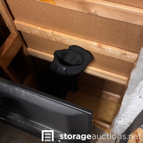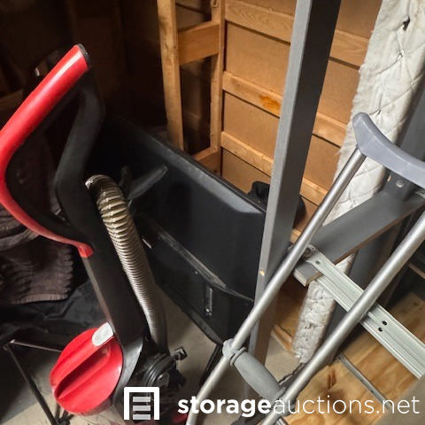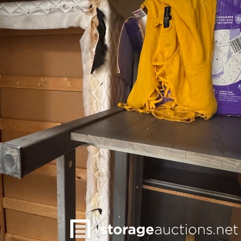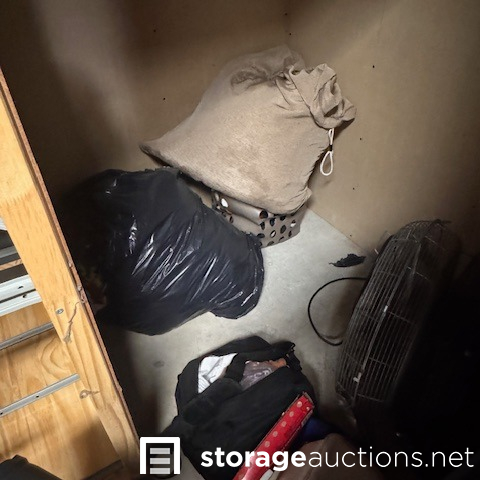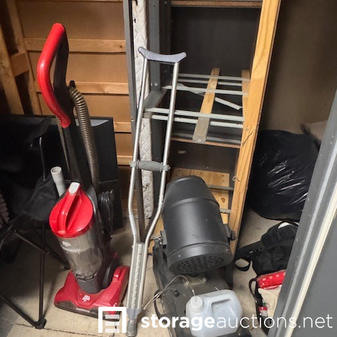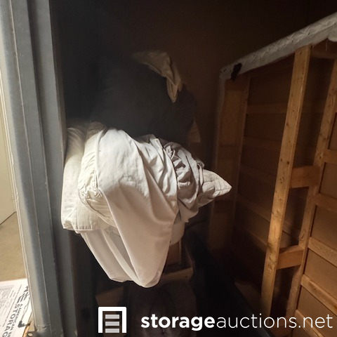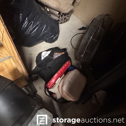 This unit appears to contain, mattress, box spring, clothing, bedding, crutch, TV, dresser, fan, camping, chairs, smoke & light machine, bed frame, foot brace, mirror, laundry bag, misc items