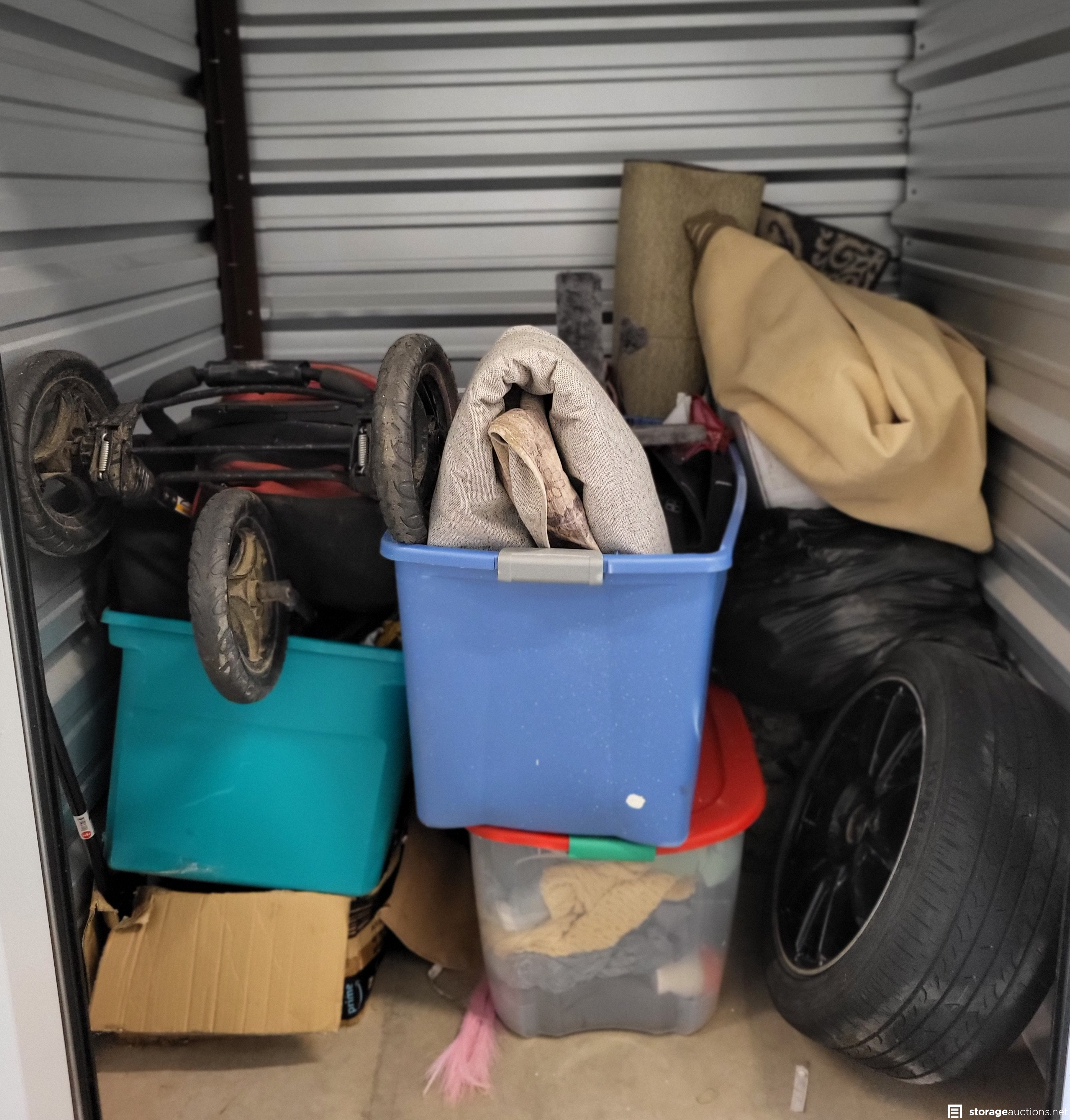 Baby stroller/jogger, car rim and tire, multiple rugs, various totes, ladies clothes.