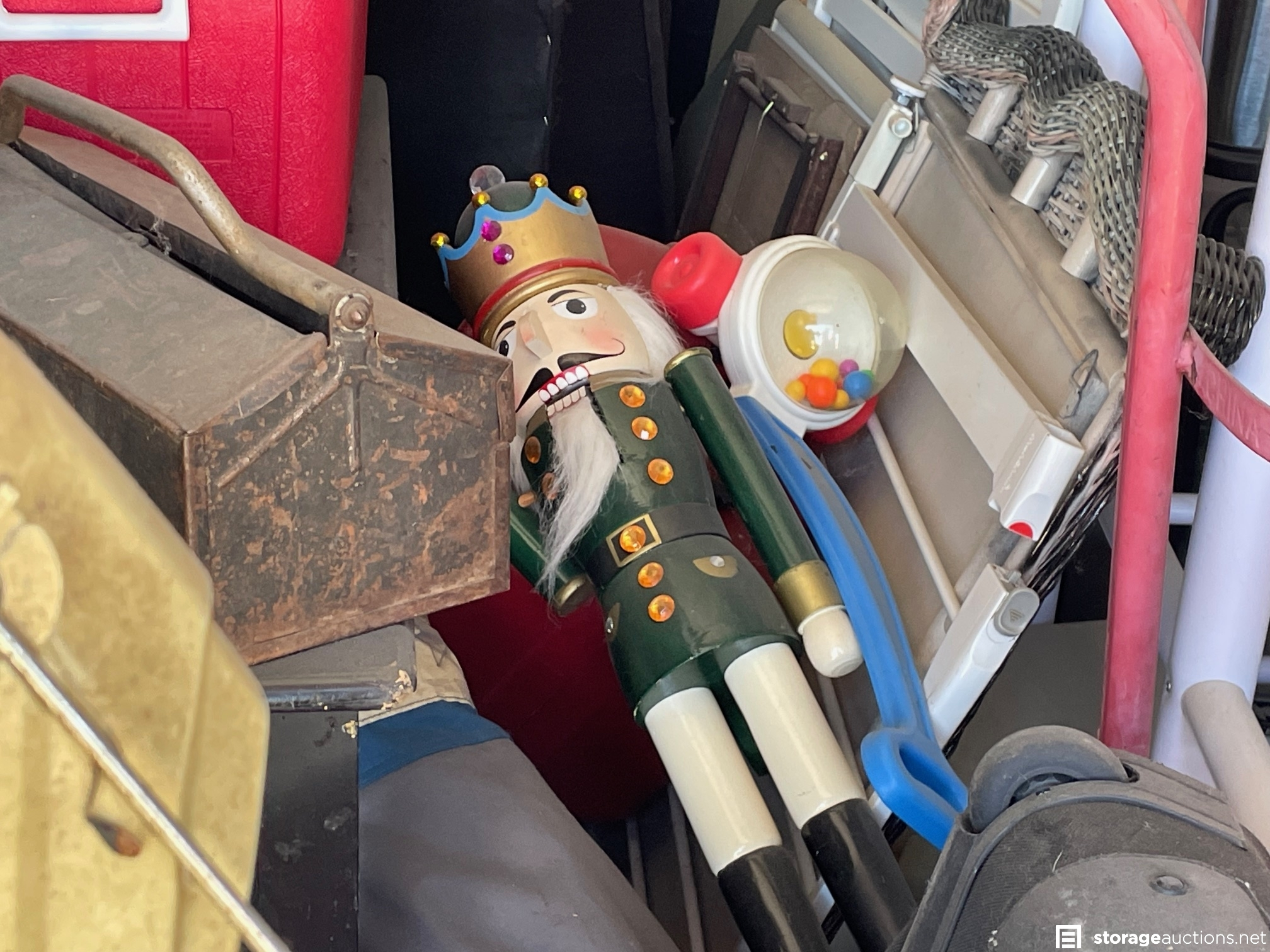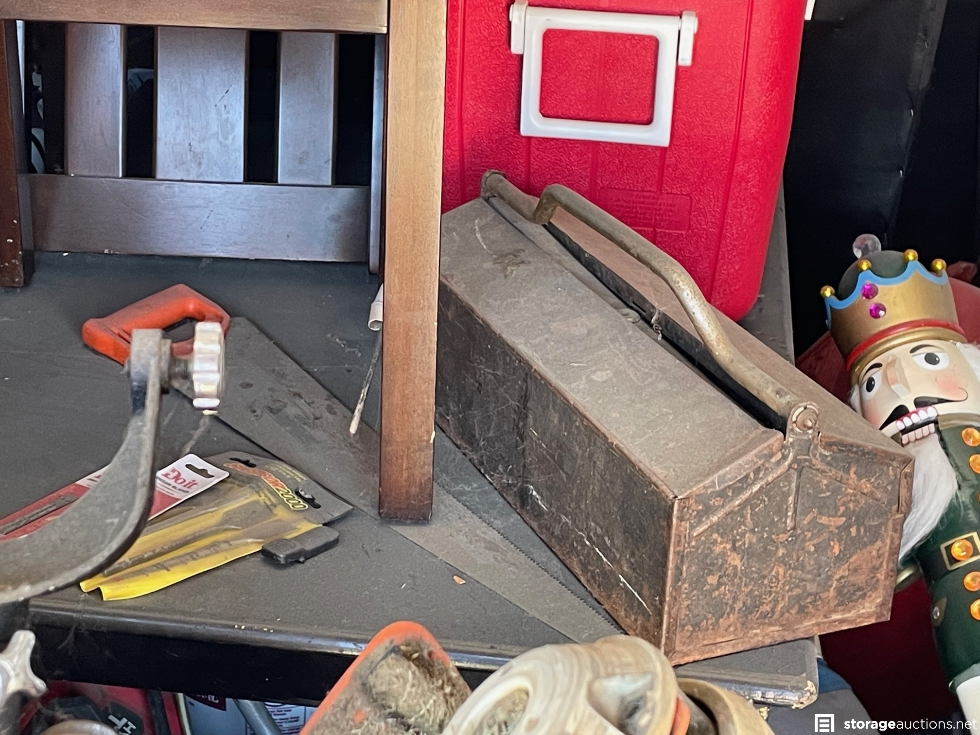 BED, TOYS, STROLLER, TABLE & CHAIRS, TOOLS, SECTIONAL, SHELVING, LOTS OF FURNITURE, TOTES, BLOWER, COOLER, NUTCRACKER, PLAYPEN, SMOKER, TOOL BOX, MISC ITEMS