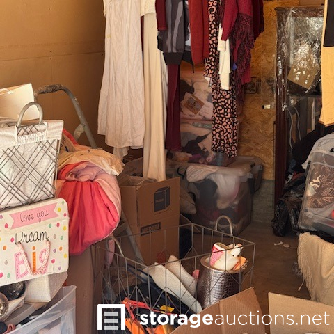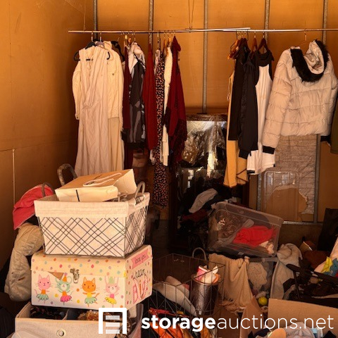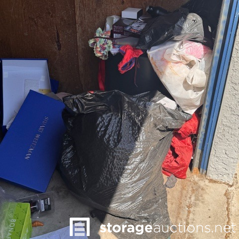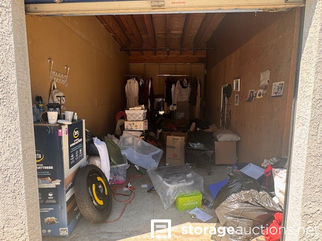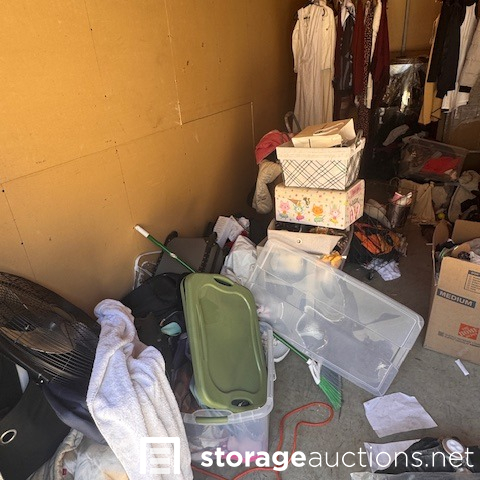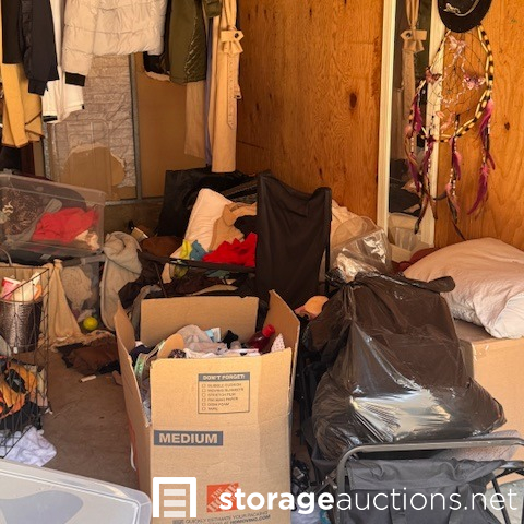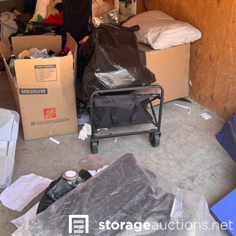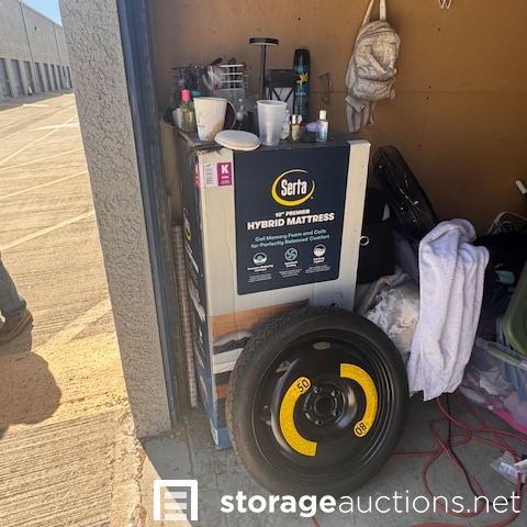 This unit appears to contain, mirror, clothing, step ladder, display cabinet, fan, extension cord, mini backpack, bags 6 boxes, 3 suitcase, 7 totes, wagon, temp spare tire, Serta mattress, shoes, misc items.