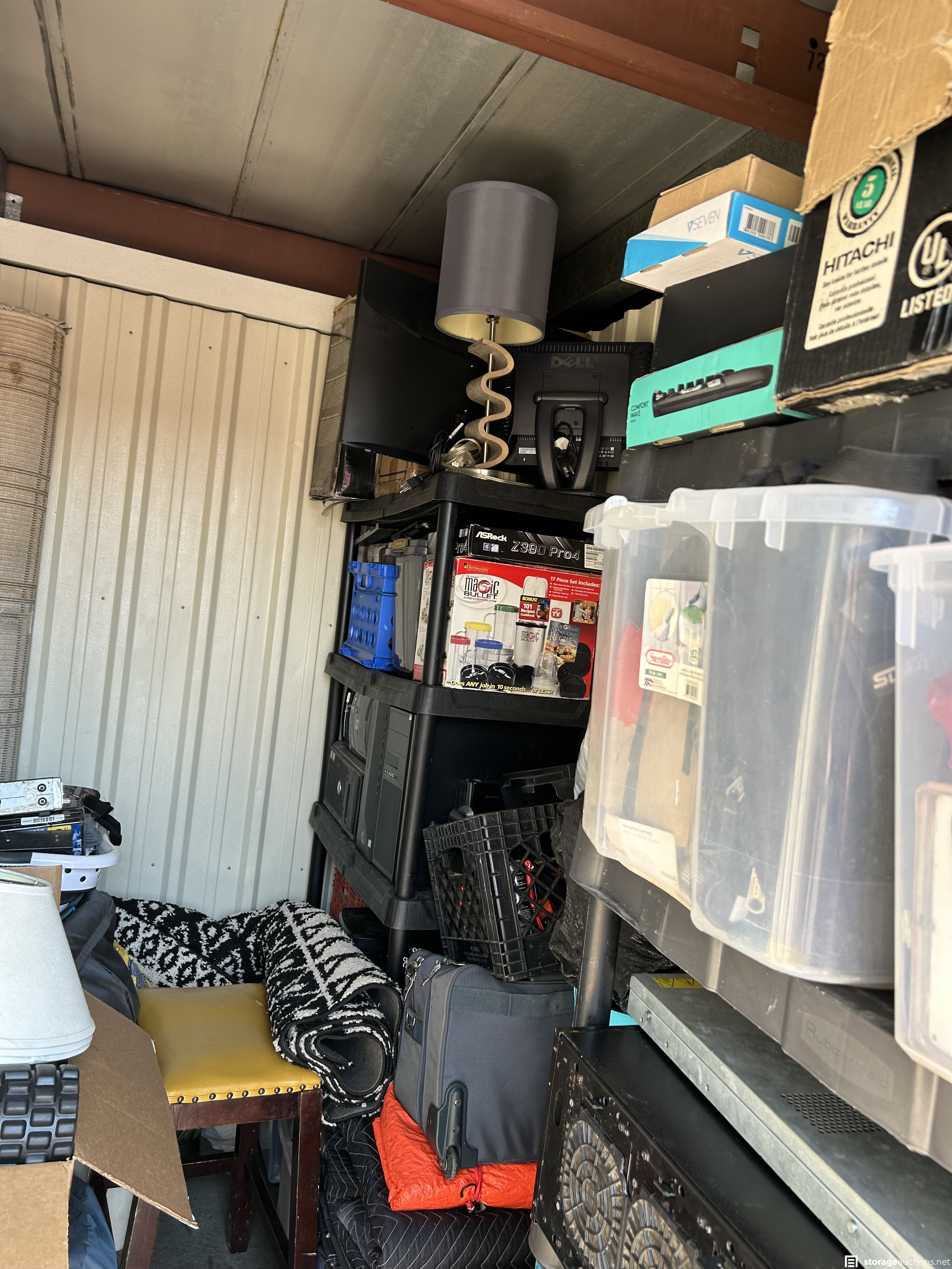 This unit has shelves, totes, lamp, boxes, rugs, bags