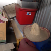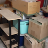 Bags, desk, boxes, totes, baseball bat, pictures/art, bookshelf.