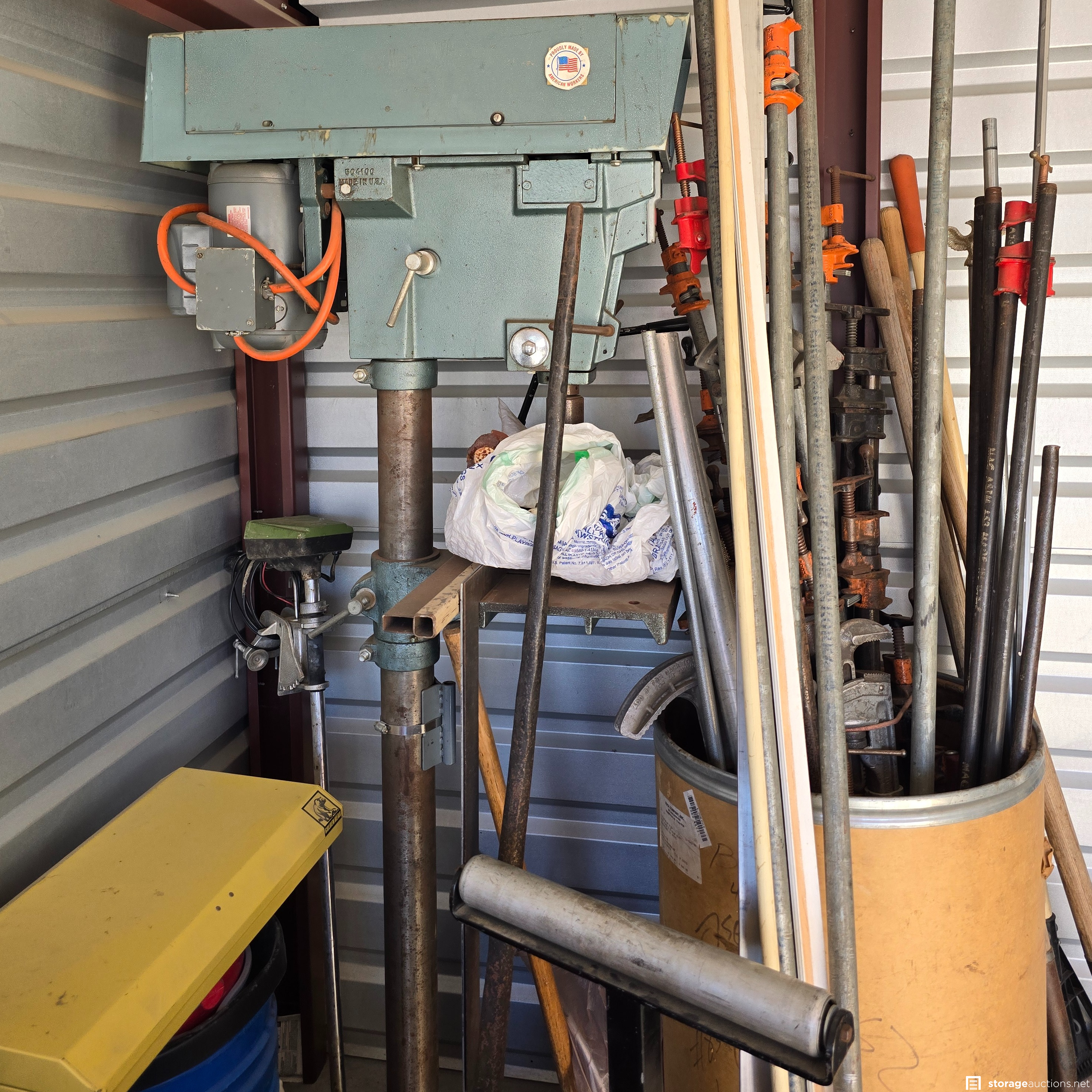 Drill press made in the Usa and accessories, 50 gallon fish tank in oak cabinet with all the stuff needed to run. woodworking tools, antique train set, horseshoe set, multiple toolboxes. shop rugs. and much much more.