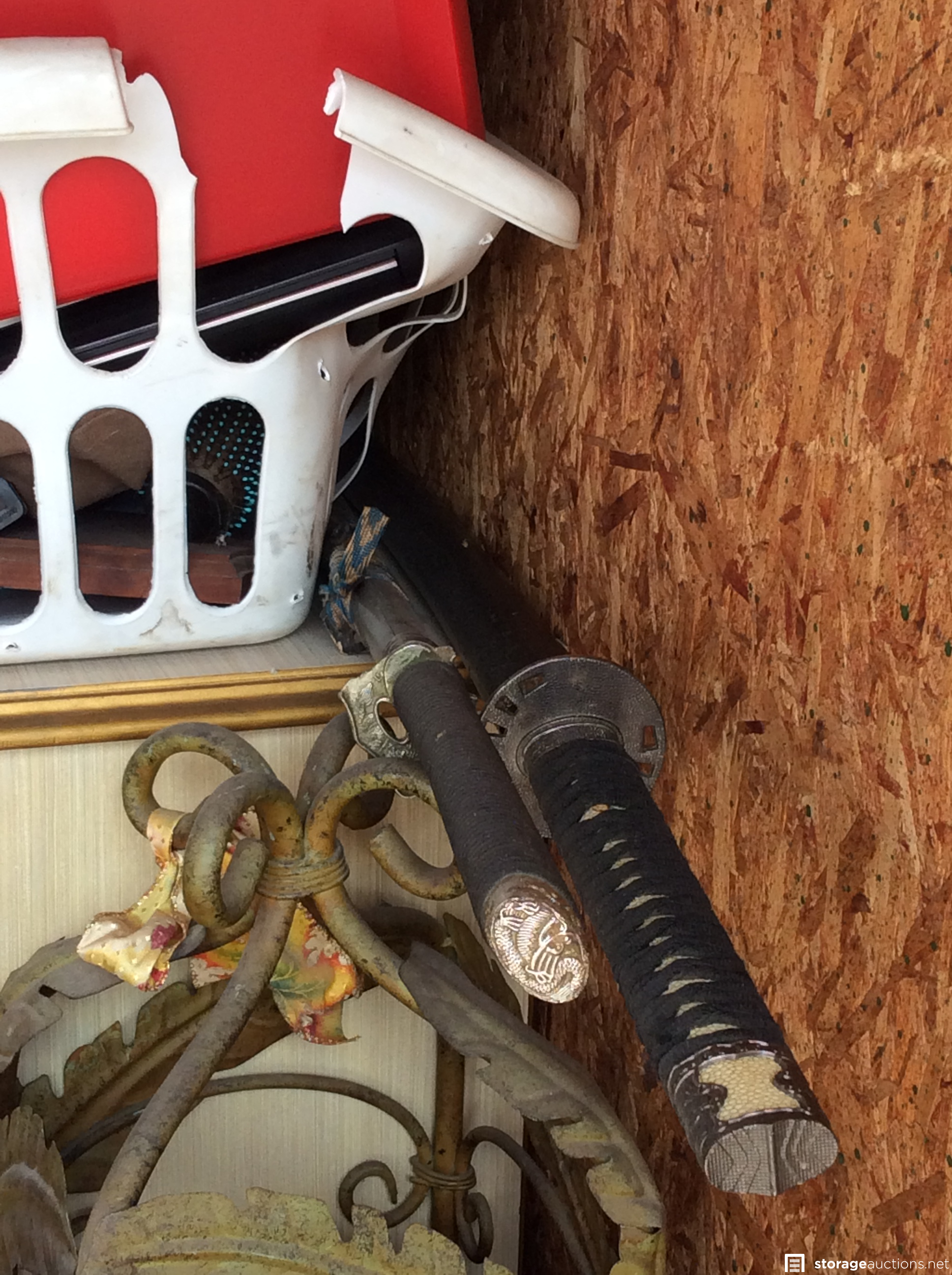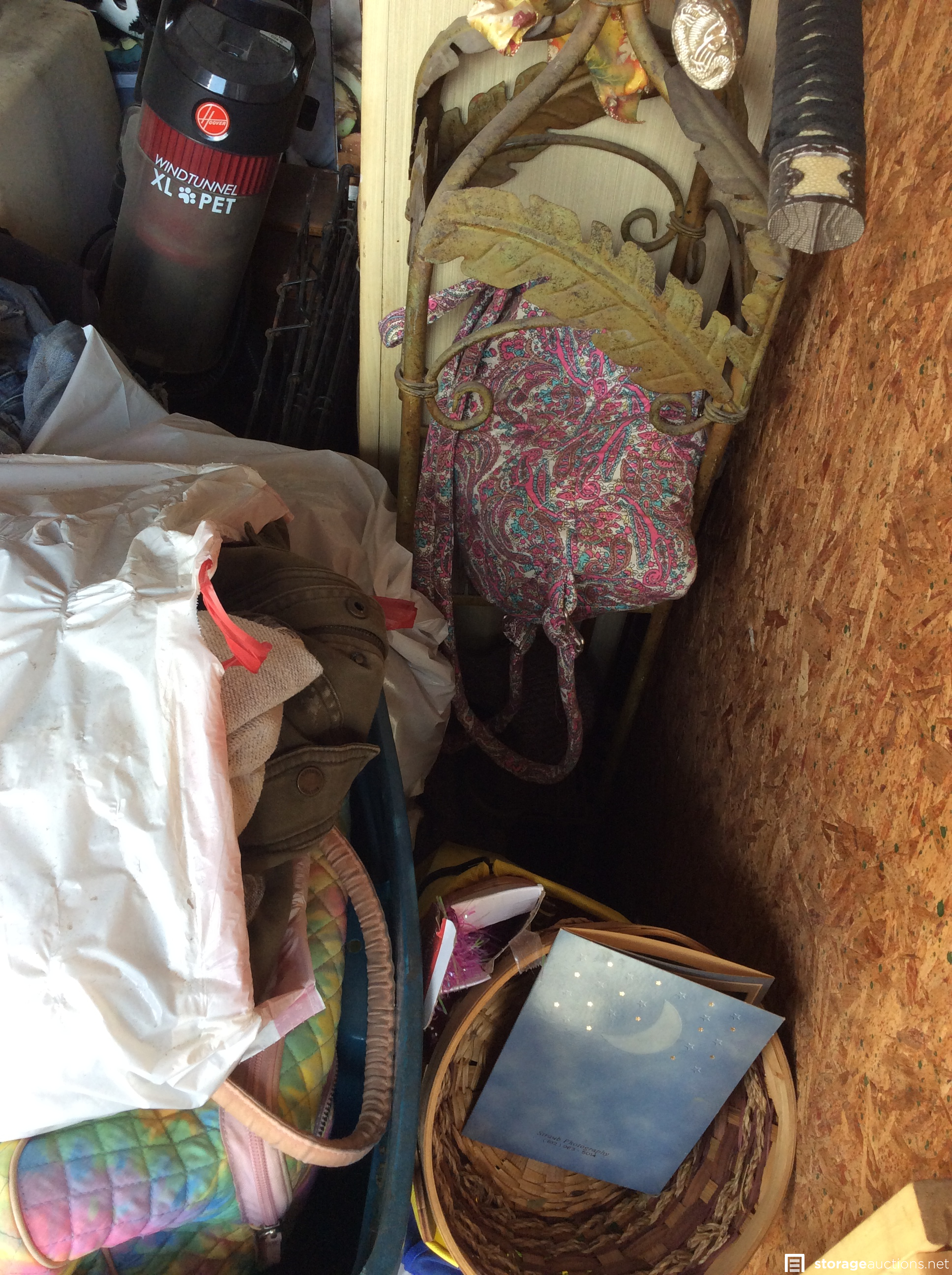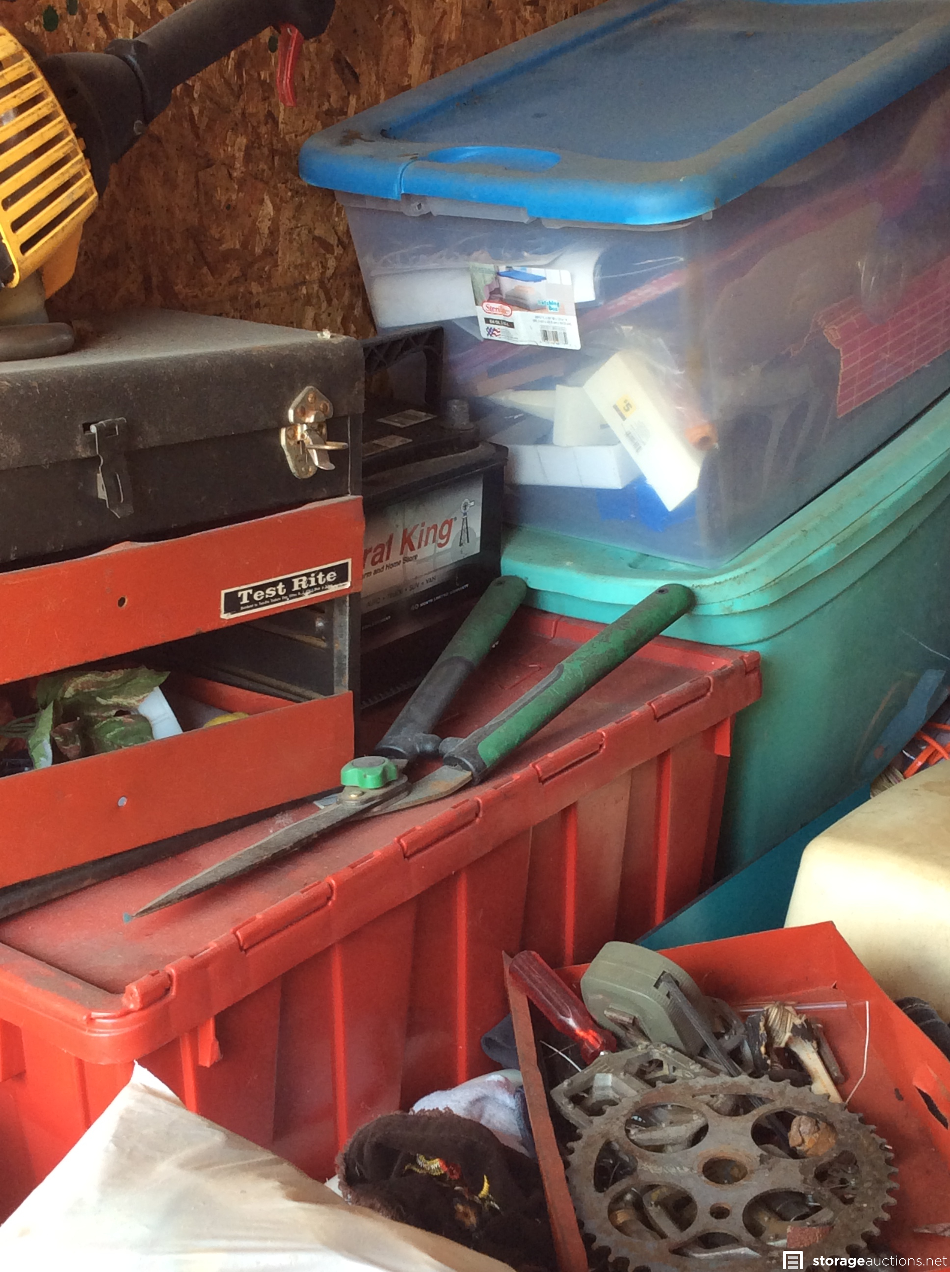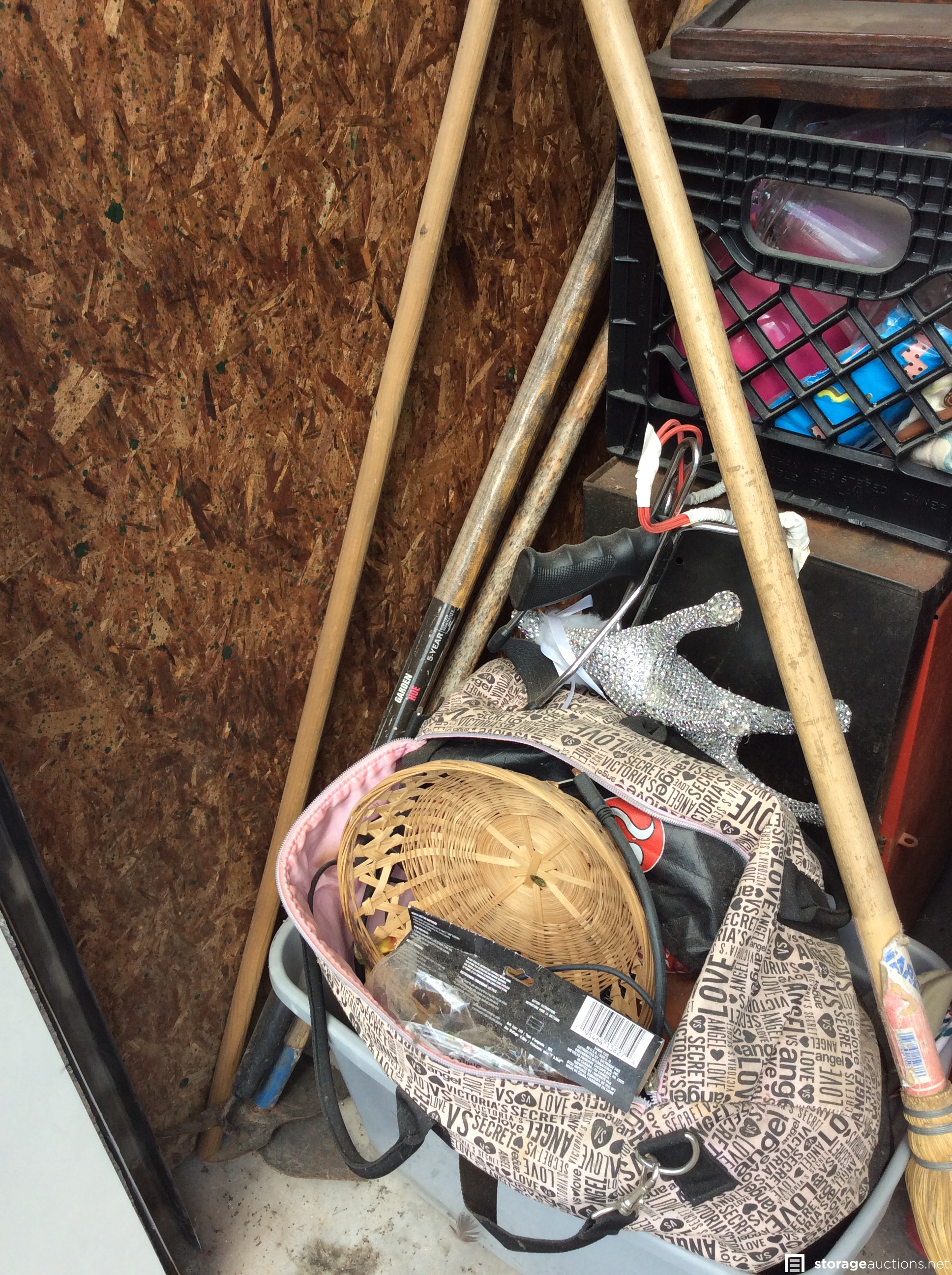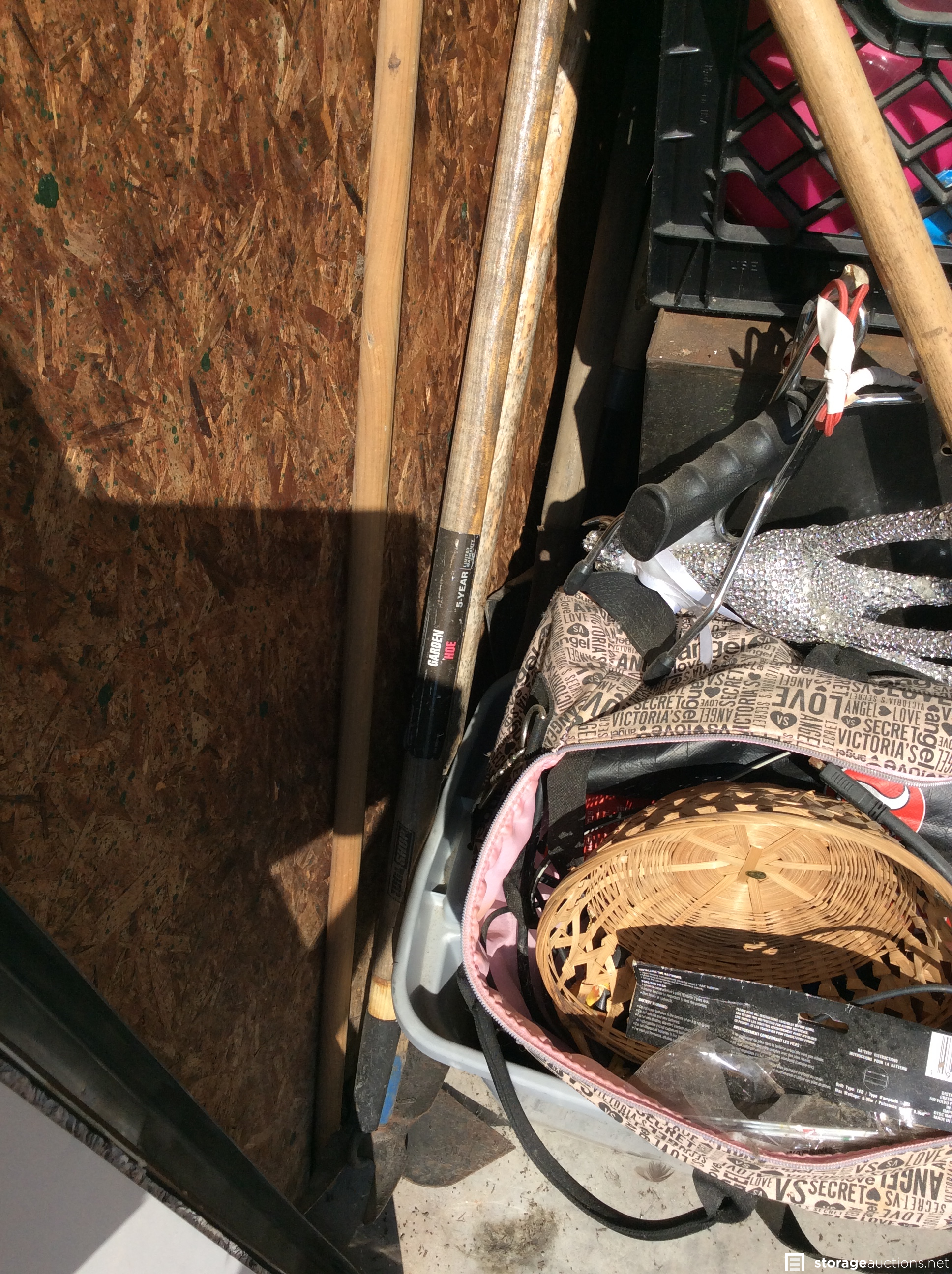 Swords, shovel, rake, garden hoes, Rural King battery, yard tools, several totes, decorative boxes, decorative metal shelf, two vacuum cleaner, weed eater, small metal toolbox, cooler, plastic shelf unit, bed frame?, headboard, child or pet gate, small chest of drawers, little wooden ladder or shelf, something in a Sears case(sewing machine)?
