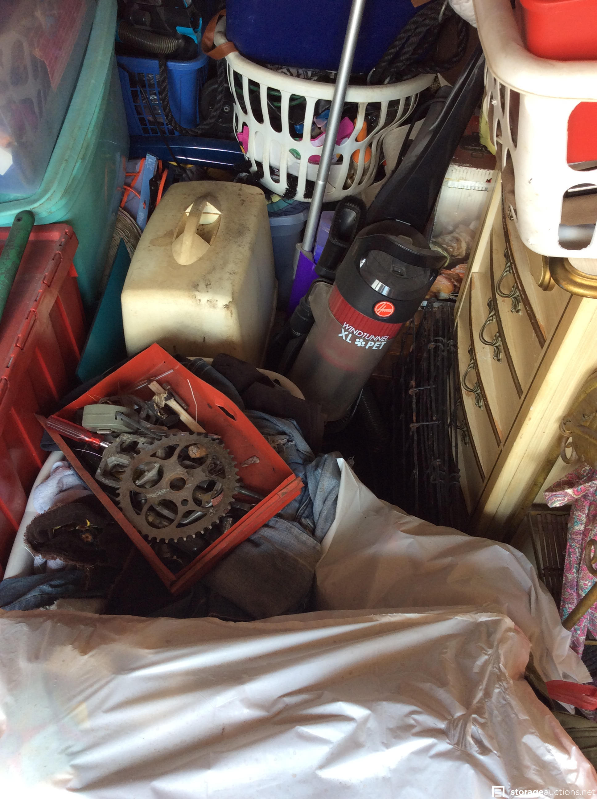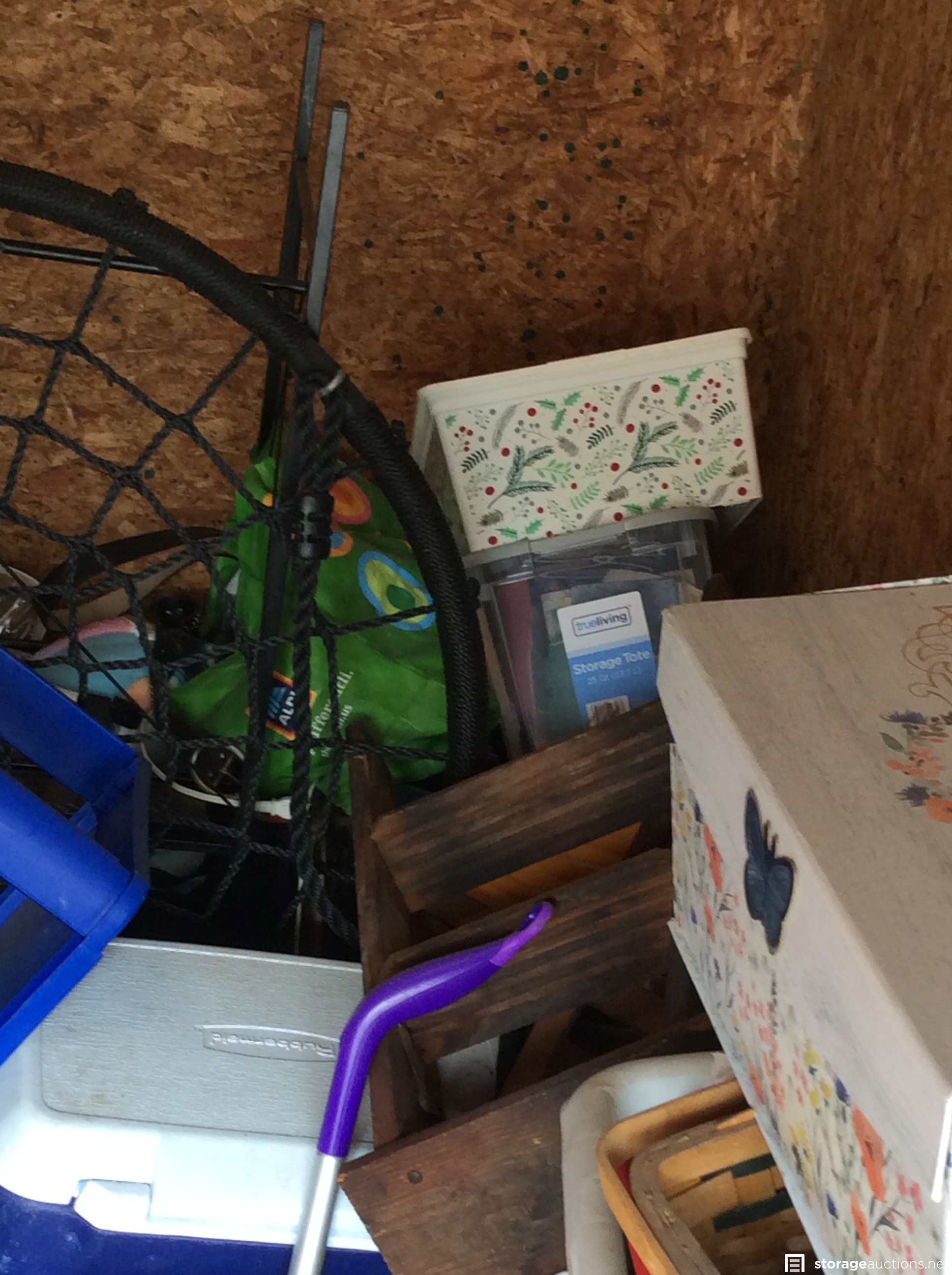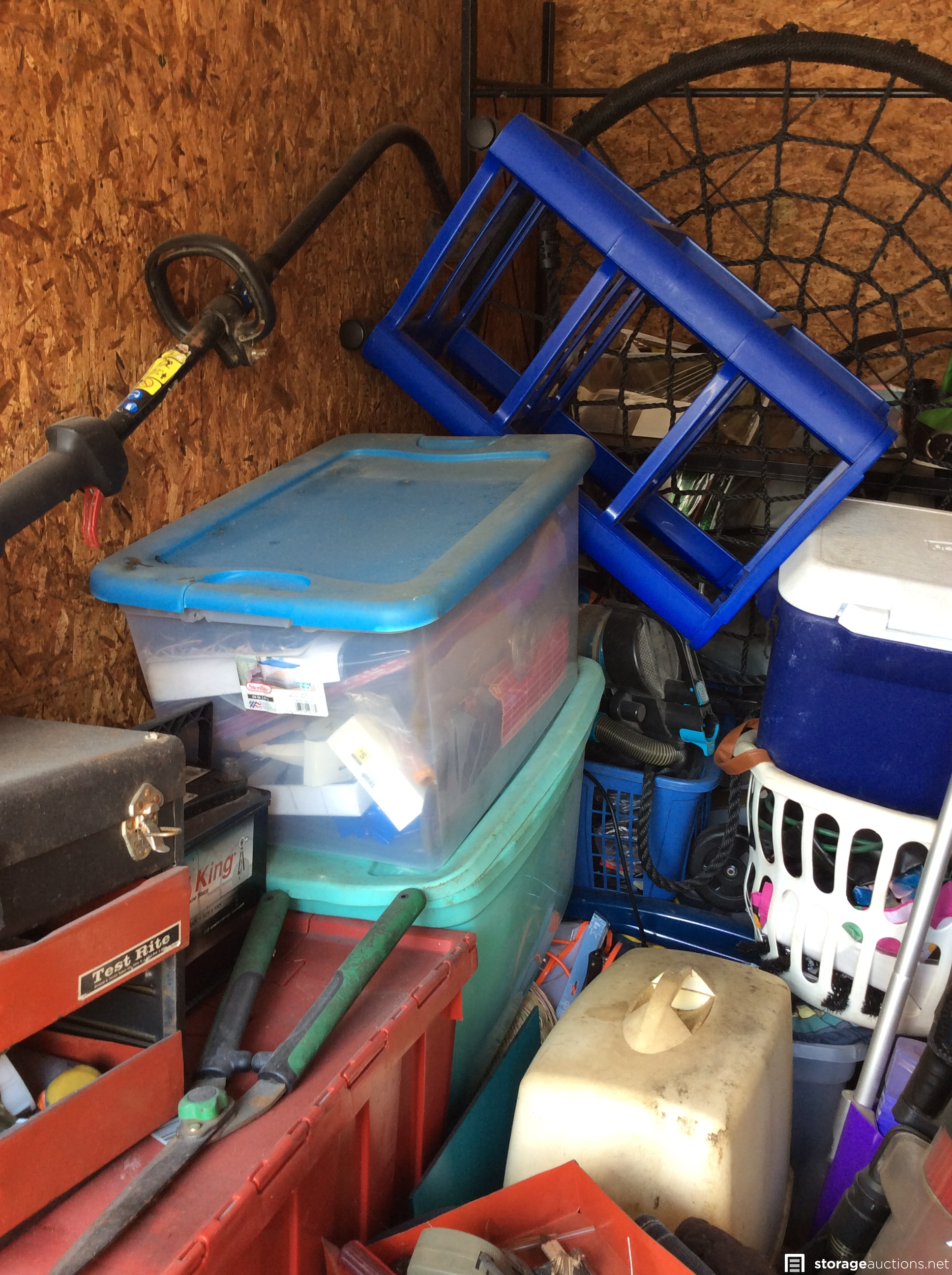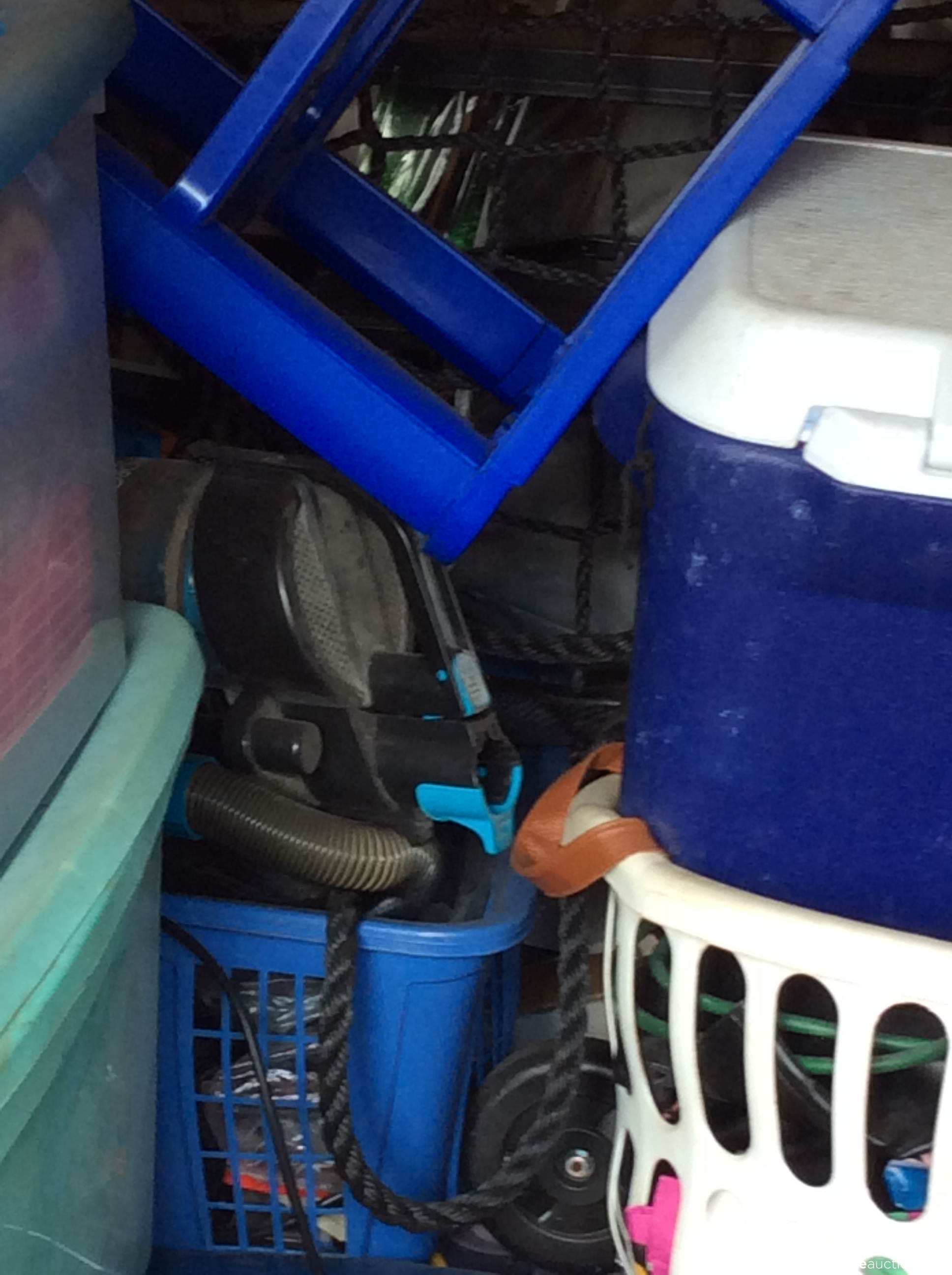 Swords, shovel, rake, garden hoes, Rural King battery, yard tools, several totes, decorative boxes, decorative metal shelf, two vacuum cleaner, weed eater, small metal toolbox, cooler, plastic shelf unit, bed frame?, headboard, child or pet gate, small chest of drawers, little wooden ladder or shelf, something in a Sears case(sewing machine)?