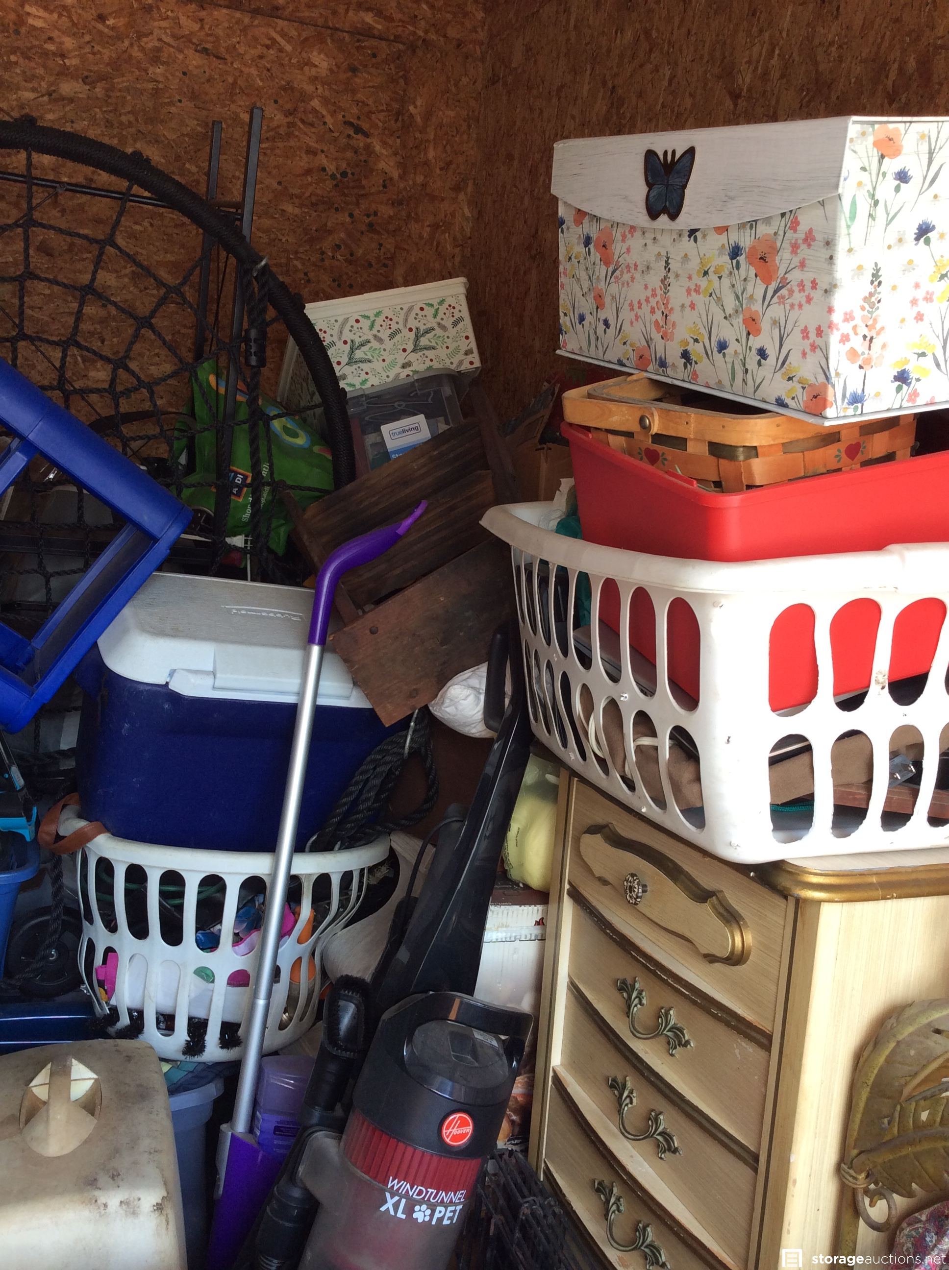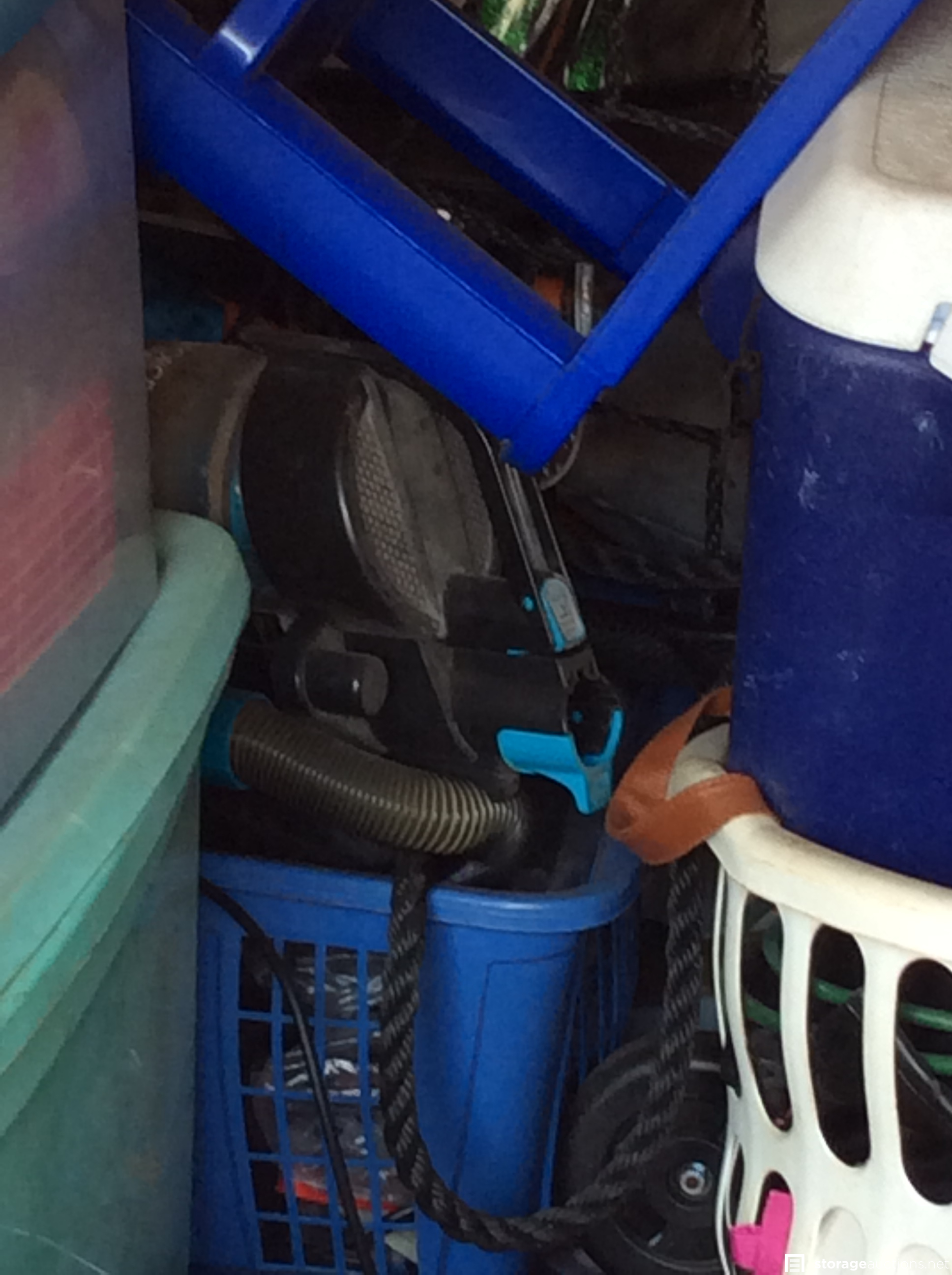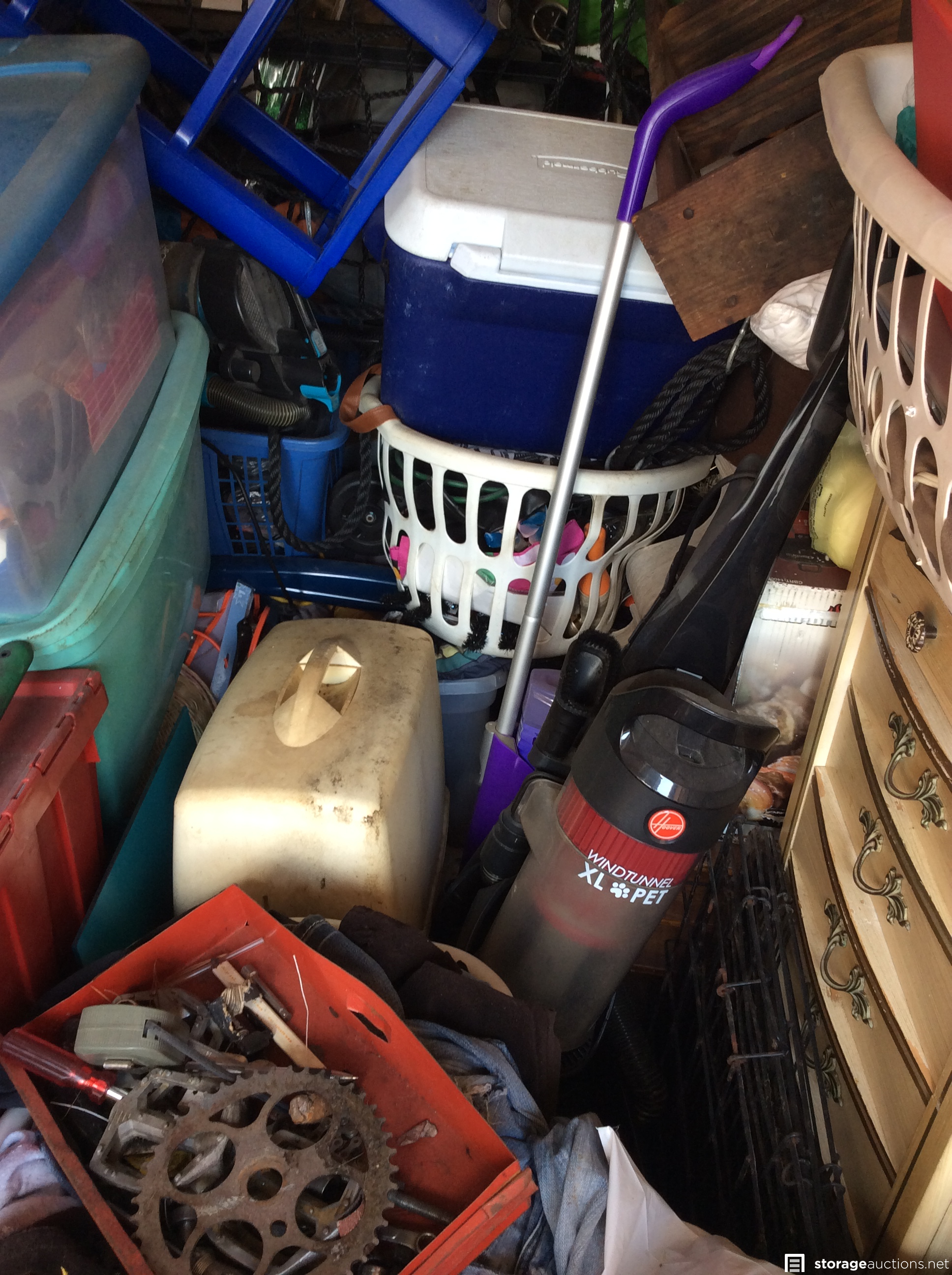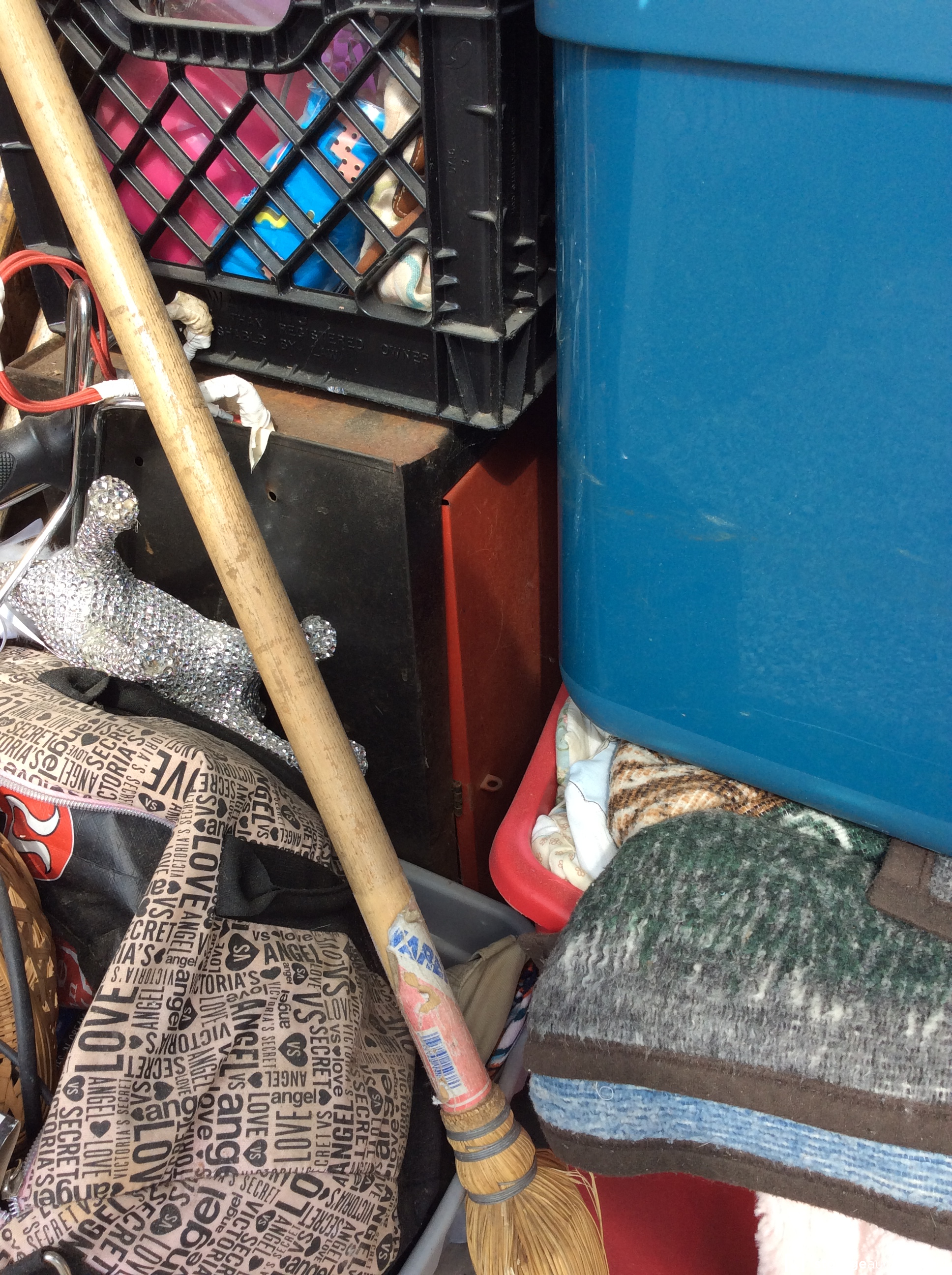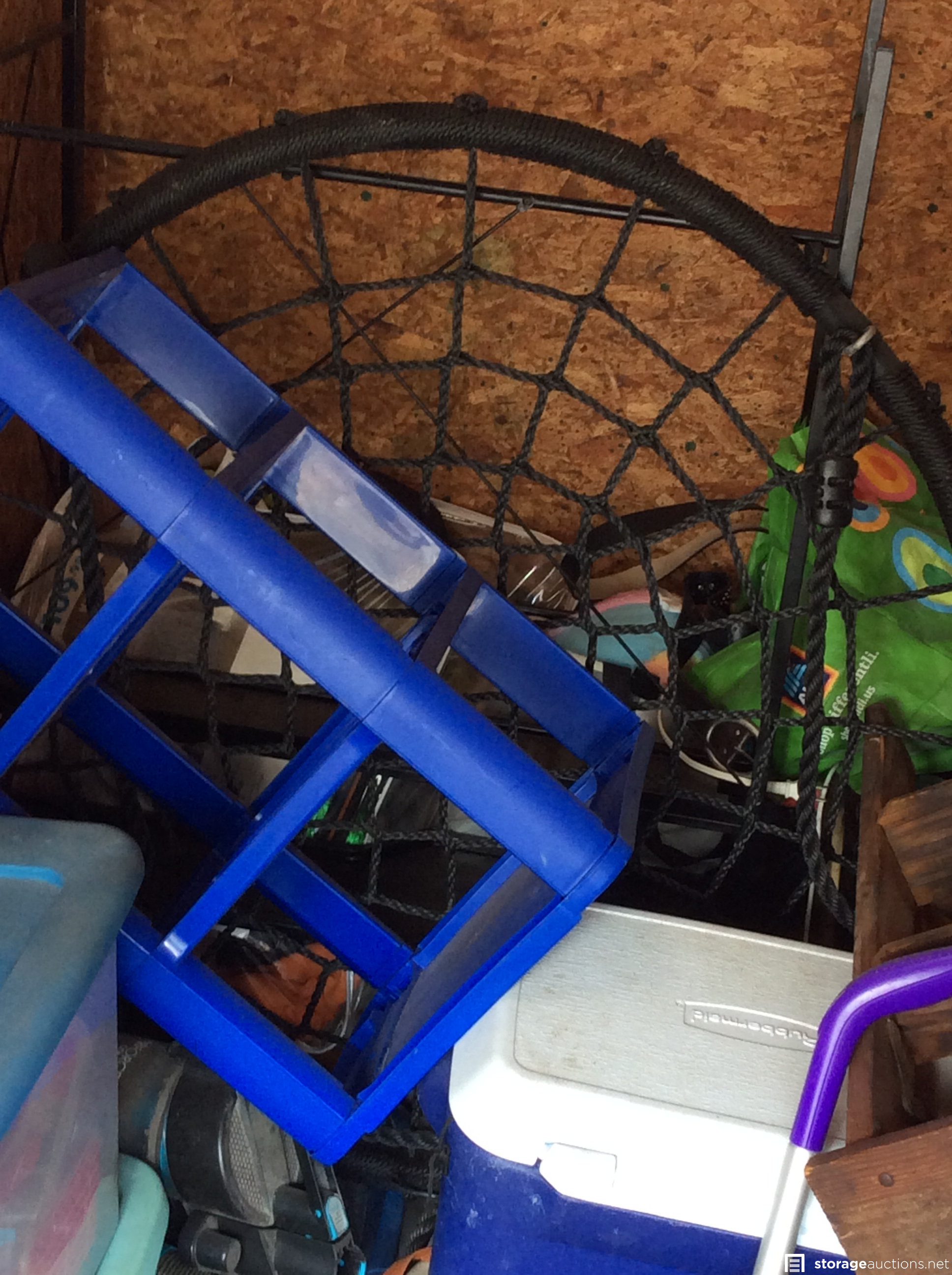 Swords, shovel, rake, garden hoes, Rural King battery, yard tools, several totes, decorative boxes, decorative metal shelf, two vacuum cleaner, weed eater, small metal toolbox, cooler, plastic shelf unit, bed frame?, headboard, child or pet gate, small chest of drawers, little wooden ladder or shelf, something in a Sears case(sewing machine)?