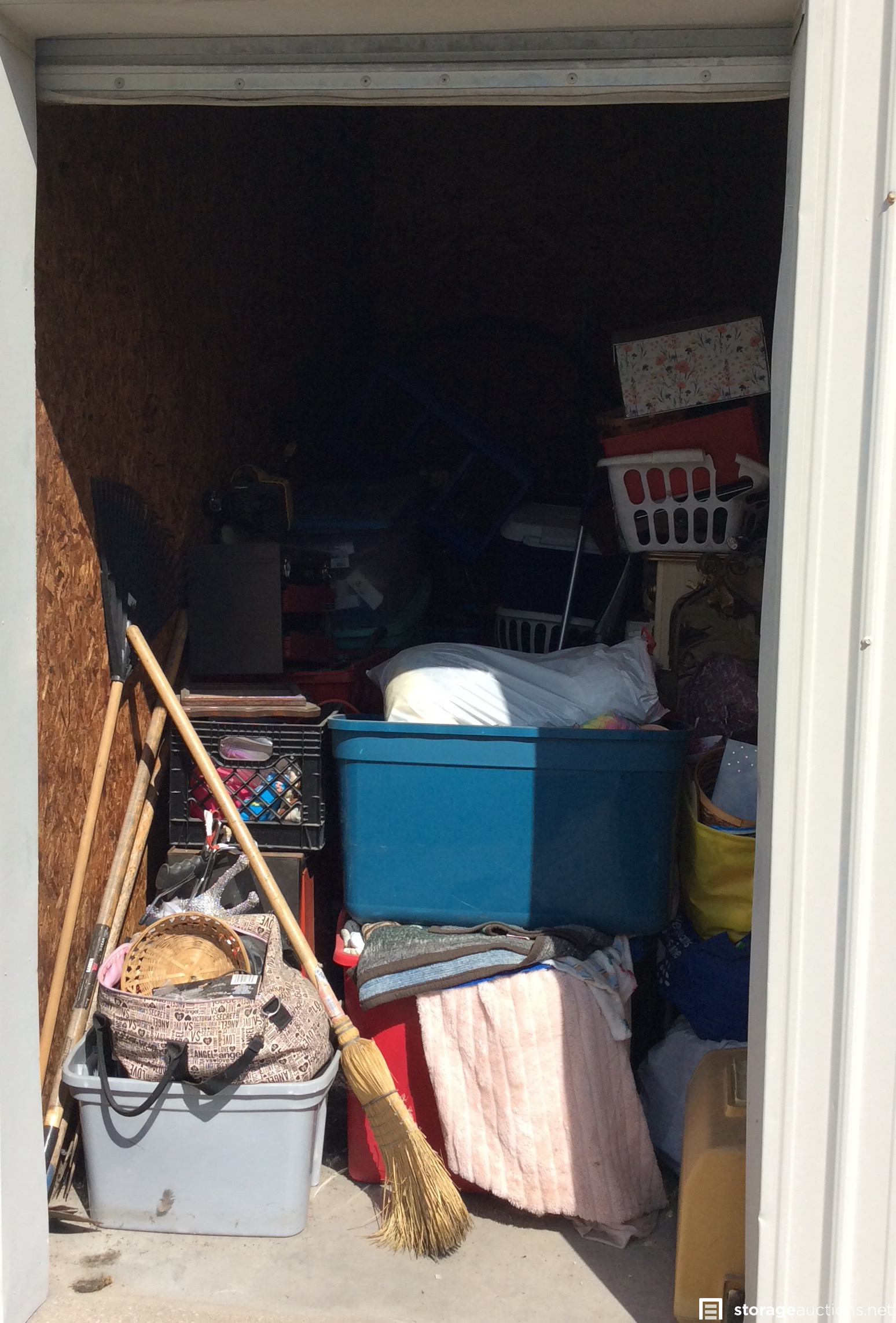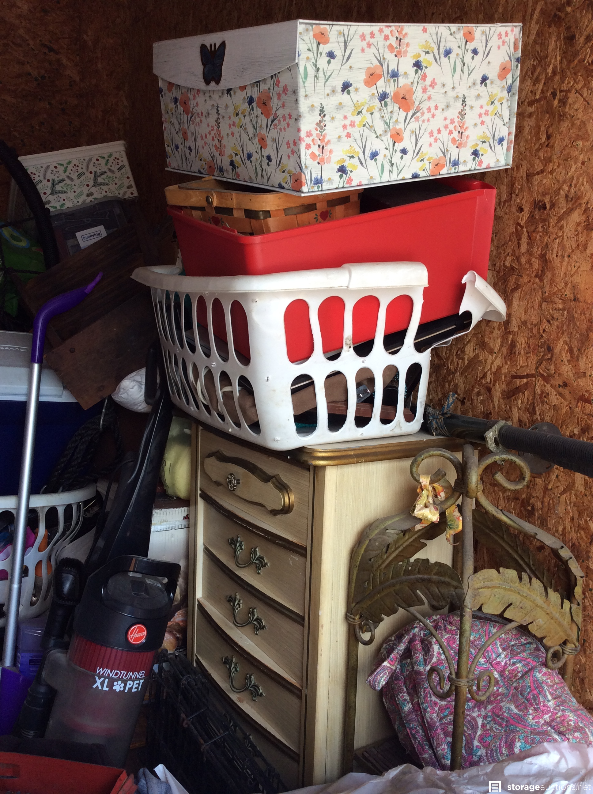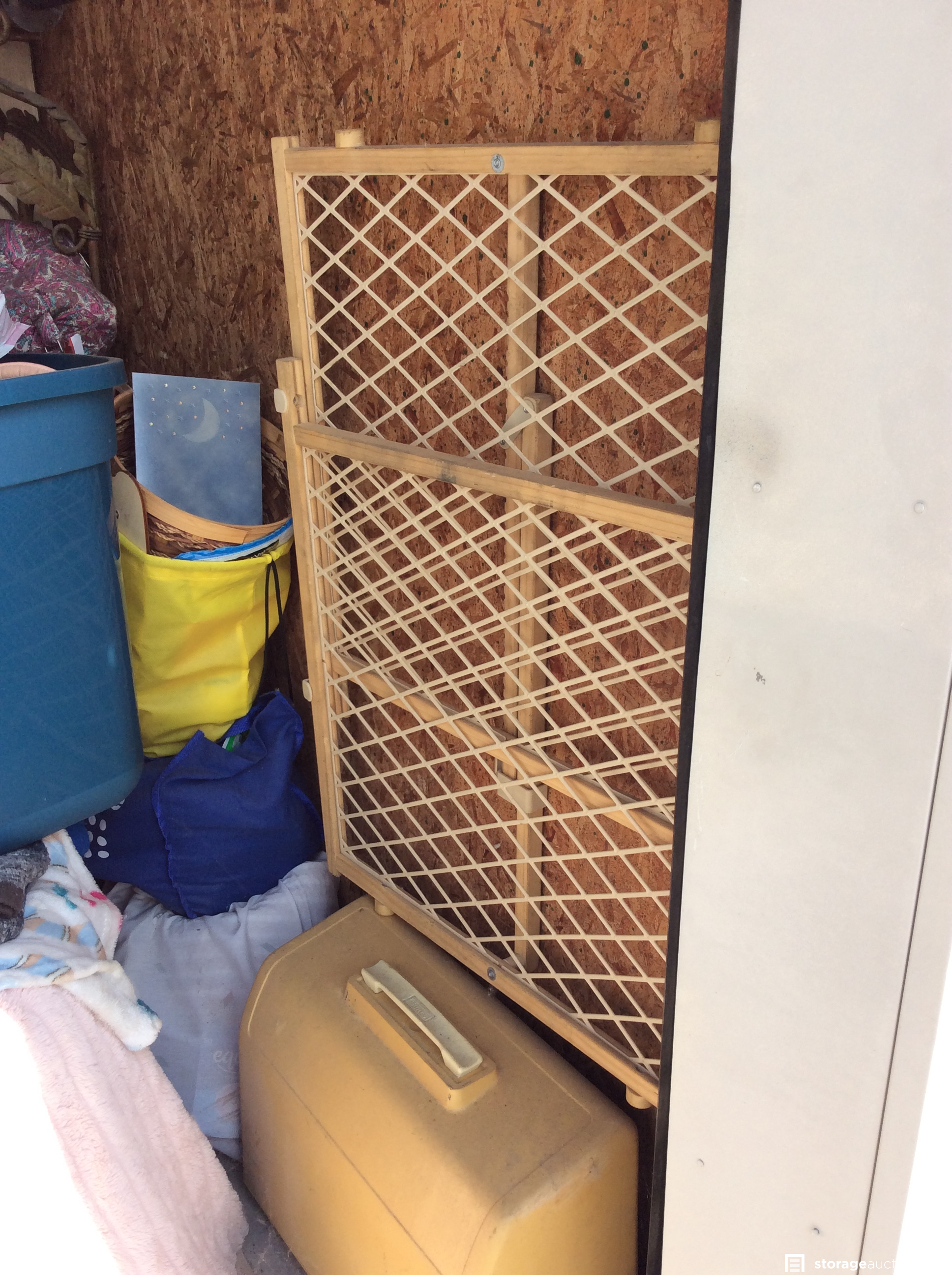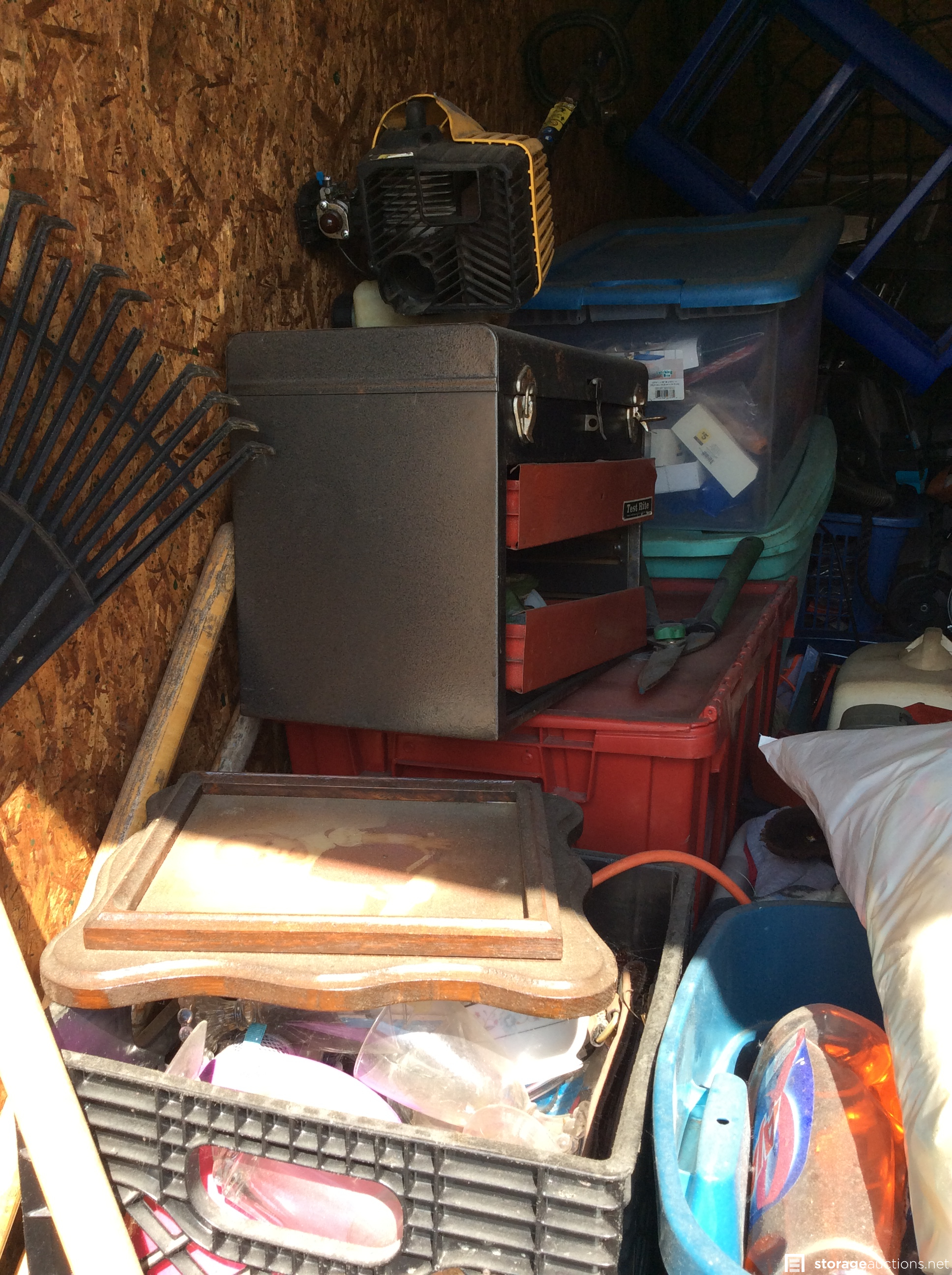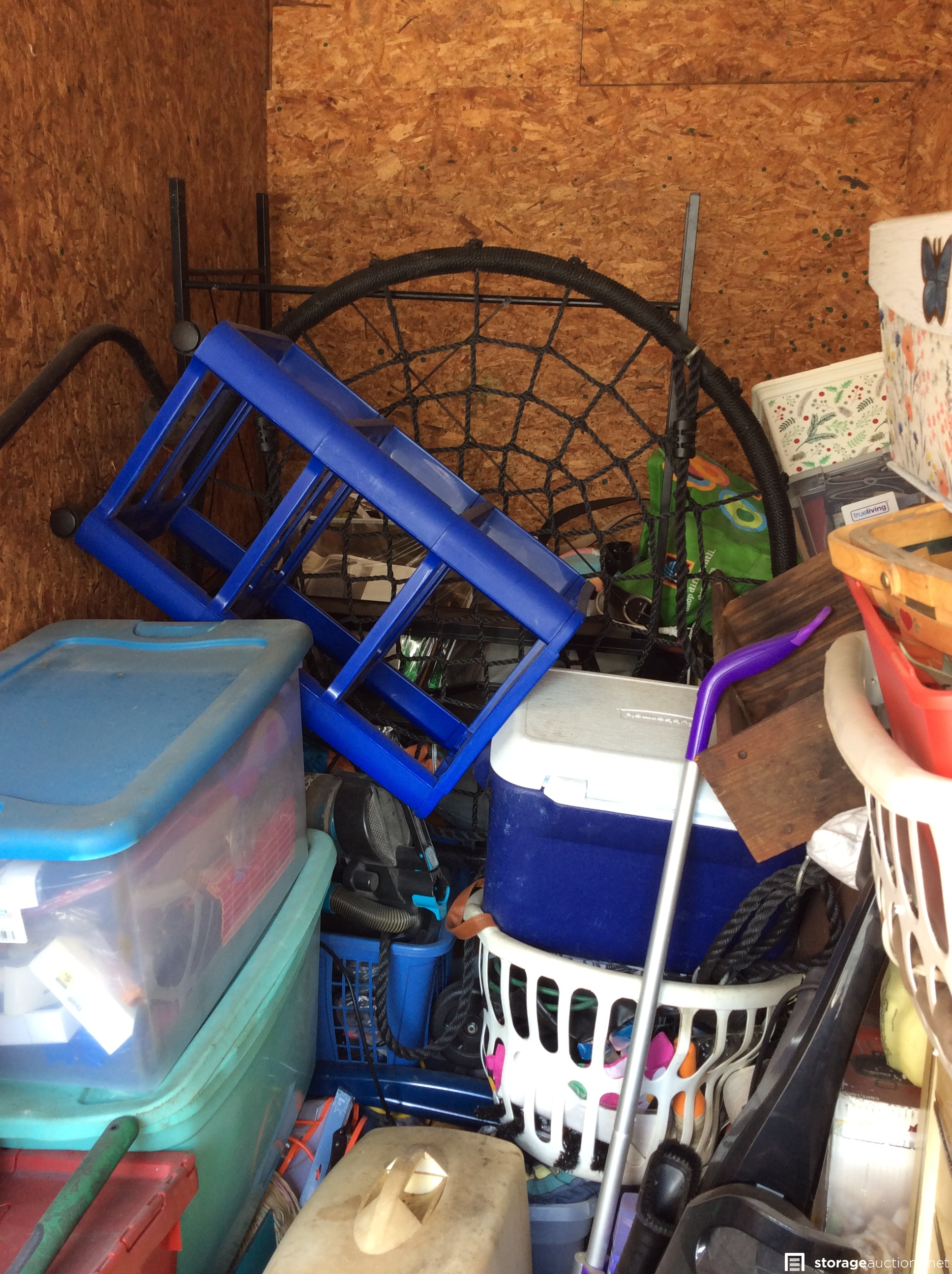 Swords, shovel, rake, garden hoes, Rural King battery, yard tools, several totes, decorative boxes, decorative metal shelf, two vacuum cleaner, weed eater, small metal toolbox, cooler, plastic shelf unit, bed frame?, headboard, child or pet gate, small chest of drawers, little wooden ladder or shelf, something in a Sears case(sewing machine)?