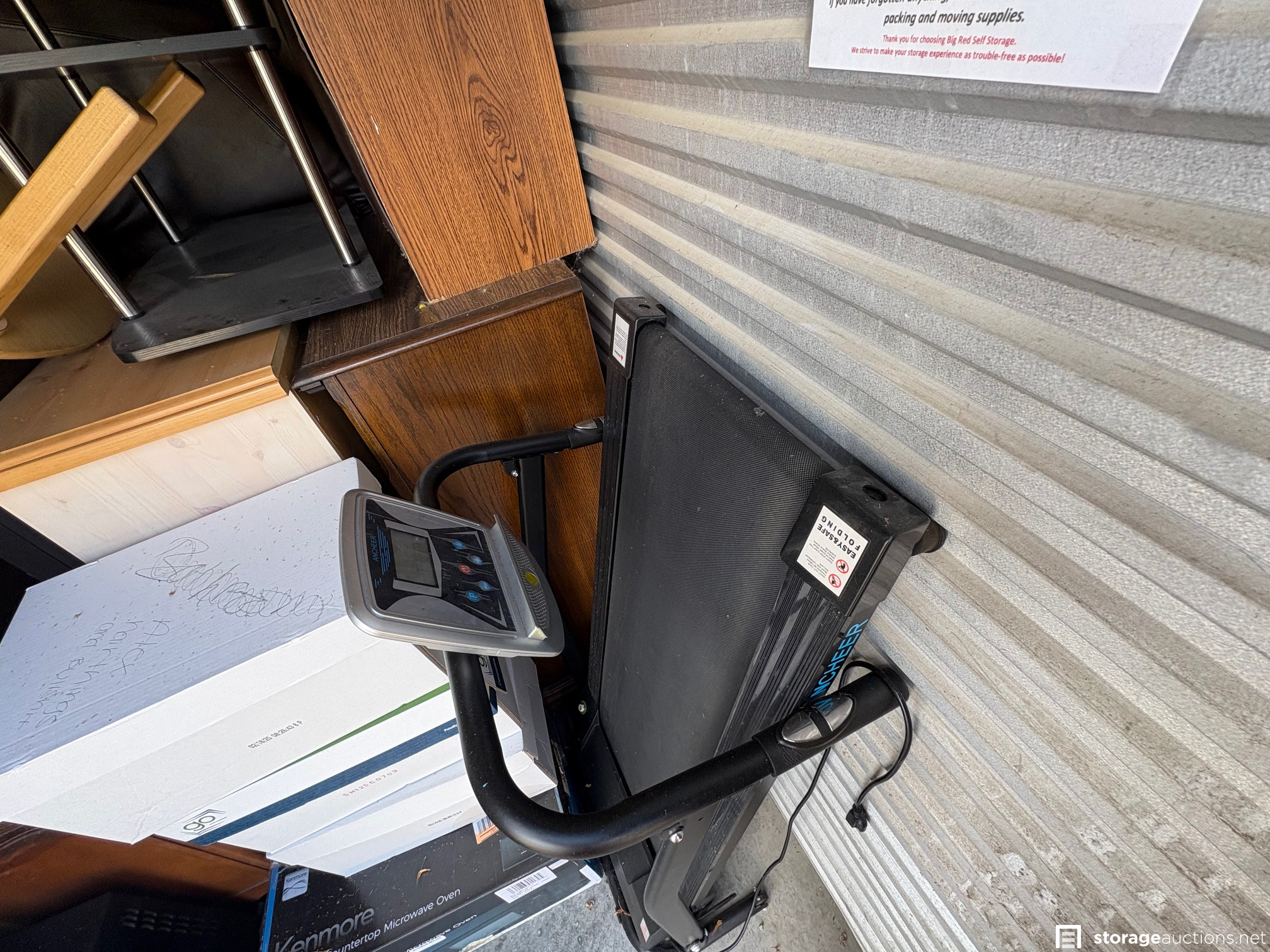 TREADMILL, FLOOR FAN, MICROWAVE, TV STAND, MISC FURNITURE, BOXES, ITEMS