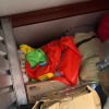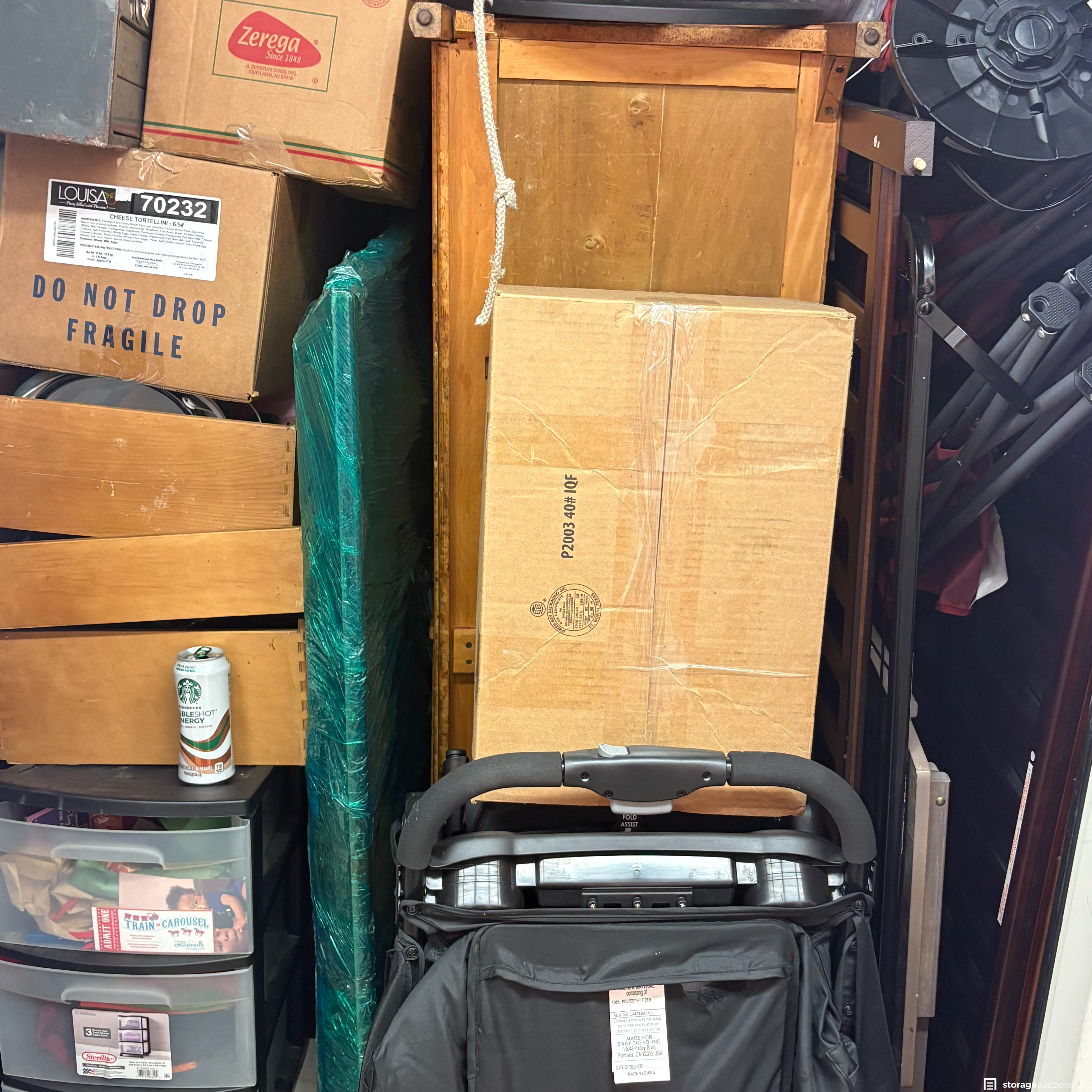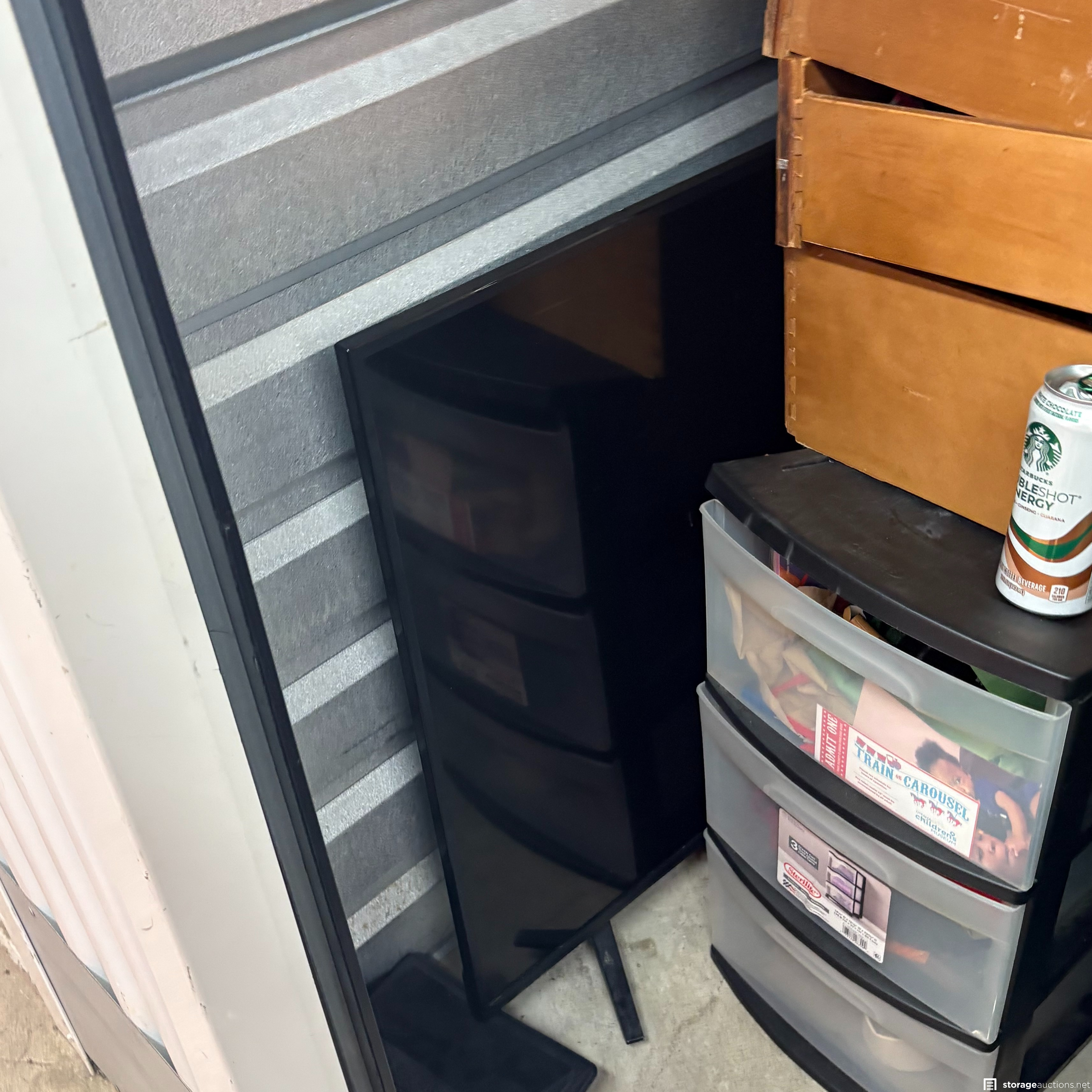 This unit has boxes, dresser, stroller, fan, toolbox, tv, bags