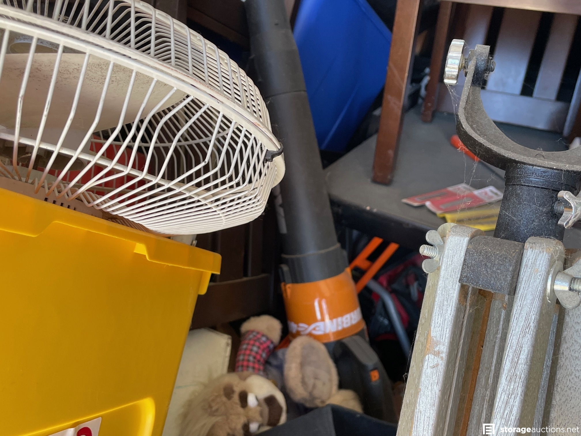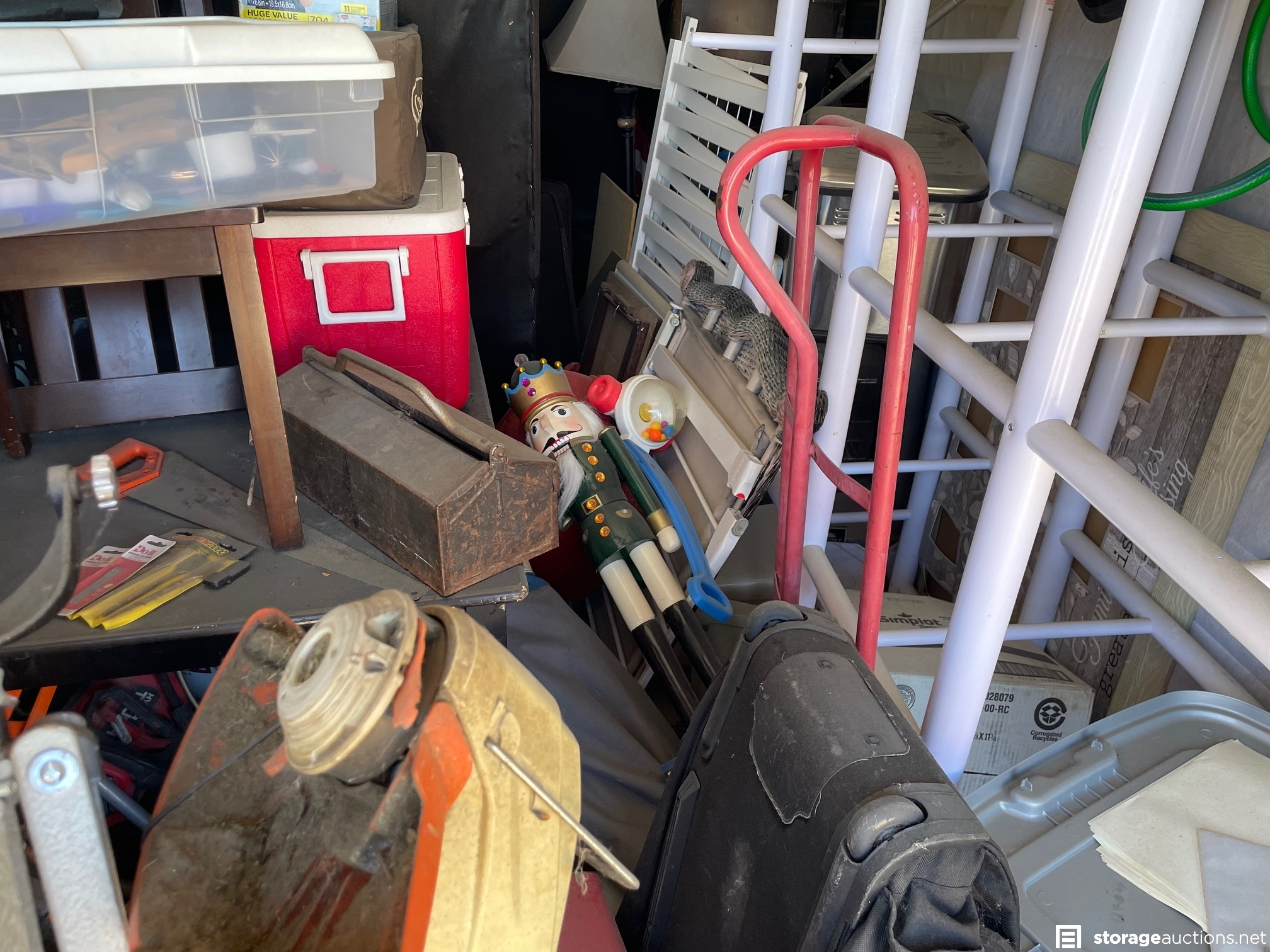 BED, TOYS, STROLLER, TABLE & CHAIRS, TOOLS, SECTIONAL, SHELVING, LOTS OF FURNITURE, TOTES, BLOWER, COOLER, NUTCRACKER, PLAYPEN, SMOKER, TOOL BOX, MISC ITEMS
