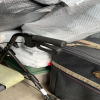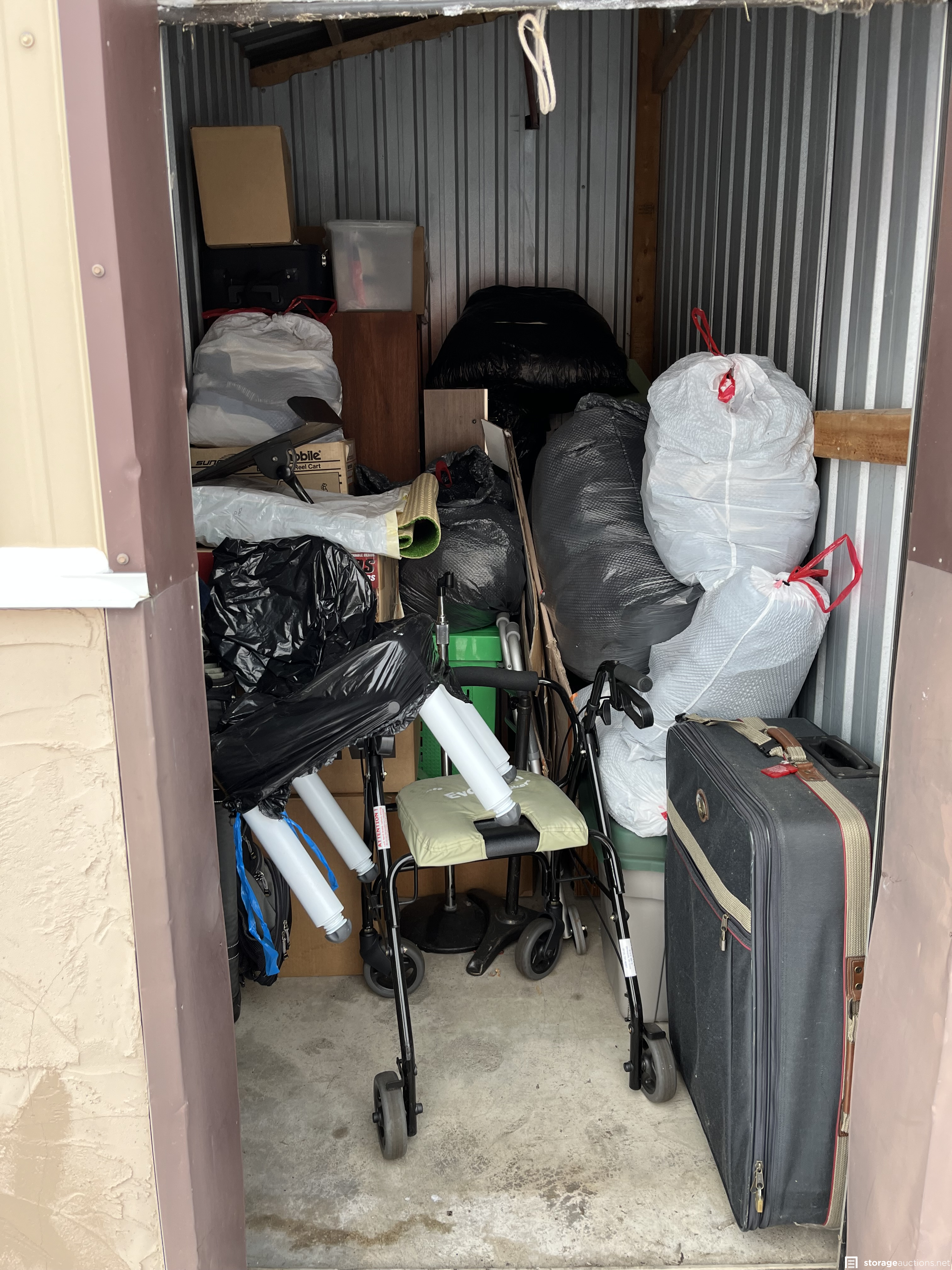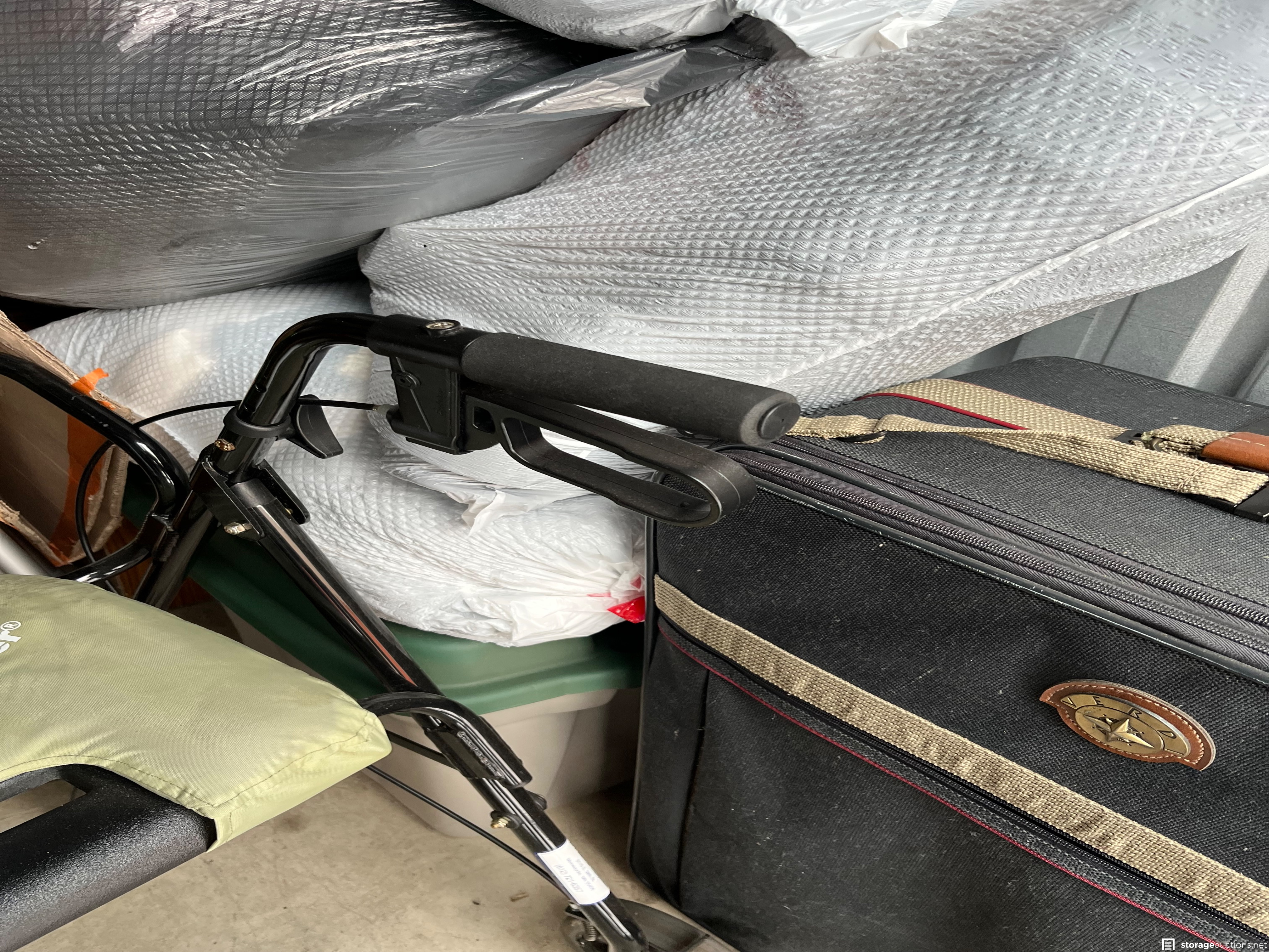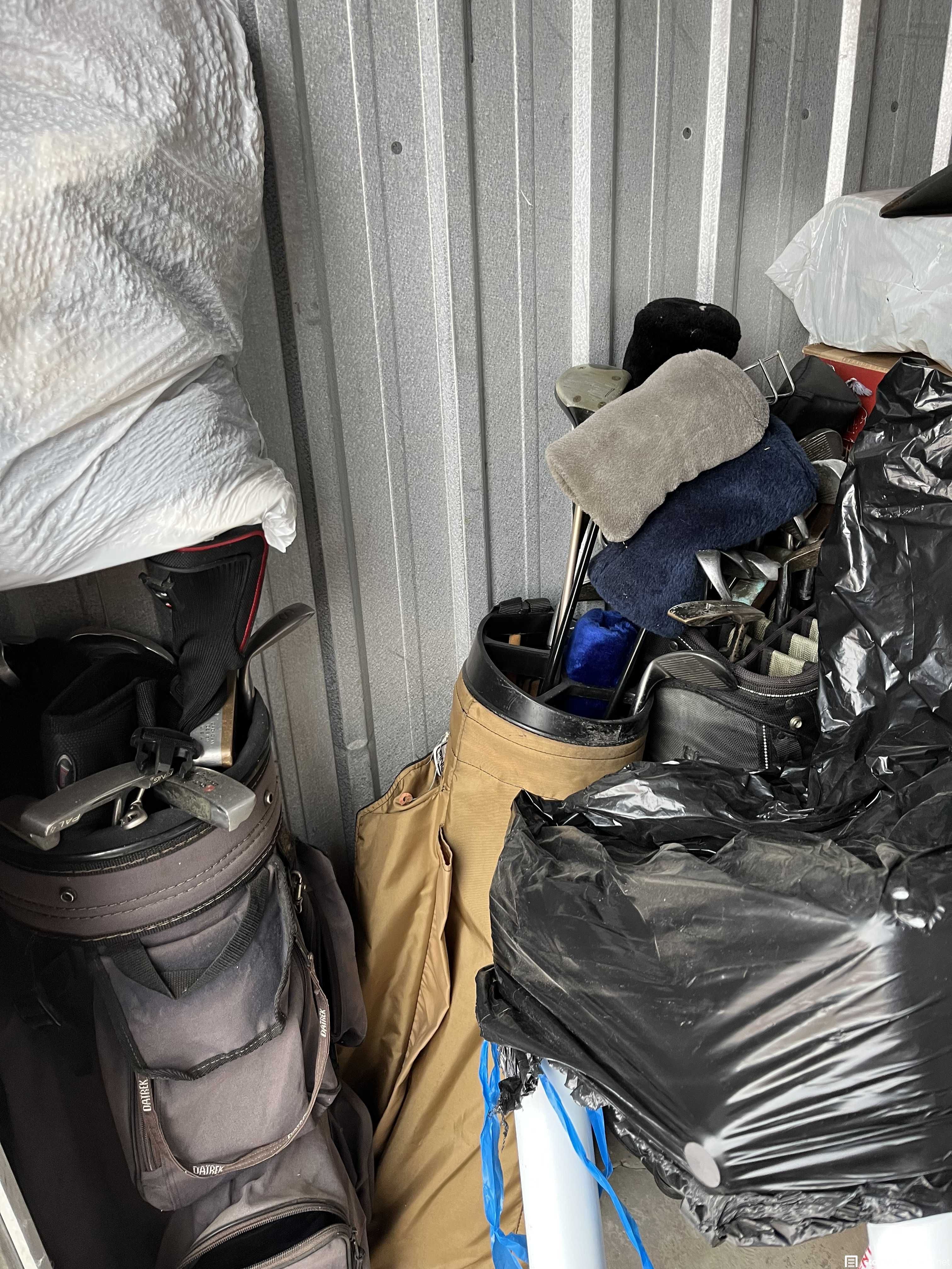 This unit appears to contain 3 Golf bags and clubs, microphones, stand, cords, hearing aids and batteries, walkers, Sony sound system, clothing, music stand, golf gloves, golf shoes, golf clothes, framed artwork, luggage, voice recorder with tape, and more