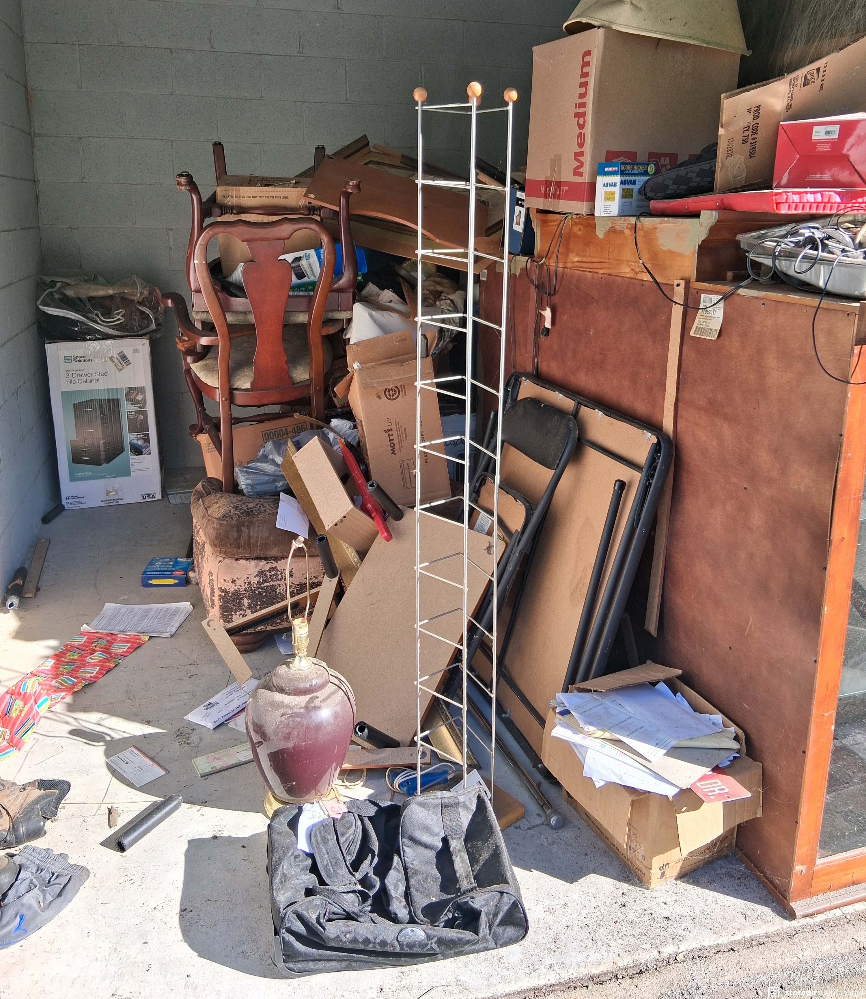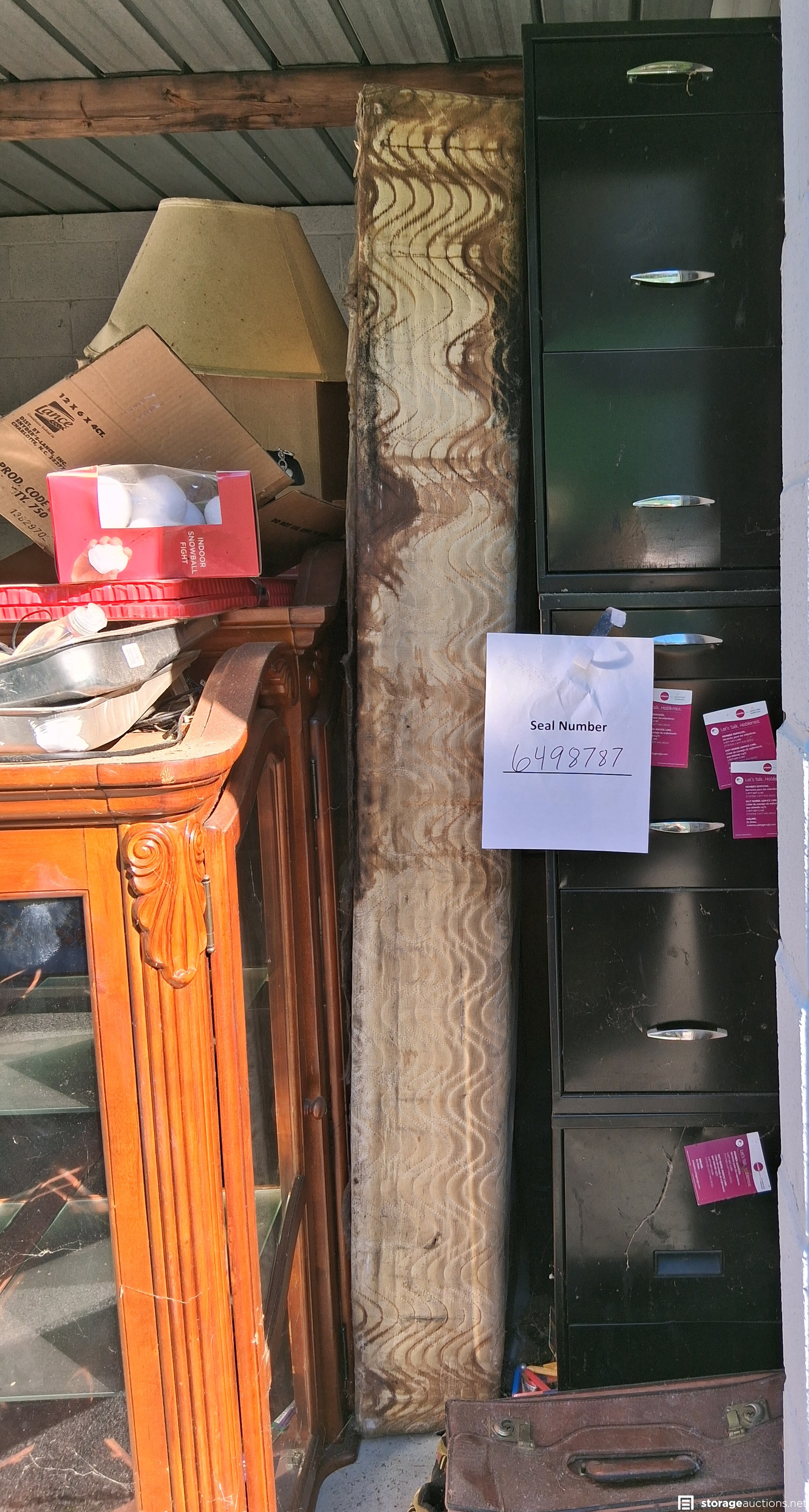 file cabinets, mattresses, chairs, table, pictures lamp, boxes