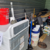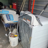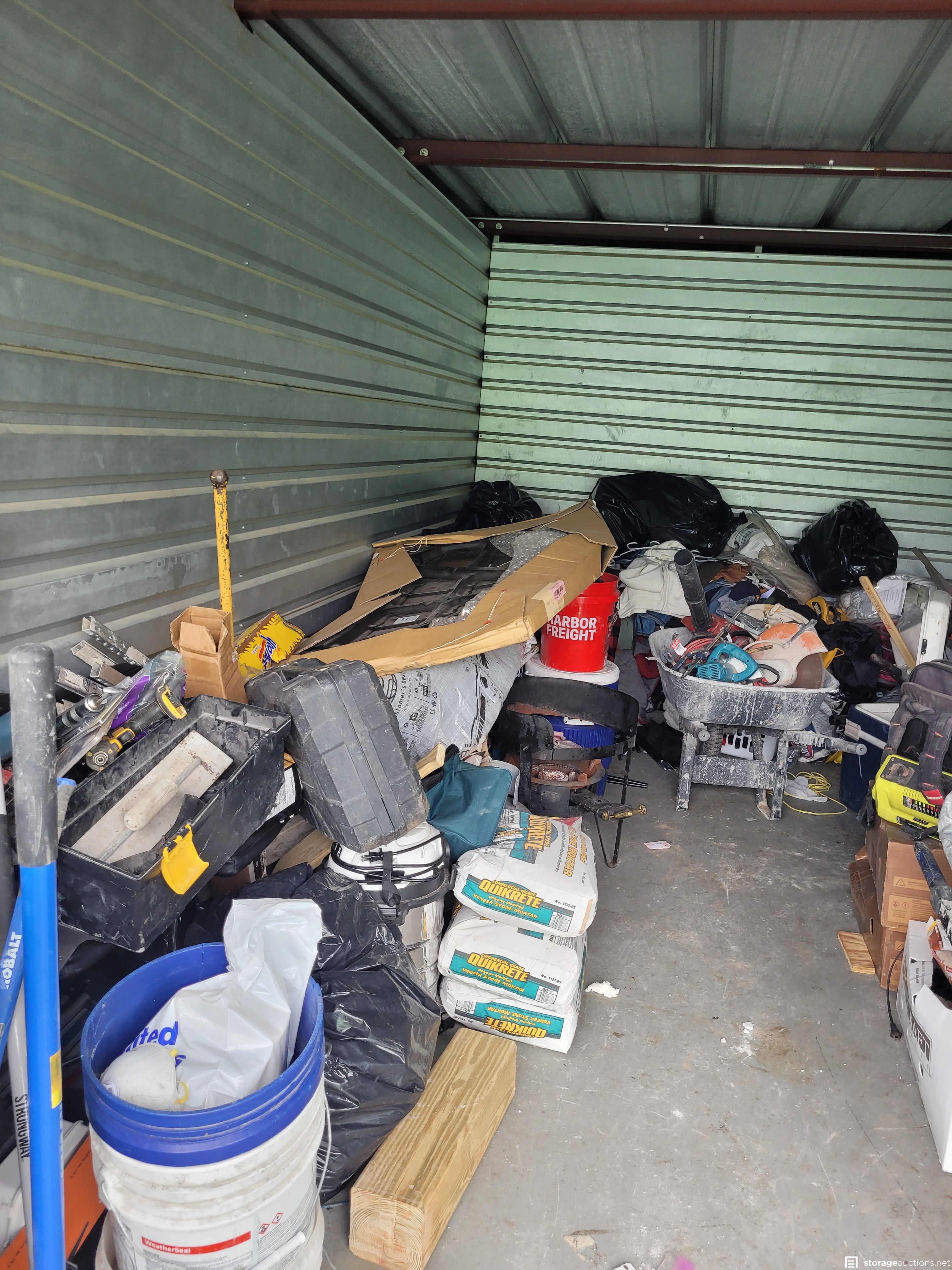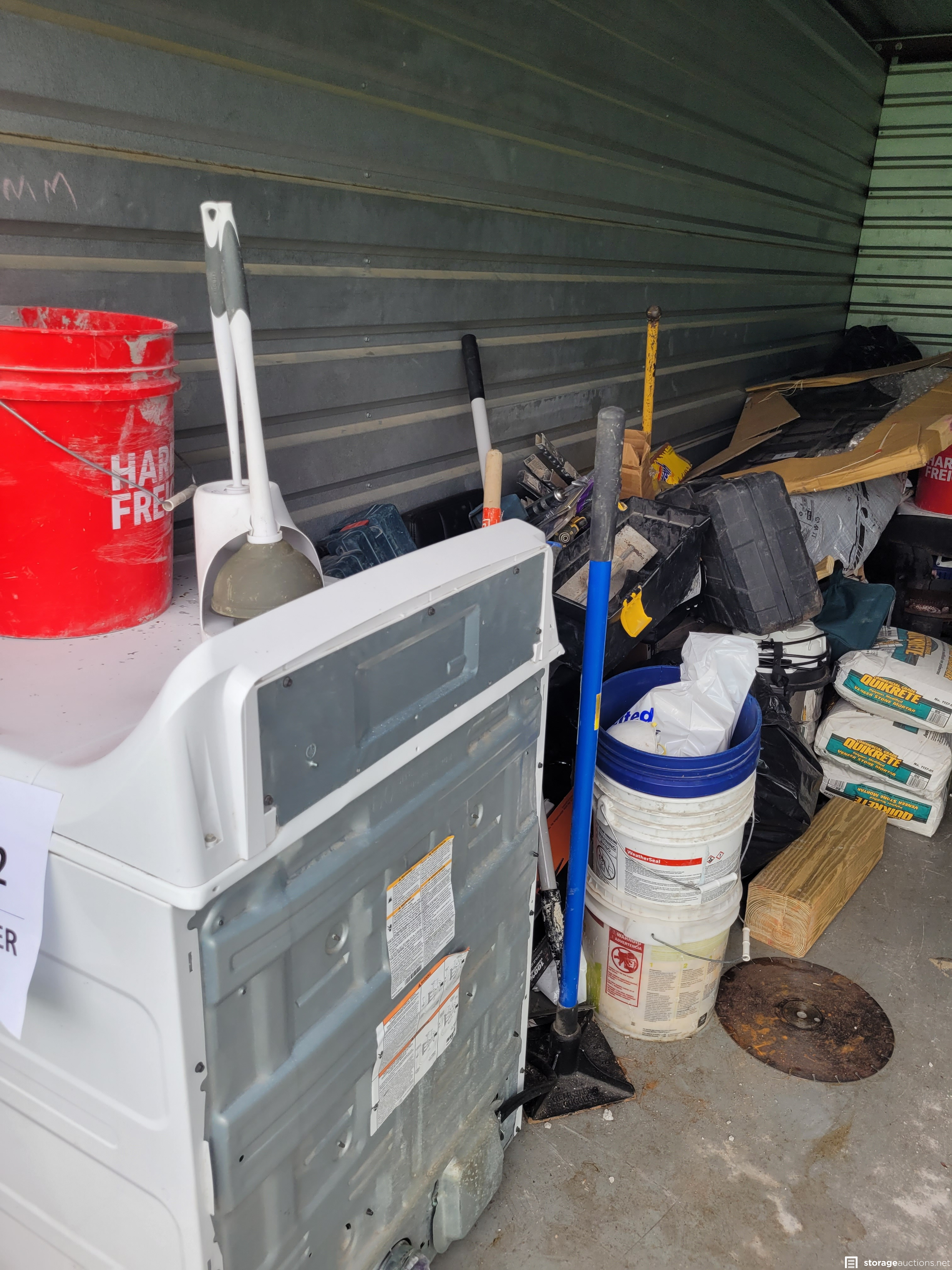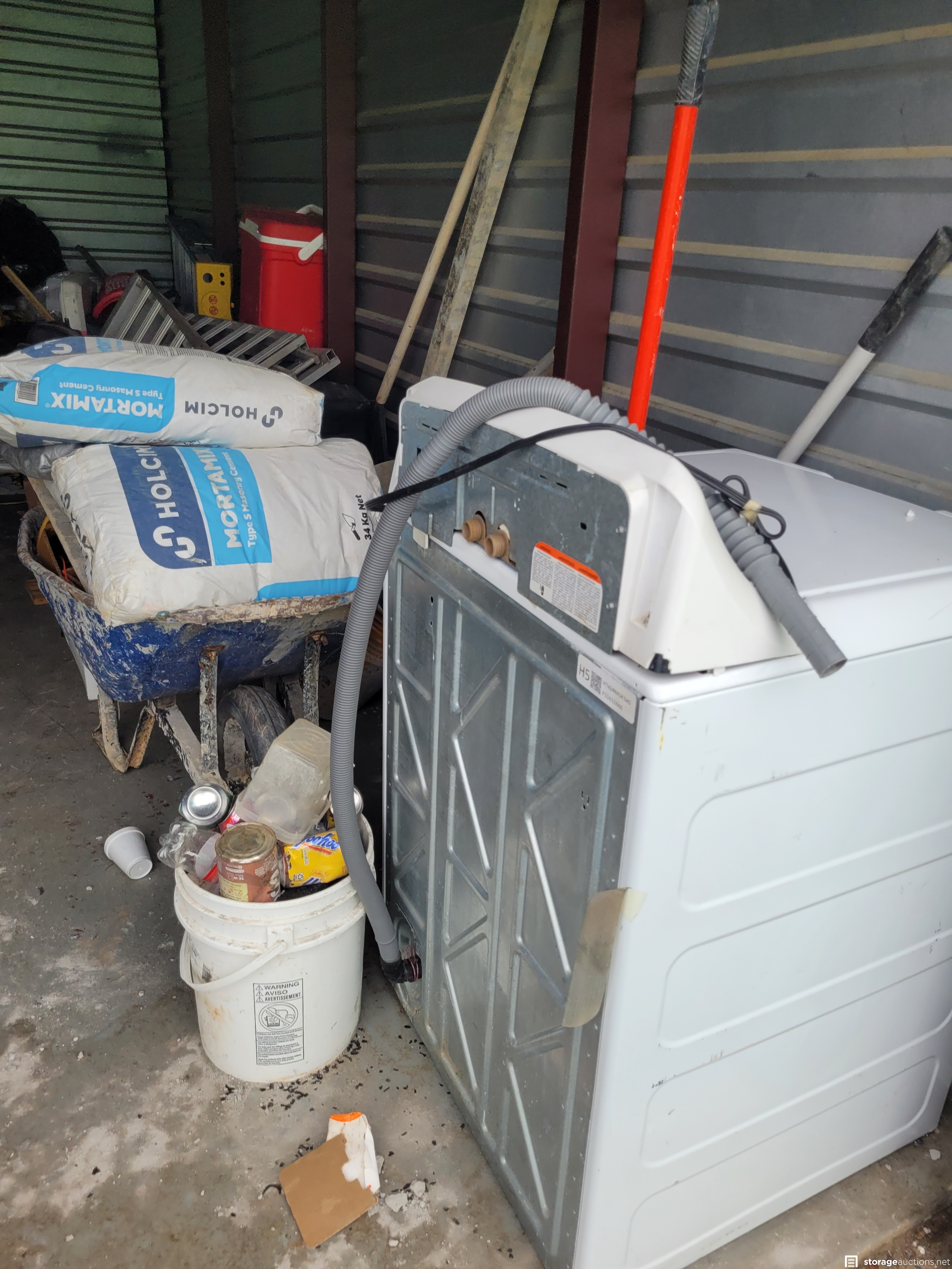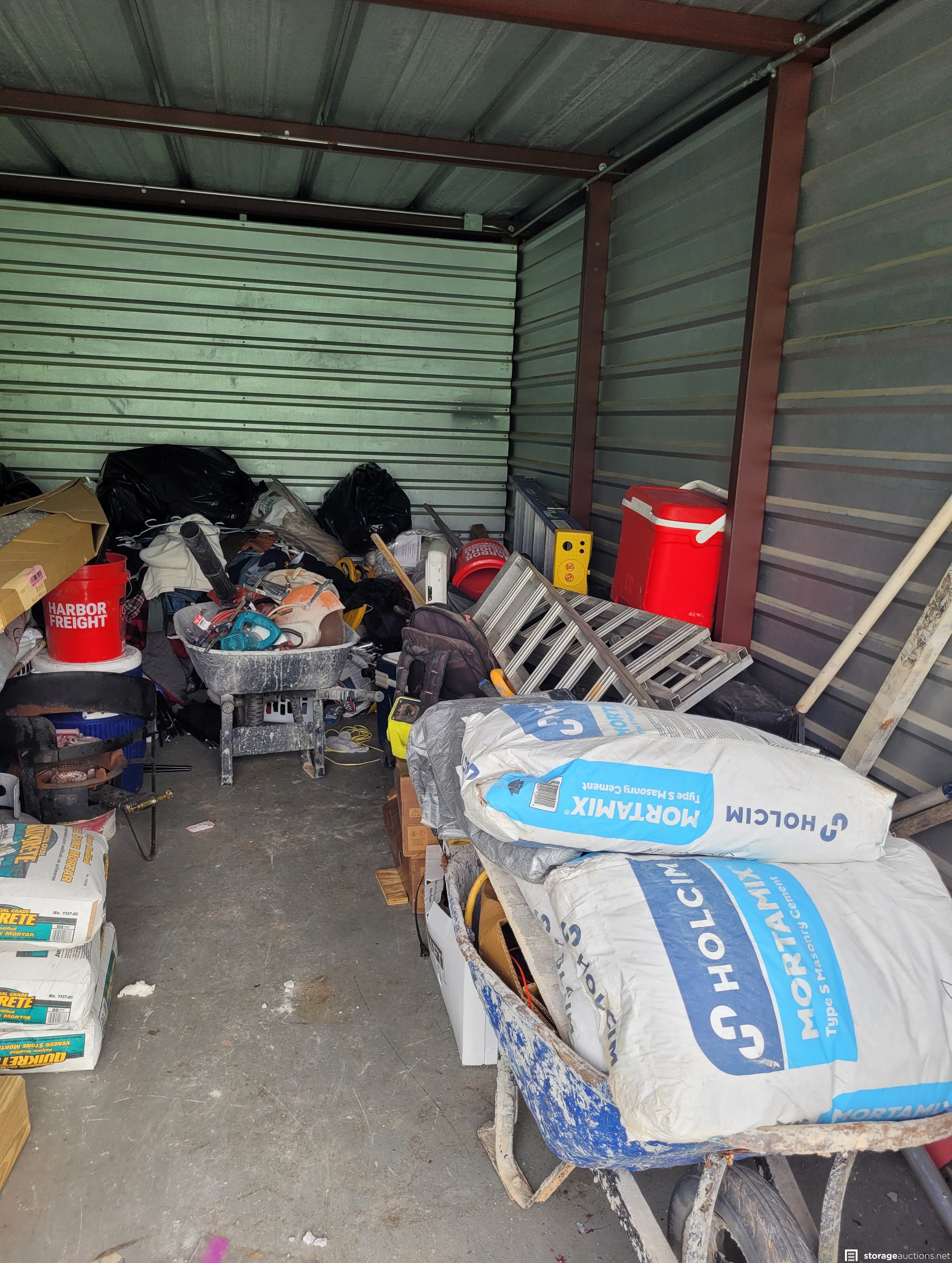 Tools, bags of Mortar, W/D, Wheel Barrow, Saws, Propane Cooker, Ladder, Hood