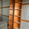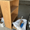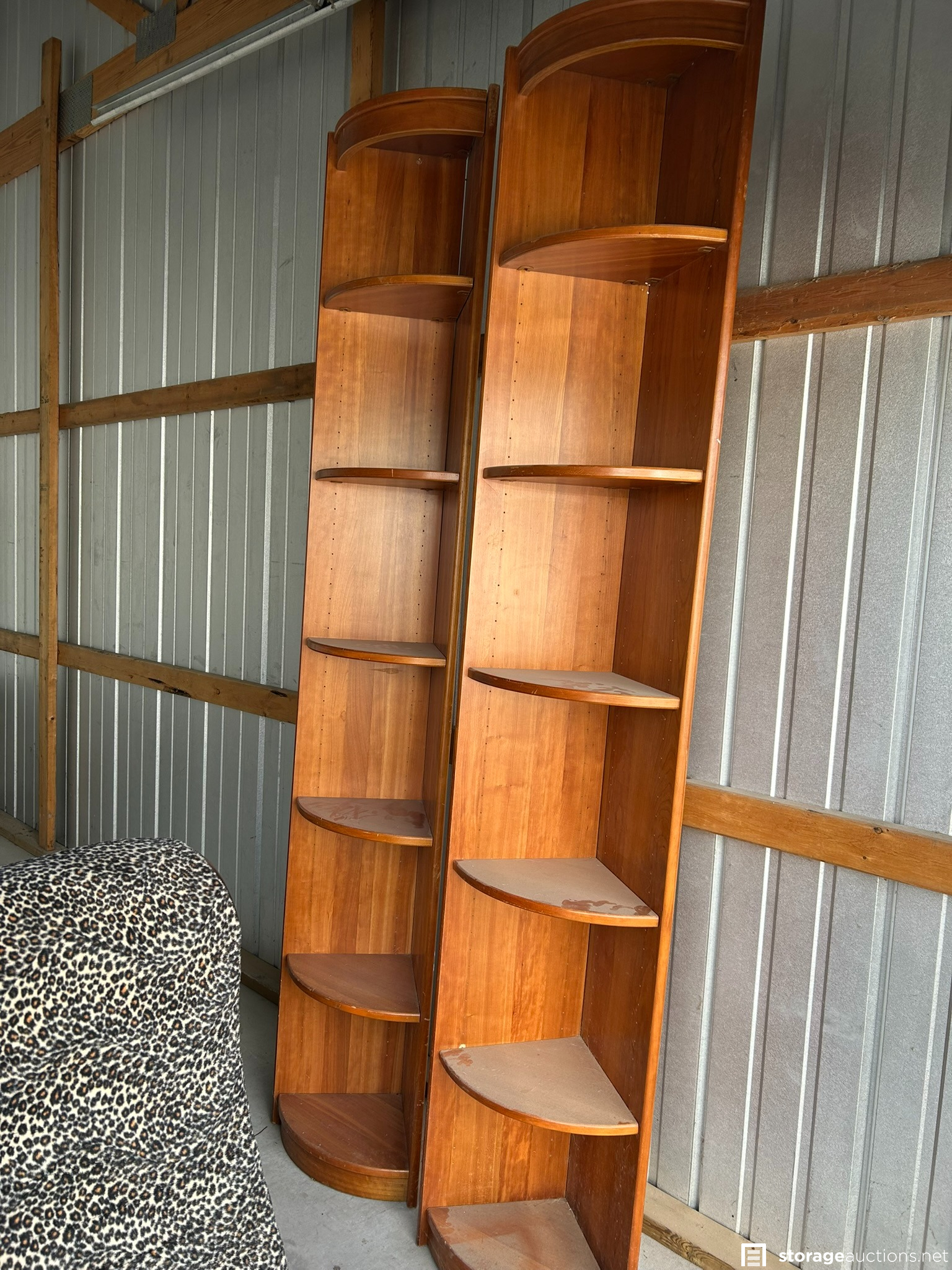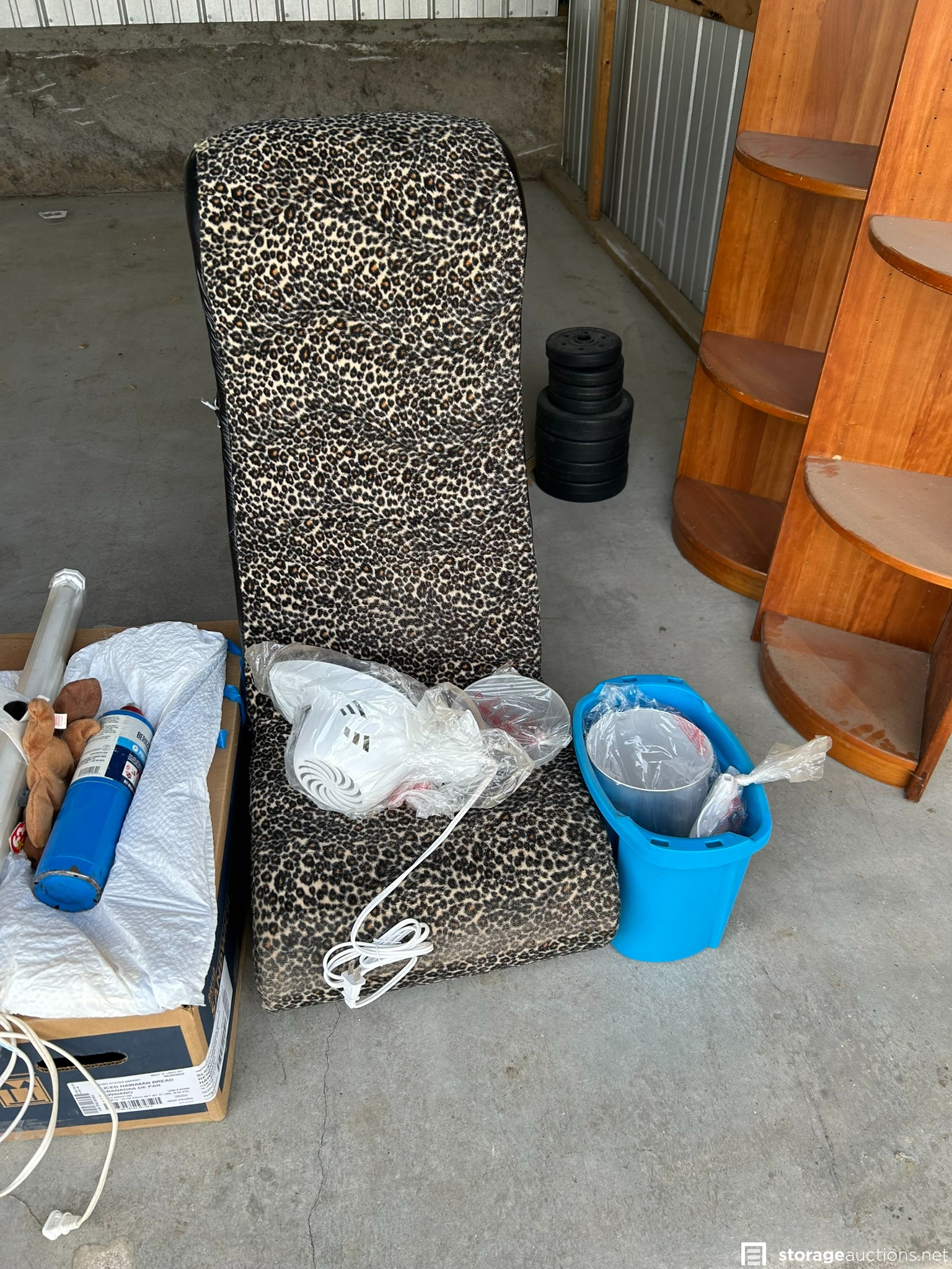 Corner shelves, book shelf, light, fan, weights, leopard skin floor chair and few other household items.