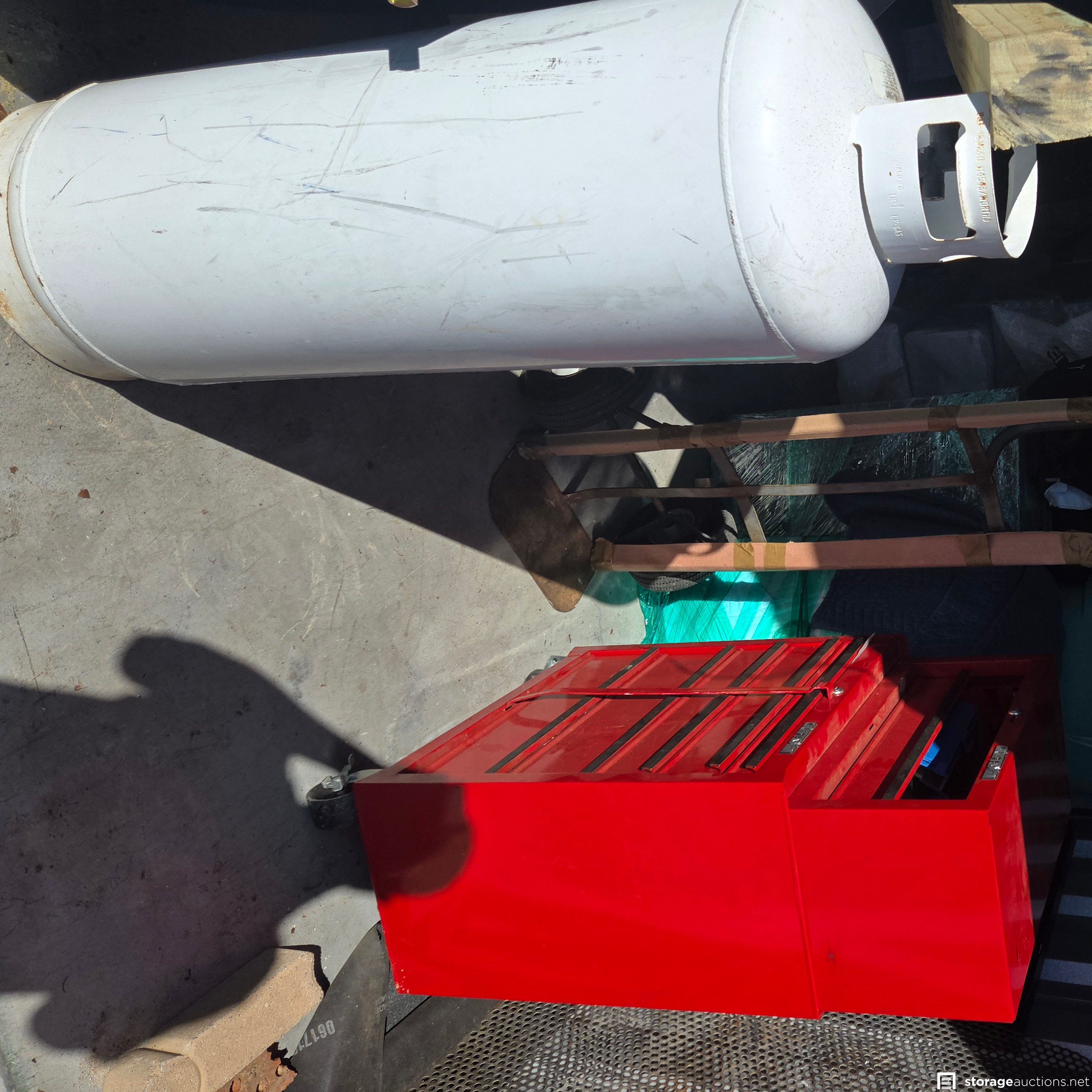 Sectional sofa, Craftstman tool chest, some tools, propane tanks, dolly