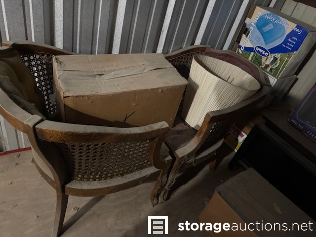 THIS UNIT HAS 2 ANTIQUE CHAIRS, BOXES, AND AN END TABLE OR NIGHTSTAND