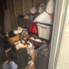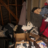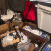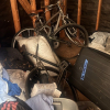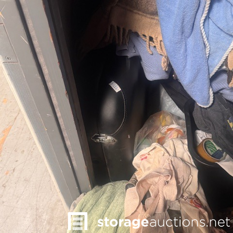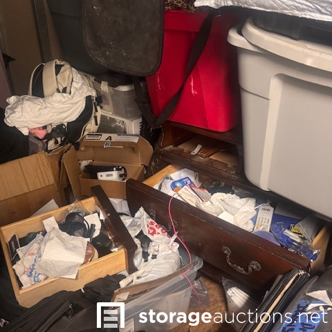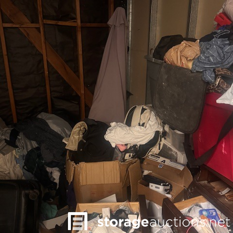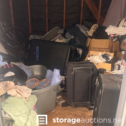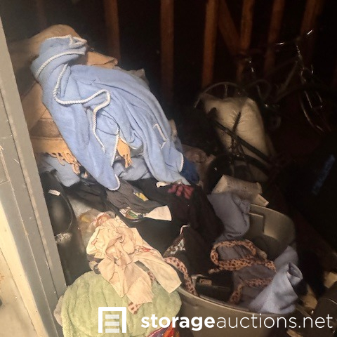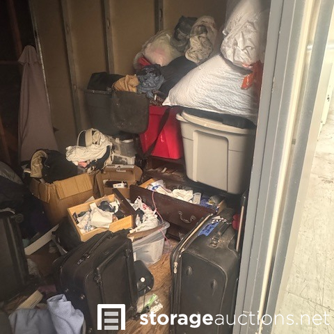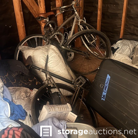 this unit appears to contain air conditioner, 3 suitcases, 5 totes, 1 box, 5 totes, end table, clothing,2 bikes, patio umbrella, bags, tennis racket, massage table, back pack, machine for blood pressure. misc items.