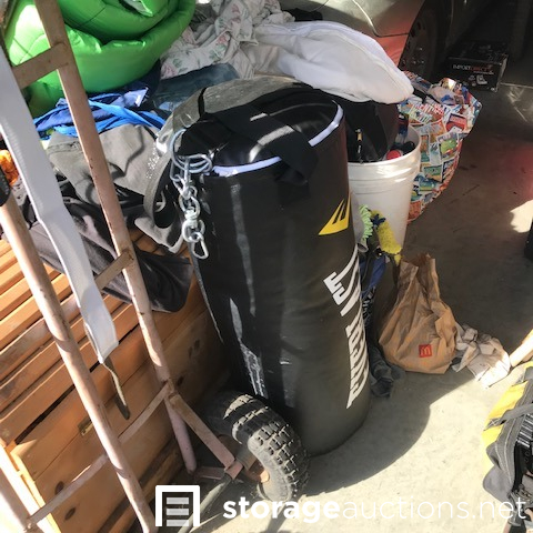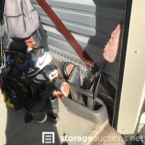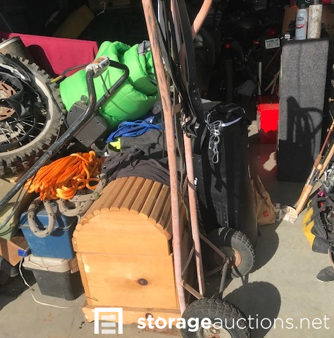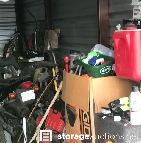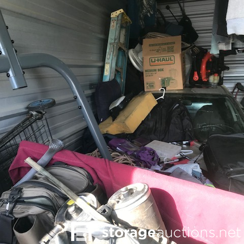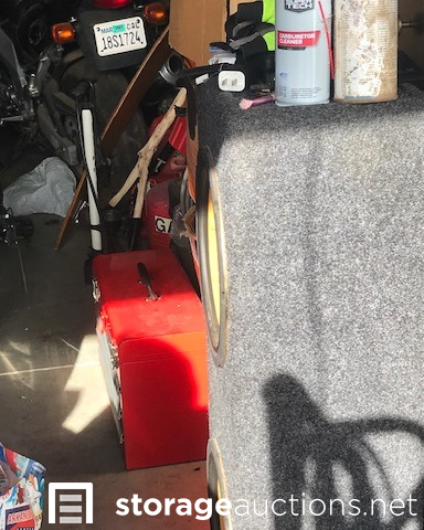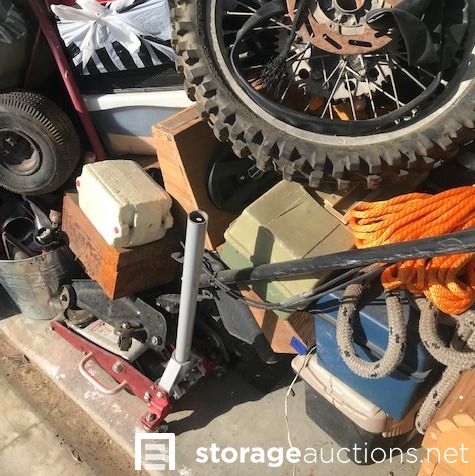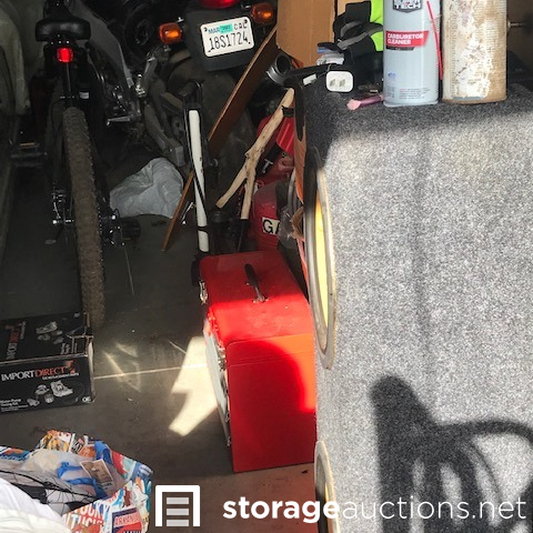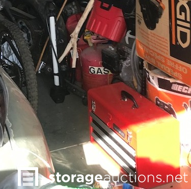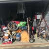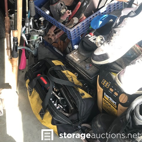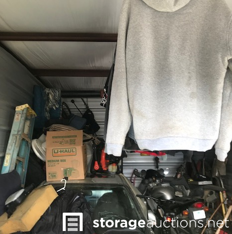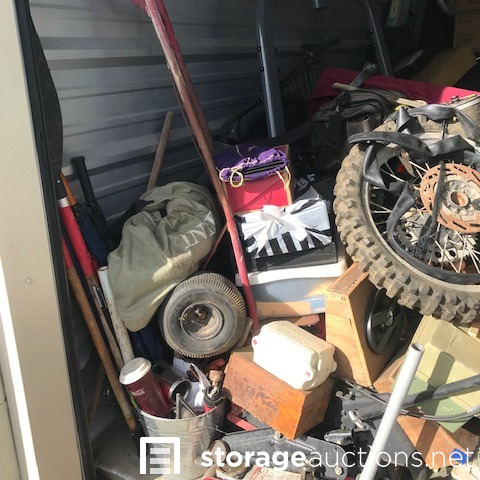 CAR AND MOTORCYCLES INSIDE THE UNIT DO NOT GO WITH THE SALE! Tools, hand dolly, heavy bag, bicycle, dresser, jack, clothing, wood chest, fishing poles, leaf blower, ladder, weed eater, rakes, shovels, small shop vac, large shop vac, misc duffels and backpacks, dirtbike tires, pressure washer, speakers, jug of spare change.