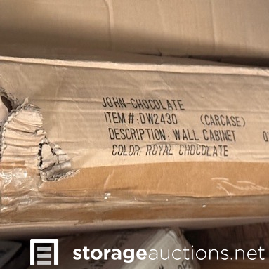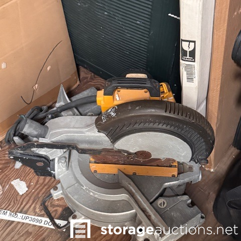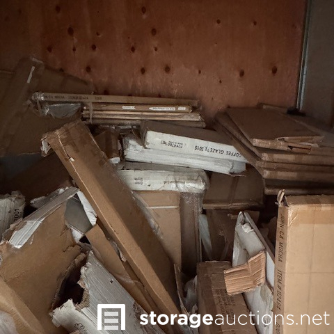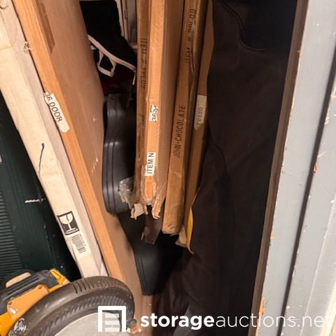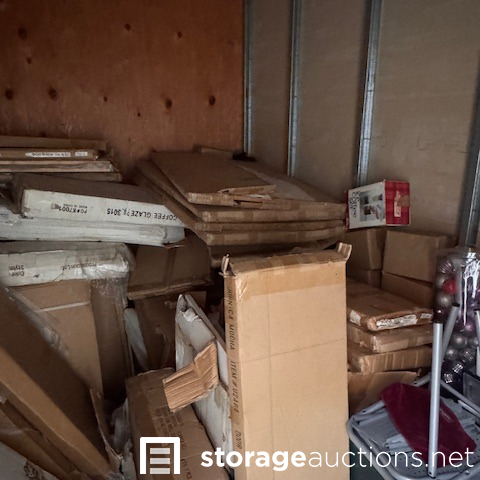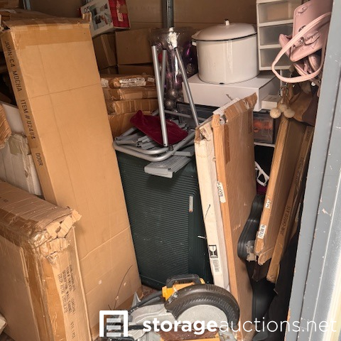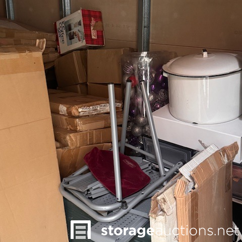 This unit appears to contain 50+boxes, plastic cubbies, pot, Xmas decor saw, suitcase, misc items.
