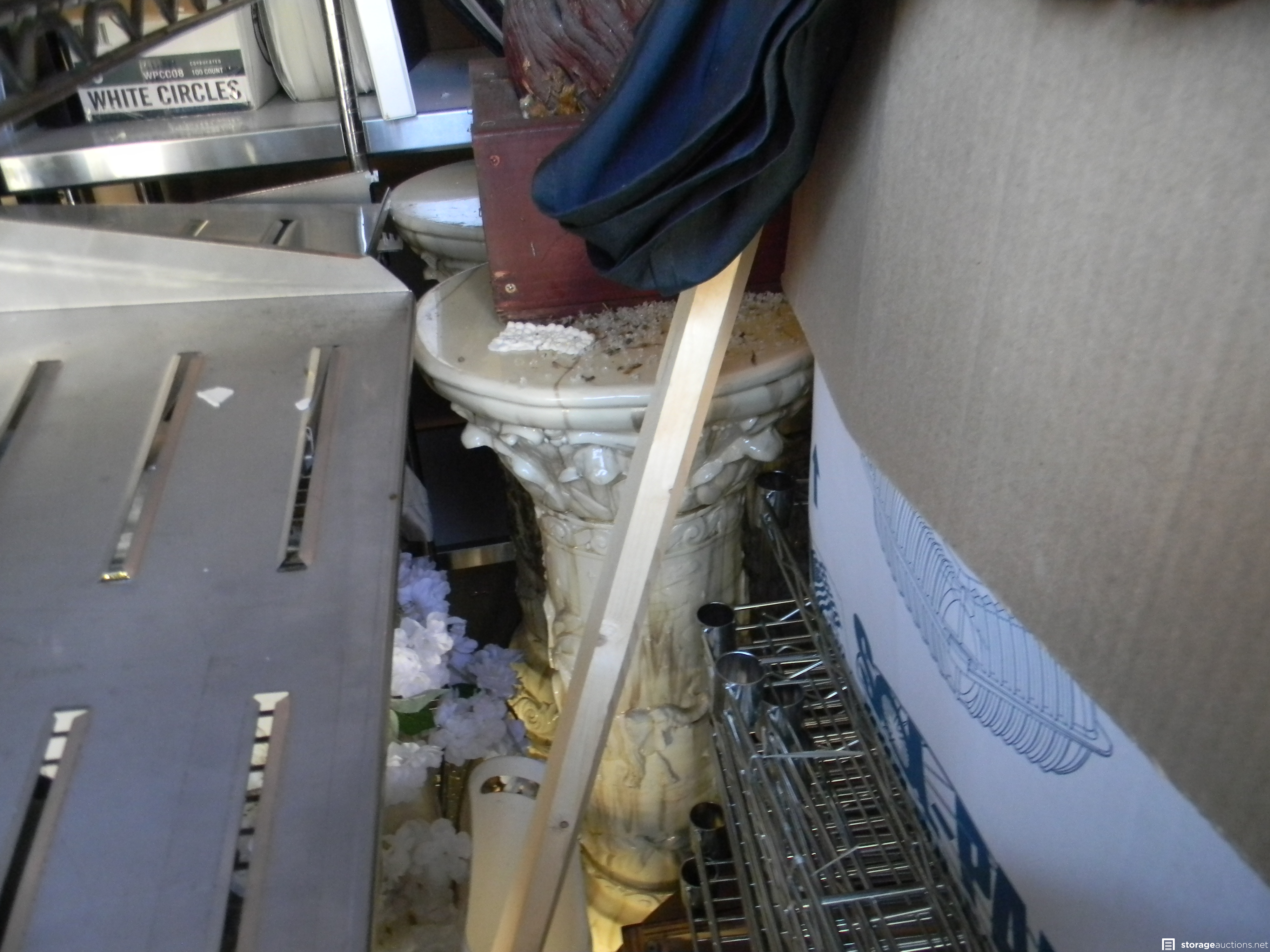 2 GAMING CHAIRS, LIFETIME FOLDING TABLE, LOCKING DISPLAY CASE FOR PASTRIES, 7 SETS OF SHELVES, 2 MARBLE LIKE PILLARS, 2 CANDLEABRAS, SPEAKER BAR, MINI FRIDGE, FIRE EXTINGUISHER, LADIES BEACH CRUISER, DISPLAY CASES, FLATSCREEN TV, CASH REGISTER DRAWER AND CARD SWIPERS, 8 ACRYLIC BOXES, MISC LINENS, DINING CHAIR, DRILL BITS, ROLLING TABLE.