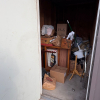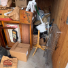 COAT RACK, MOP, END TABLE, MISC BOXES, MISC ITEMS