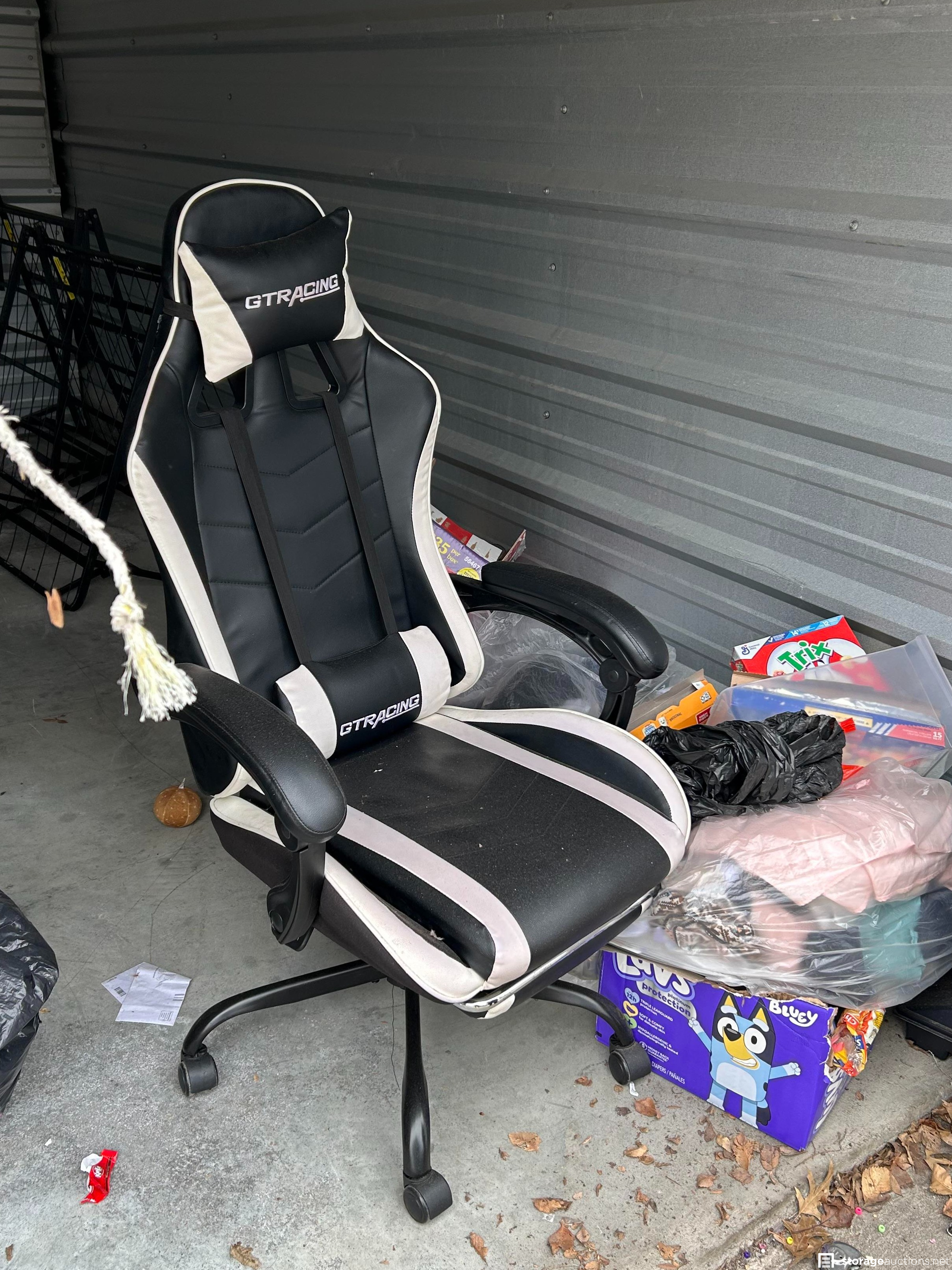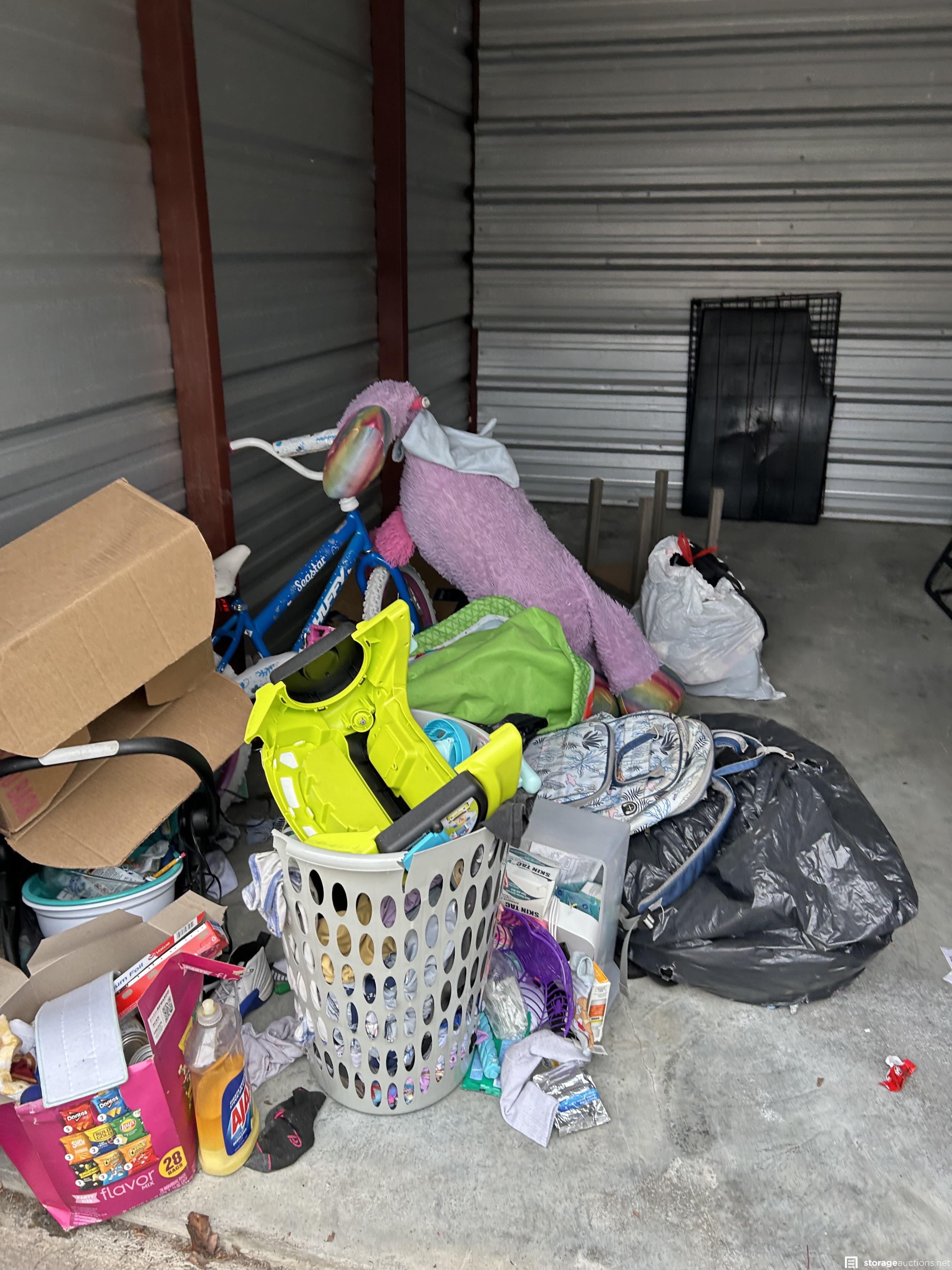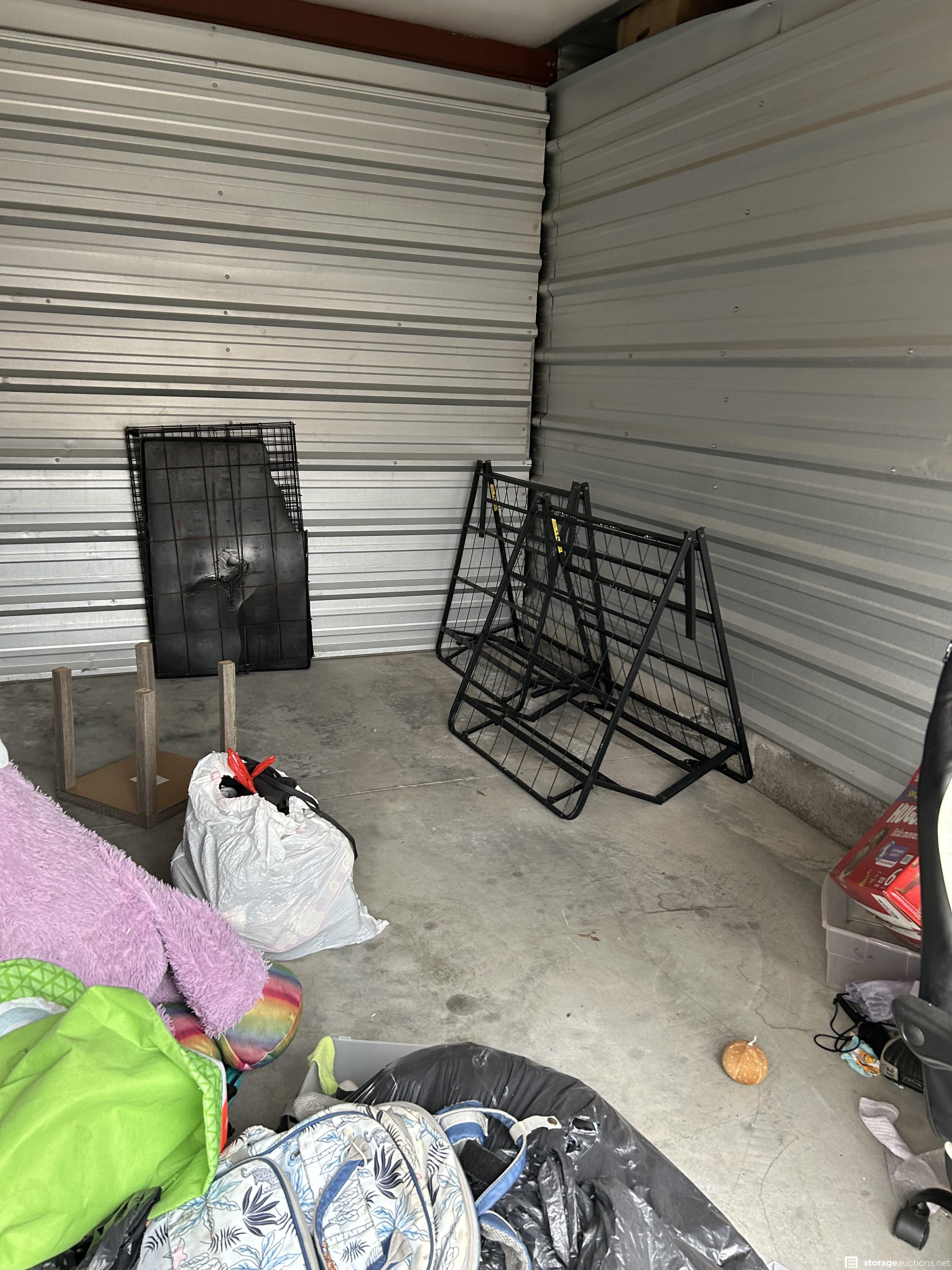 This unit has bed frame, office chair, kennel, bags, bike, stand