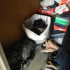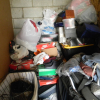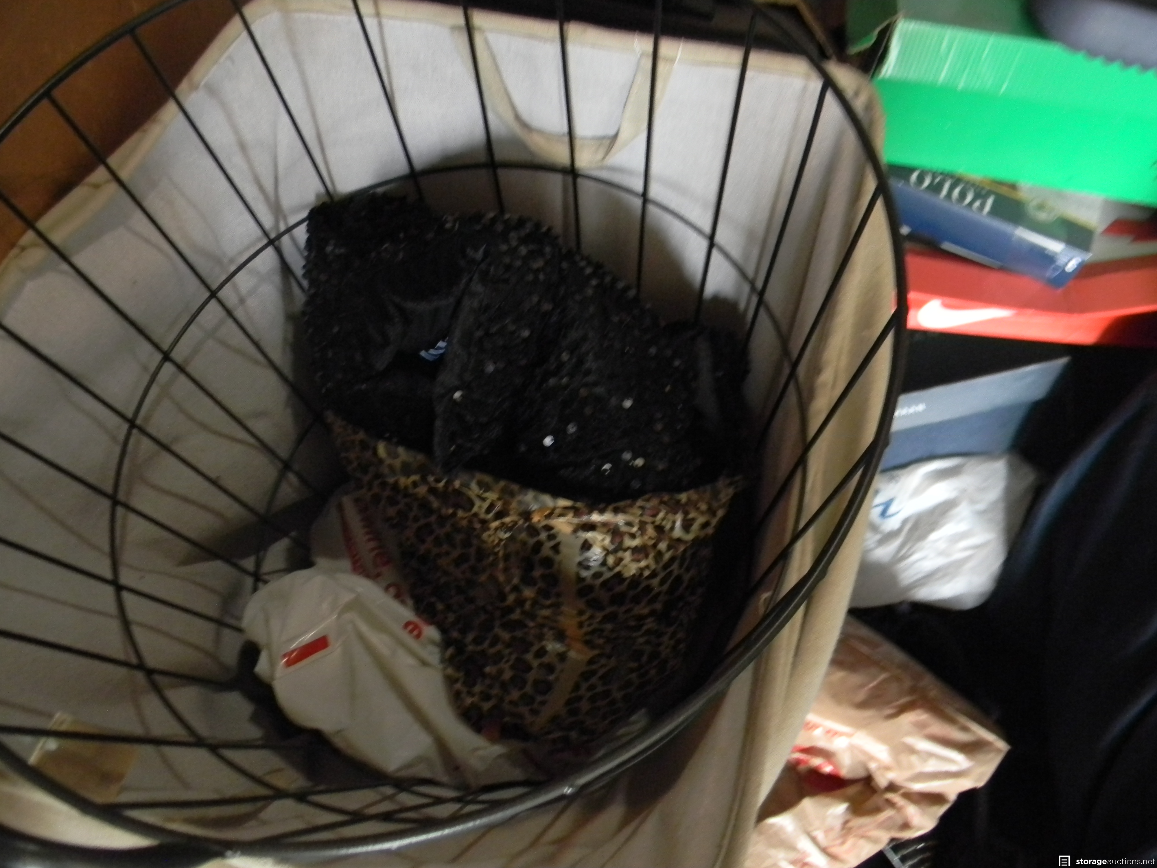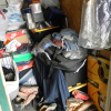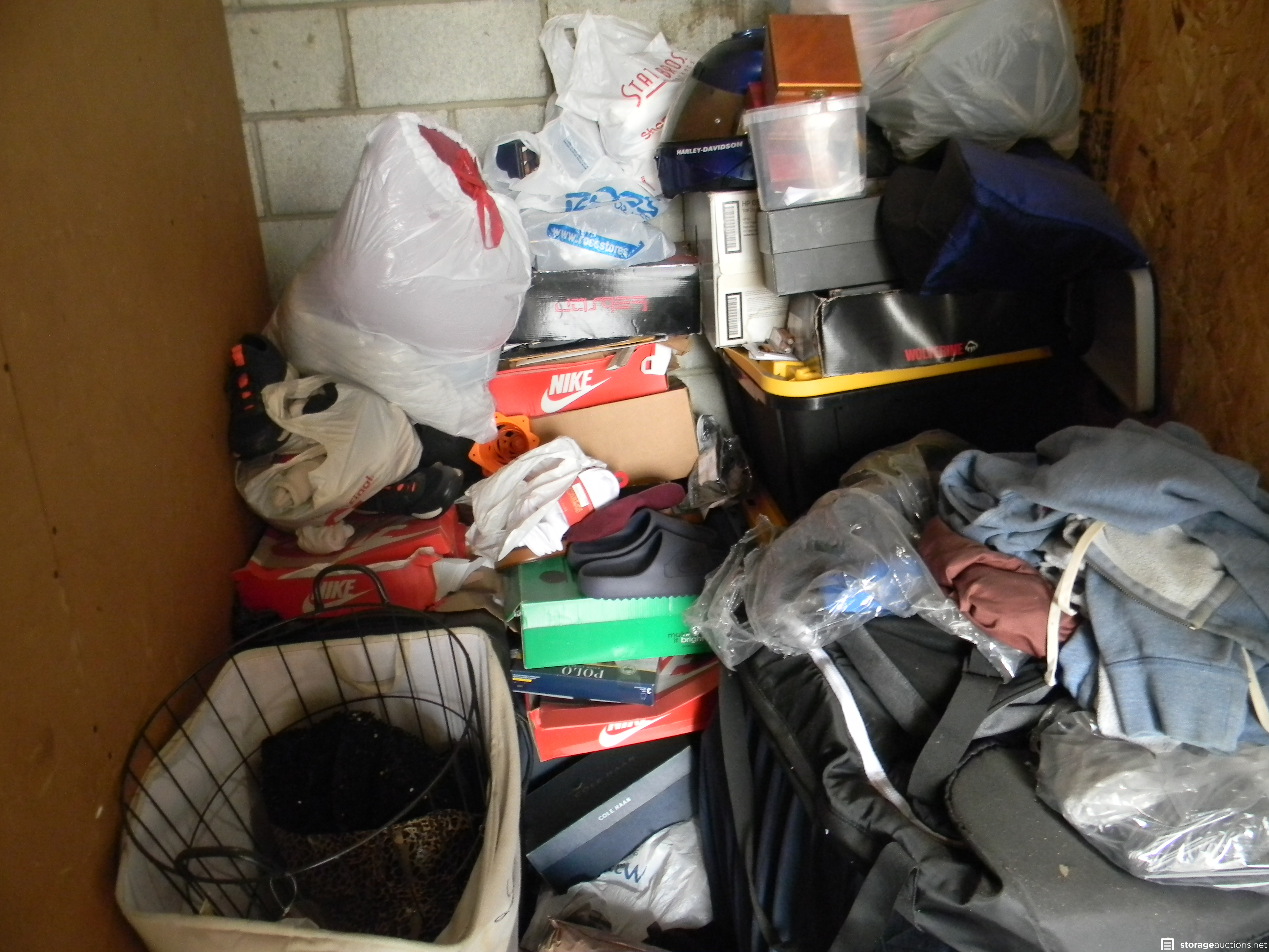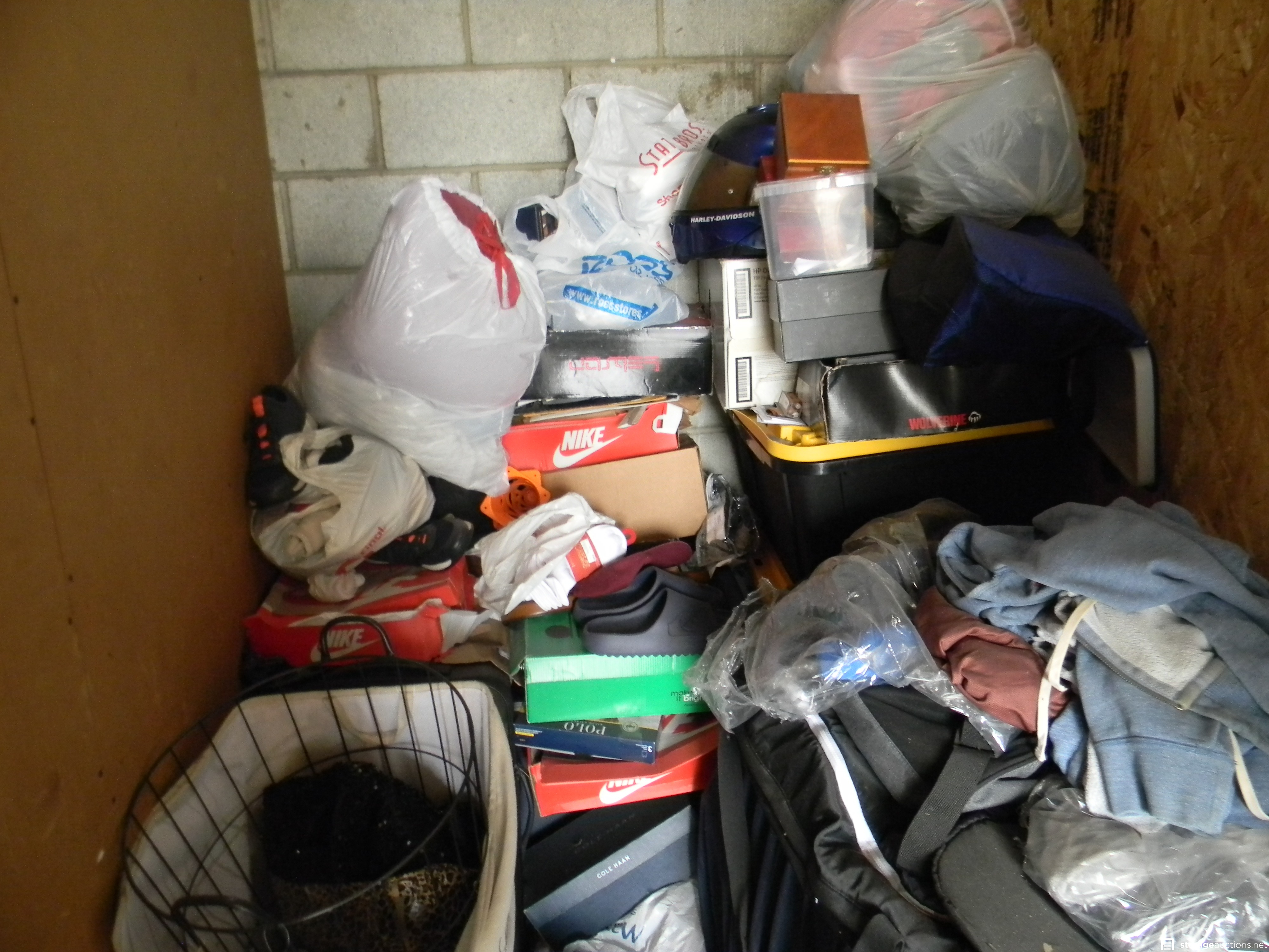 5 PLASTIC TOTES, FIRE LOGS, SHOES, SHOE BOXES, MISC. CLOTHING, MOTORCYCLE HELMET, 4 PLASTIC BAGS, SUITCASE, JEWELRY BOX, AND A LAUNDRY BASKET